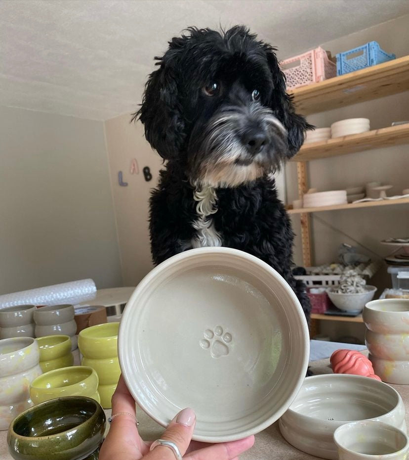 Sara är inte ensam under vårt samtal. Hennes hund Sally — som till och med har ett eget Instagram-konto, @sallyboocockerpoo — dyker upp på skärmen med sin fluffiga, långa svarta päls och tungan hängandes utanför. Sally är dessutom inspirationen bakom en av Saras produkter, en personlig hundskål. "Självklart behövde min Sally en fin hundskål, och det var så jag började skapa dem," säger hon.