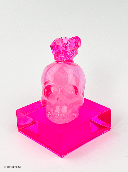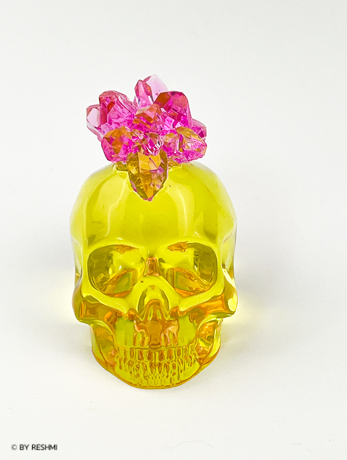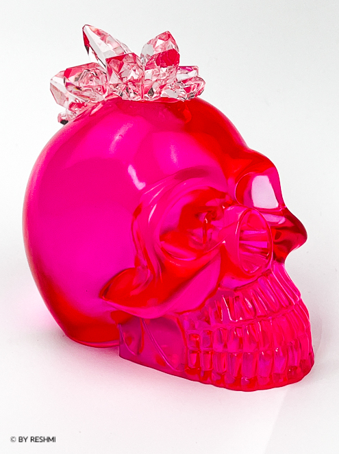 Rebellkonst för orädda själar Carina Reshmi är en självlärd svensk resinskulptör bosatt på Falsterbonäset i södra Sverige och i hjärtat av Berlin. Carina är känd för sina resinskallar med kristallklusterhanekor i starka och livfulla färger. Blandningen av samlarskulpturer och designerpopkonst är ett resultat av ett livslångt sökande efter den andliga sanningen och sanningen om den existerande slutgiltiga döden. Vad är sant och vad är falskt? Lever vi för evigt eller är vi verkligen döda efter att vi dör. Skallen och kristallklusterhanekoren är en motsägelse i sig, skallen för slutgiltig död och kristallkluster för spiritualism och tron att vi alla kommer att leva igen. Tanken ger hopp och hopp är vad vi behöver.