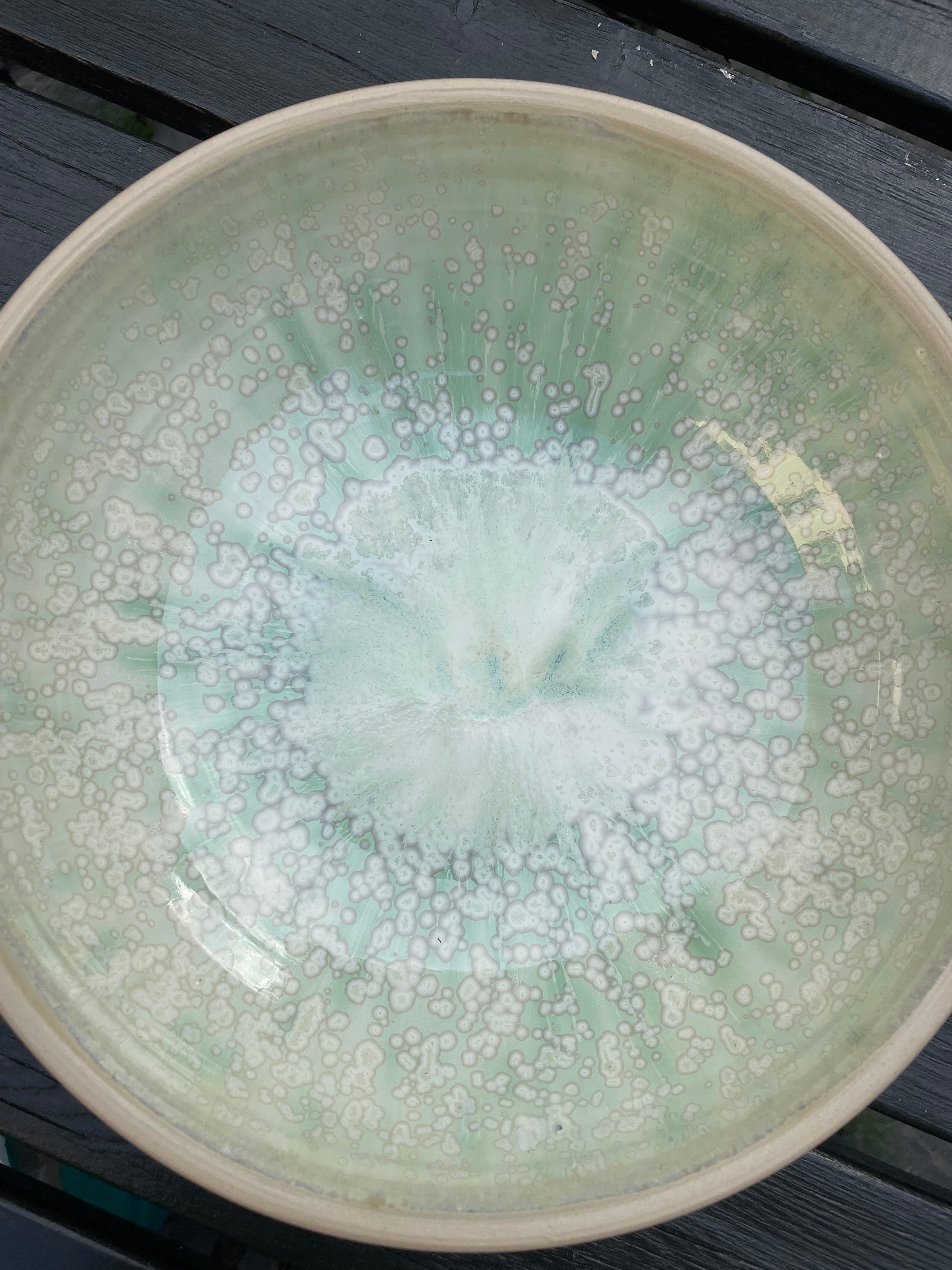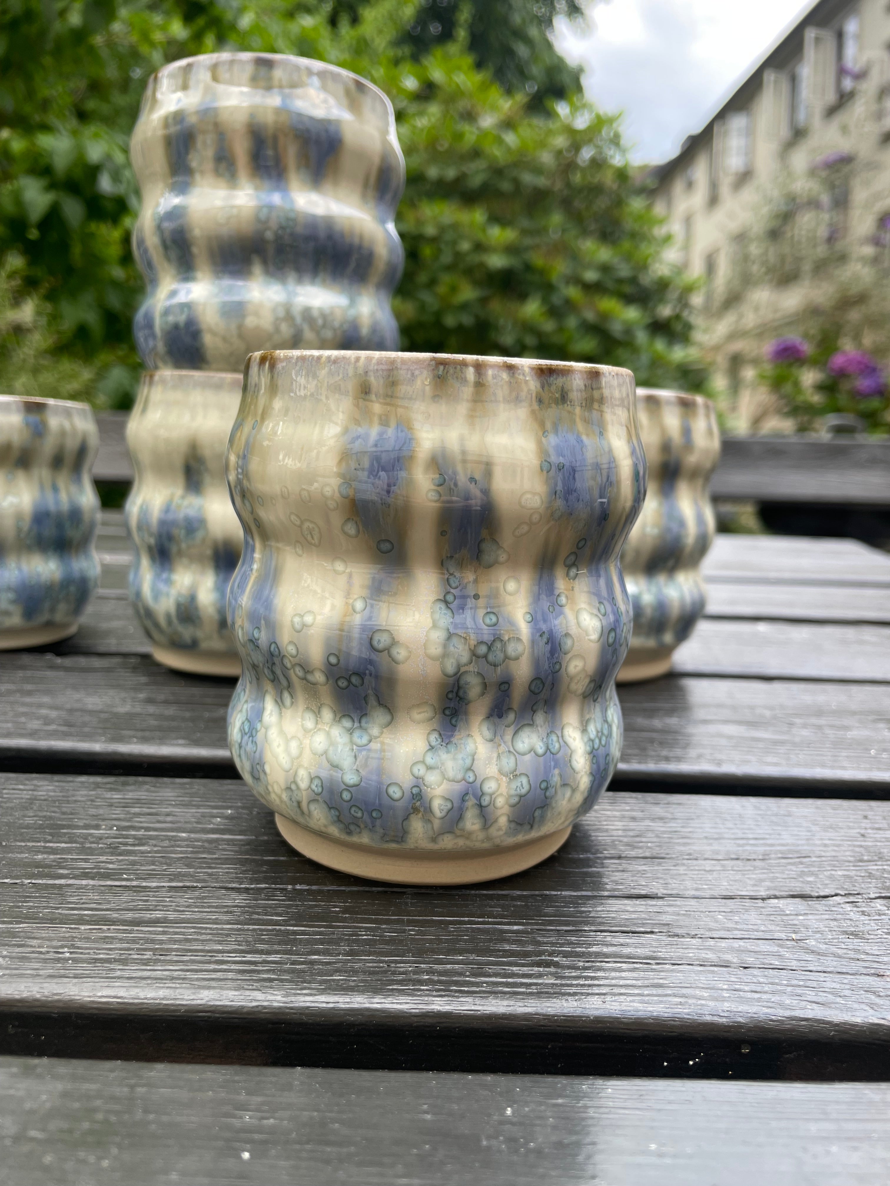 Jag använder stengods eller porslin och drejar allt för hand på drejskivan. Koppar, skålar, vaser etc. Jag använder antingen specifika glasyrkombinationer som blir gröna eller blå eller så dekorerar jag föremålen för hand.