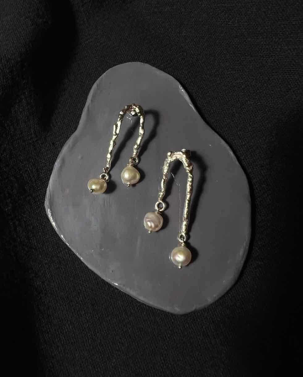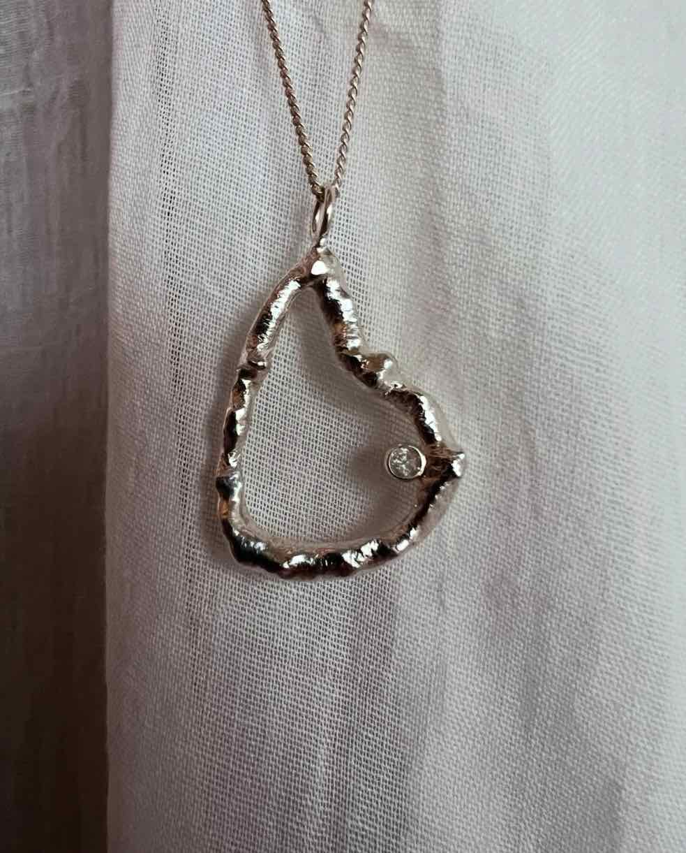 Dessa oregelbundna former kombineras ibland med pärlor och stenar. Jennifer tycker om att balansera råa element med minimalism och skapar kontraster mellan oregelbundna former och rena, klara linjer. Hennes smycken är delvis tillverkade av återvunna material, med stenar och pärlor hämtade från andrahandsmarknaden.