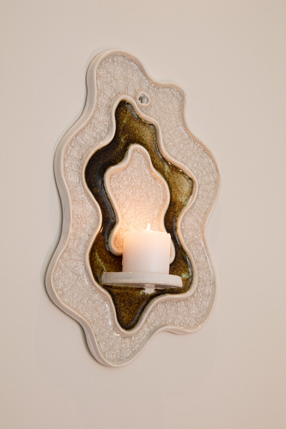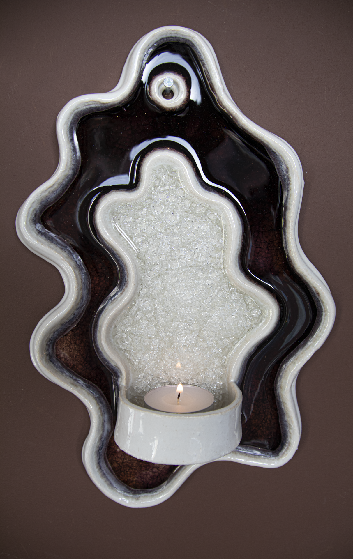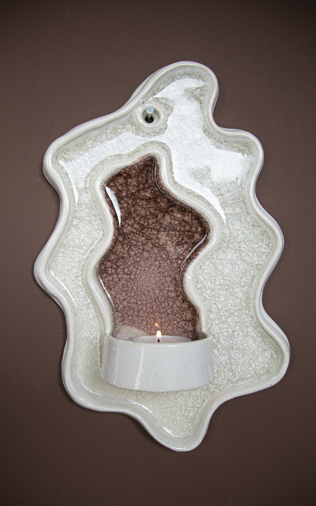 My work combines wall art with candlelight, inspired by the concept of "flow" and the natural movement of life, as well as a tribute to my roots in Finland, known as "the land of a thousand lakes." The shapes of water and its fluid forms are reflected in my designs, with each piece featuring unique patterns of crushed glass and glazes that create a crystal-like finish.
