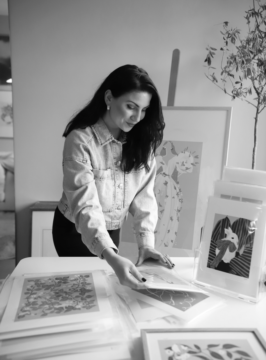 Hej, jag heter Emma Älveus och jag är så glad att du hittade mig och mitt arbete. Jag bor i Sverige och arbetar som illustratör och Art Director. Jag bara älskar att rita och min stil är en kombination av akvarell och digital teckning. Oftast målar jag utan en plan och låter bara handen jobba. Mina skissböcker är fyllda med modeillustrationer, mönster och blommor – ett tema som har funnits med mig sedan jag köpte min allra första skissbok efter examen.