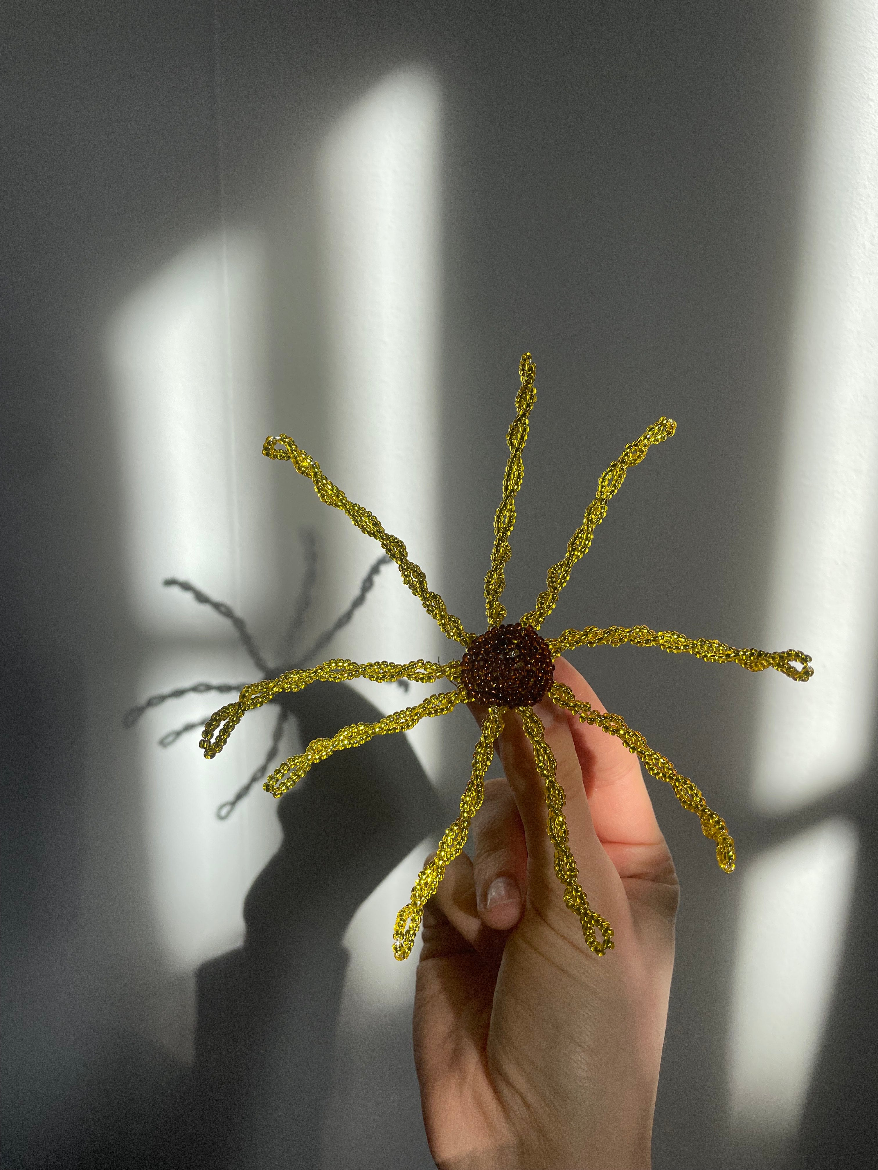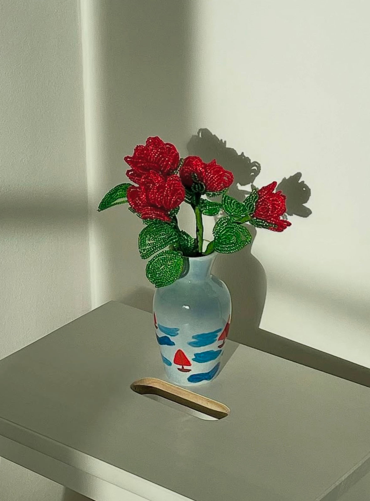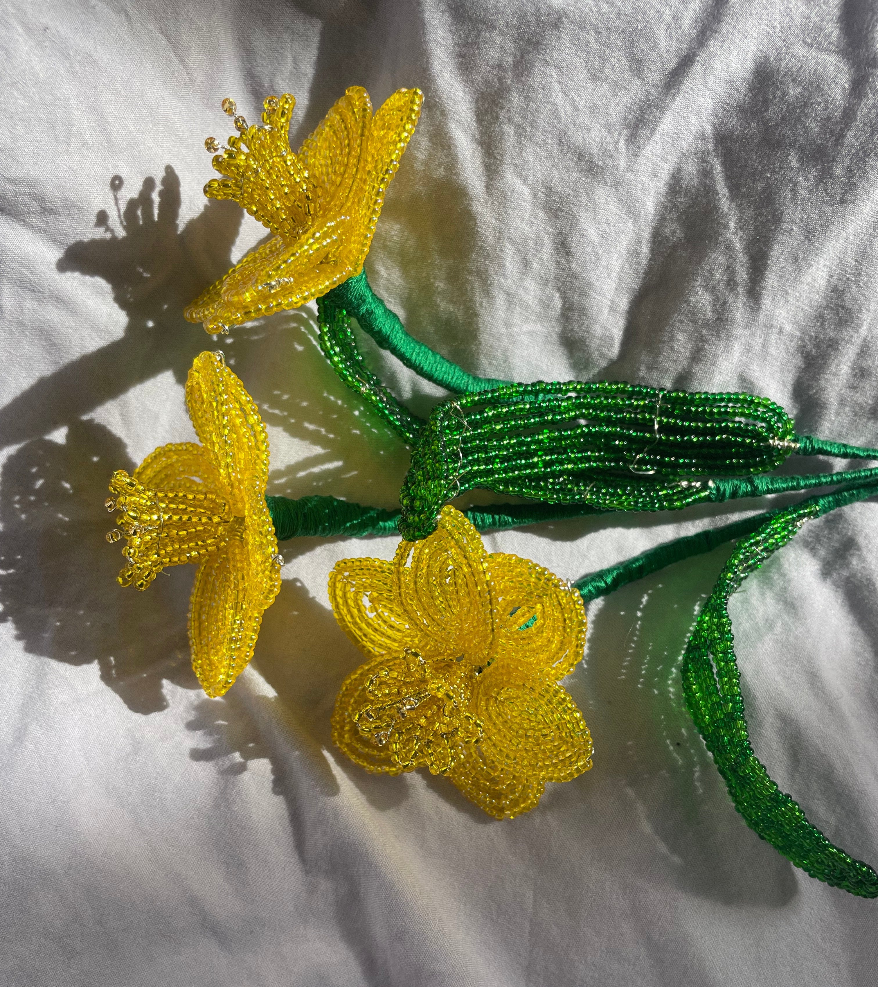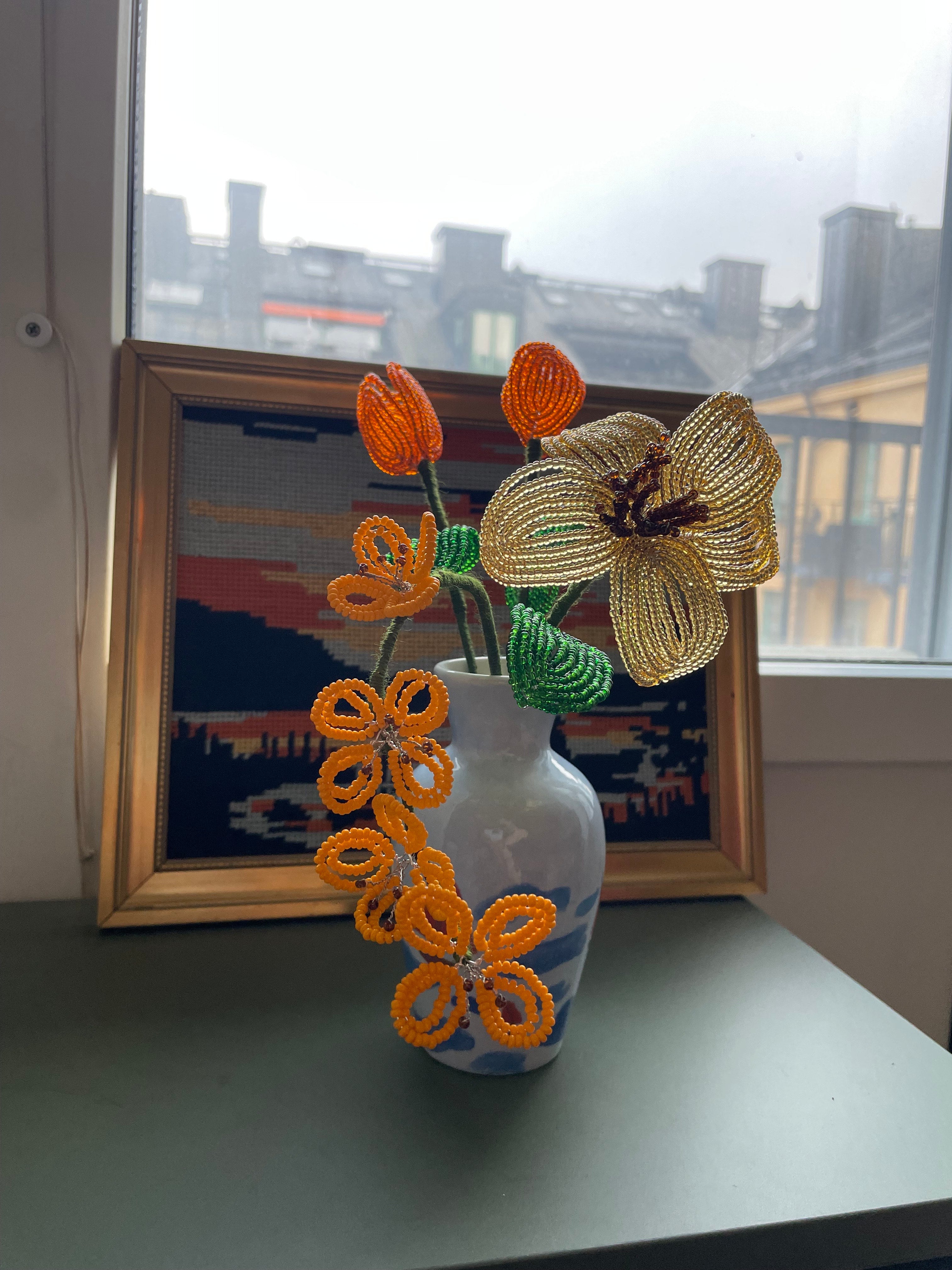 På min soffa i min studioetta i Stockholm skapar jag mina pärlblommor. Det är ett rogivande sätt att uttrycka min kreativitet. Som fysioterapistudent består mina dagar oftast av studier, träning och ibland försök att ta mig tillbaka till min hemstad Göteborg.