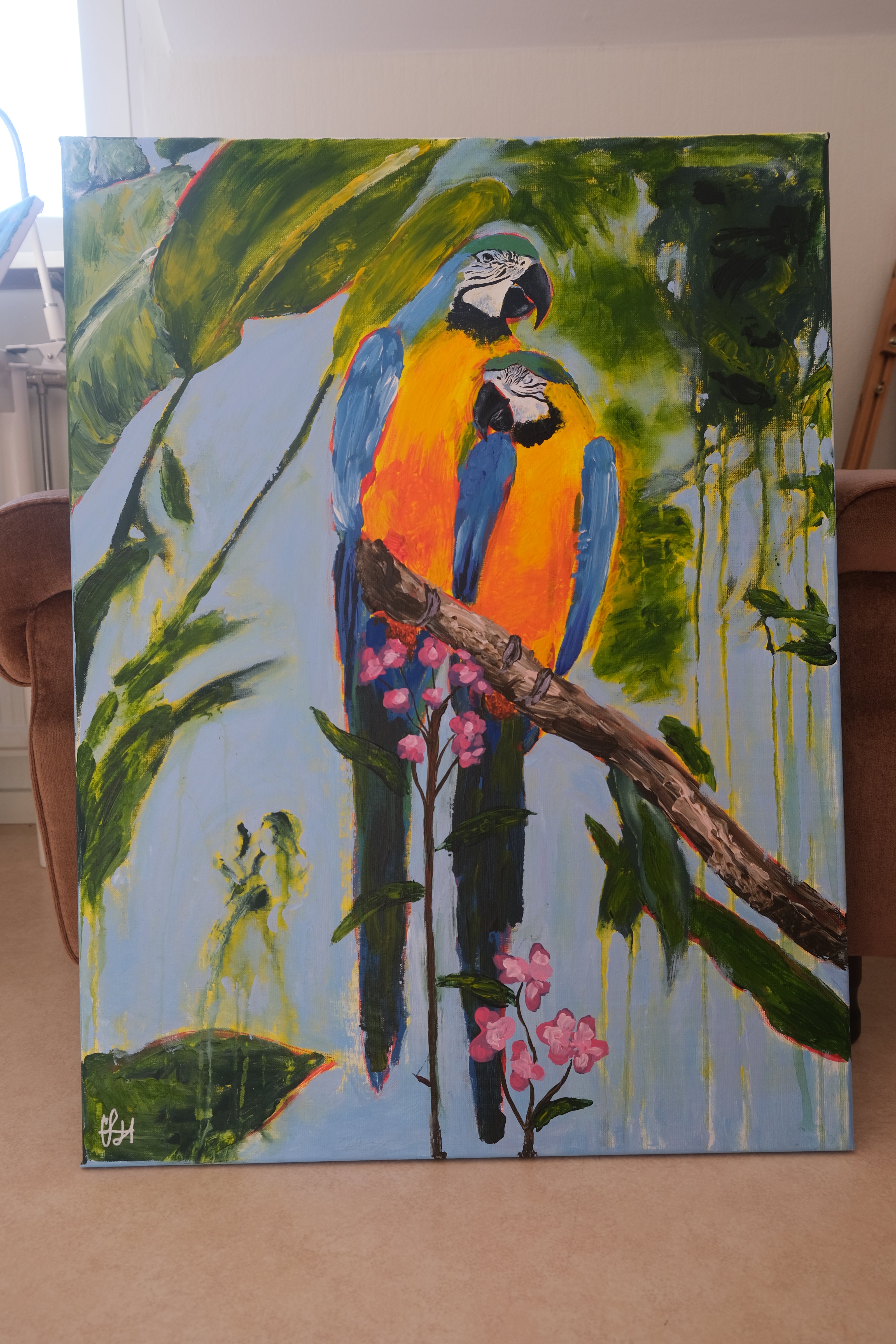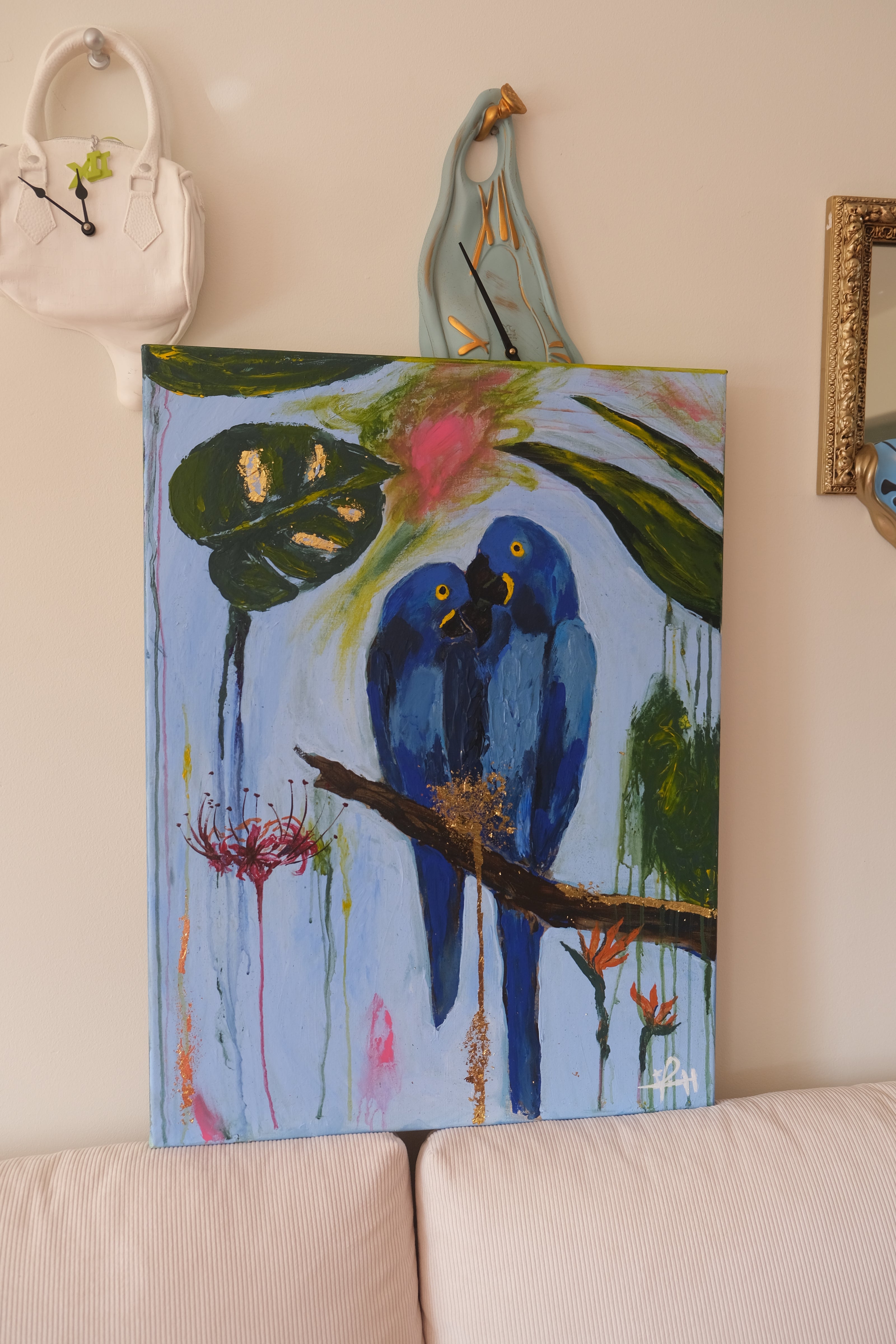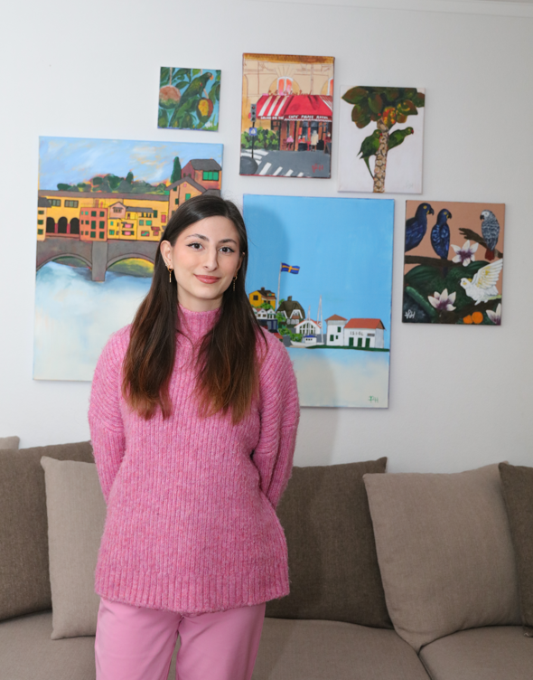 ”Mina favoritverk är de där jag främst använt fingrarna som verktyg istället för penslar, eftersom det känns så personligt och gör skapandet mer direkt och närvarande. Jag målar främst med akrylfärg, men gillar också att experimentera med sprayfärg och pennor för att skapa olika effekter och texturer.”
