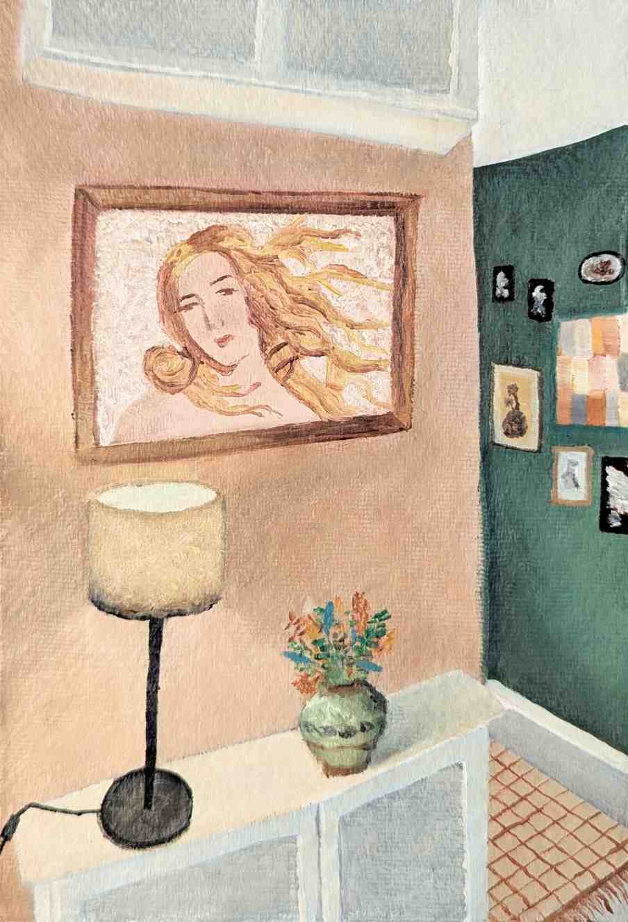 Her current work focuses on warm, colorful still life and interior scenes. Though people rarely appear in her paintings, their presence is felt through the cozy atmosphere created by everyday objects and light. Drawing inspiration from textiles, patterns, and thrifted vintage ceramics, her art celebrates the beauty of simple living — spaces filled with comfort, nostalgia, and a sense of home.