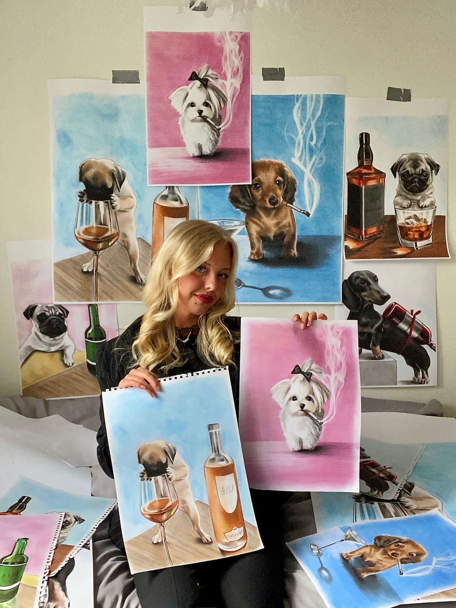 En stor inspirationskälla för mig just nu är hundar. Jag blir så glad av att se gulliga hundar som bara njuter av livet på sitt eget sätt. Det är något med den glädjen i det lilla som jag försöker fånga i min konst – de små gyllene ögonblicken i vardagen, helt enkelt.