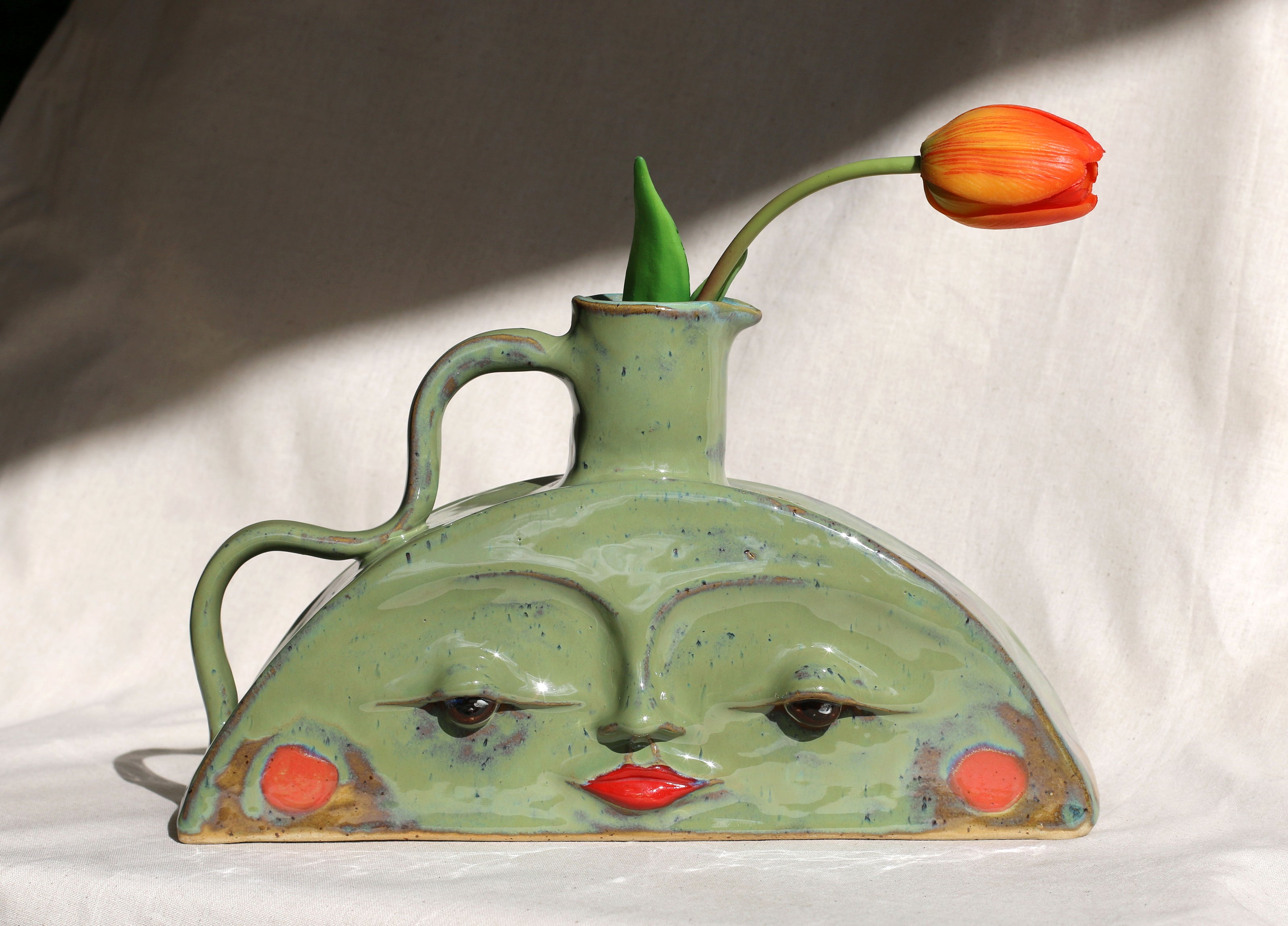 Stor vas med handtag, kanna, ansikte - Spräcklig stengods