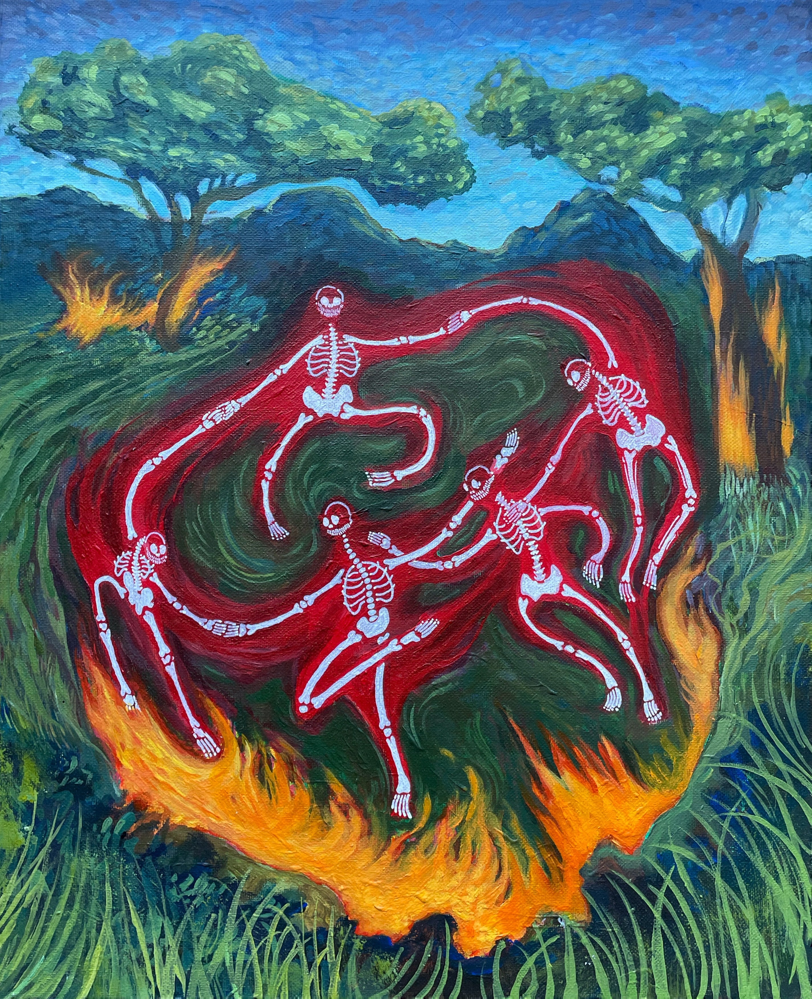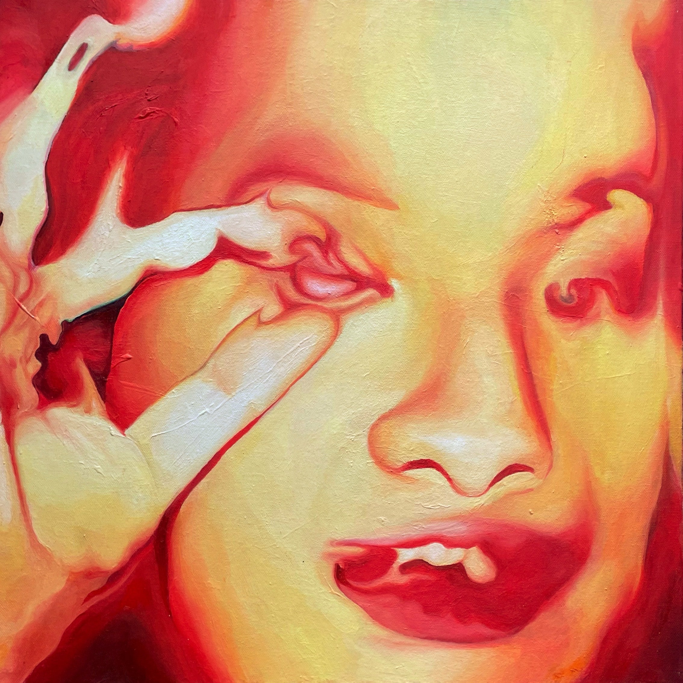 Jag är en målare som navigerar i utrymmet mellan det verkliga och det abstrakta. Mitt arbete drivs av ljus, känslor och förvrängning, och har ofta livfulla röda och gula nyanser som blöder in i huden och skapar en surrealistisk, överexponerad glöd.