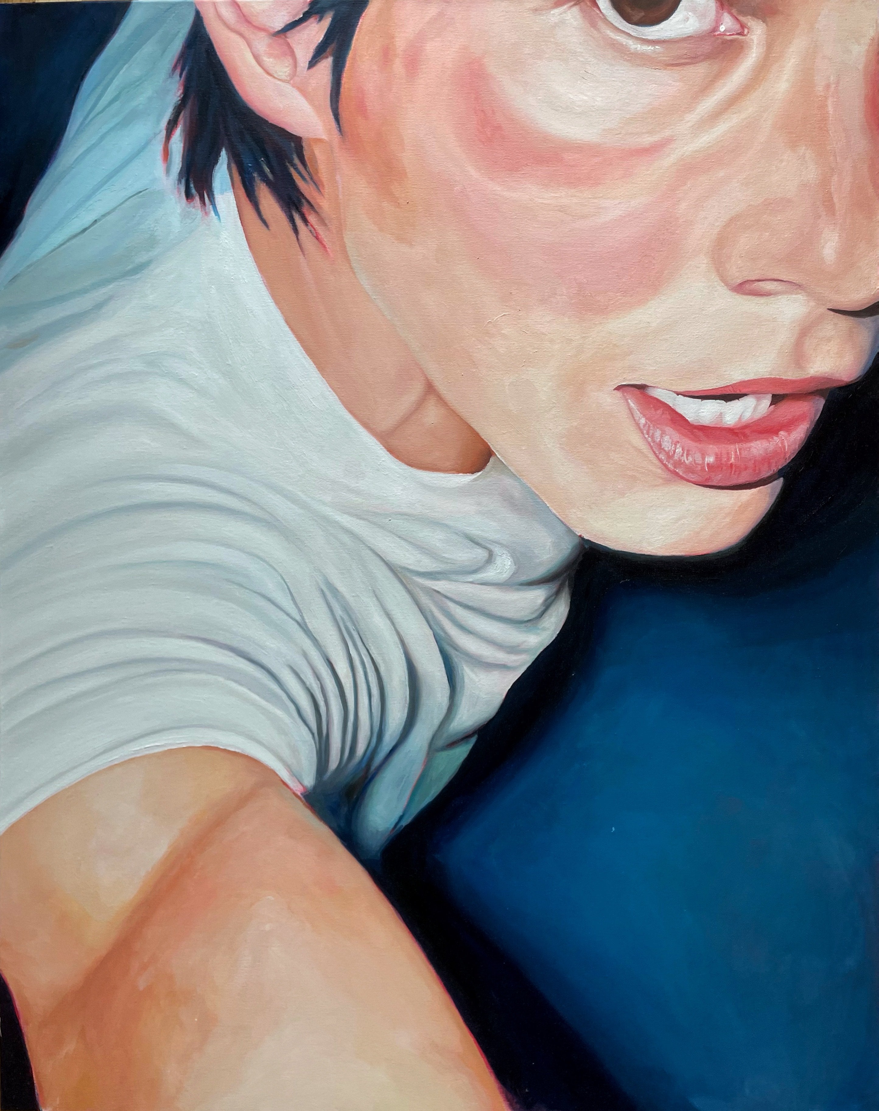 Mycket av min inspiration kommer från blixtfotografering och ögonblick av känslomässig intensitet. Jag använder oljefärg för att utforska sårbarhet, intimitet och den märkliga skönheten i att bli sedd.