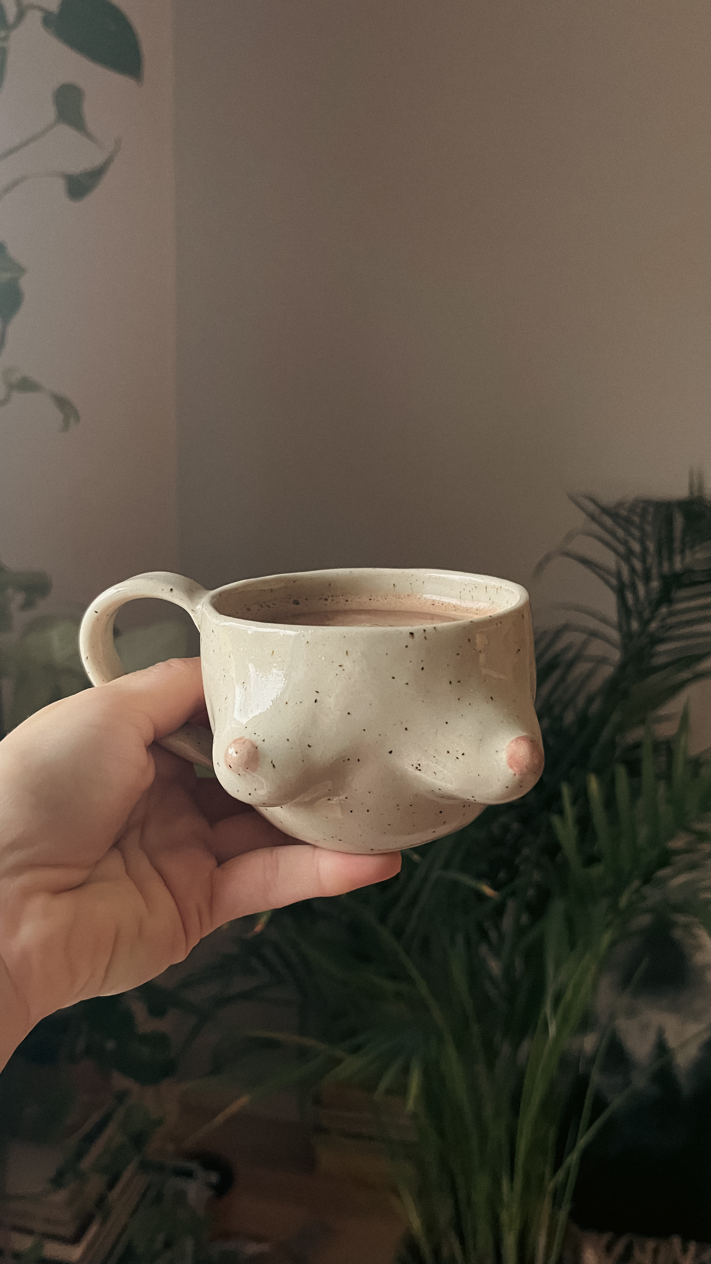Speckled beige mug with a handle