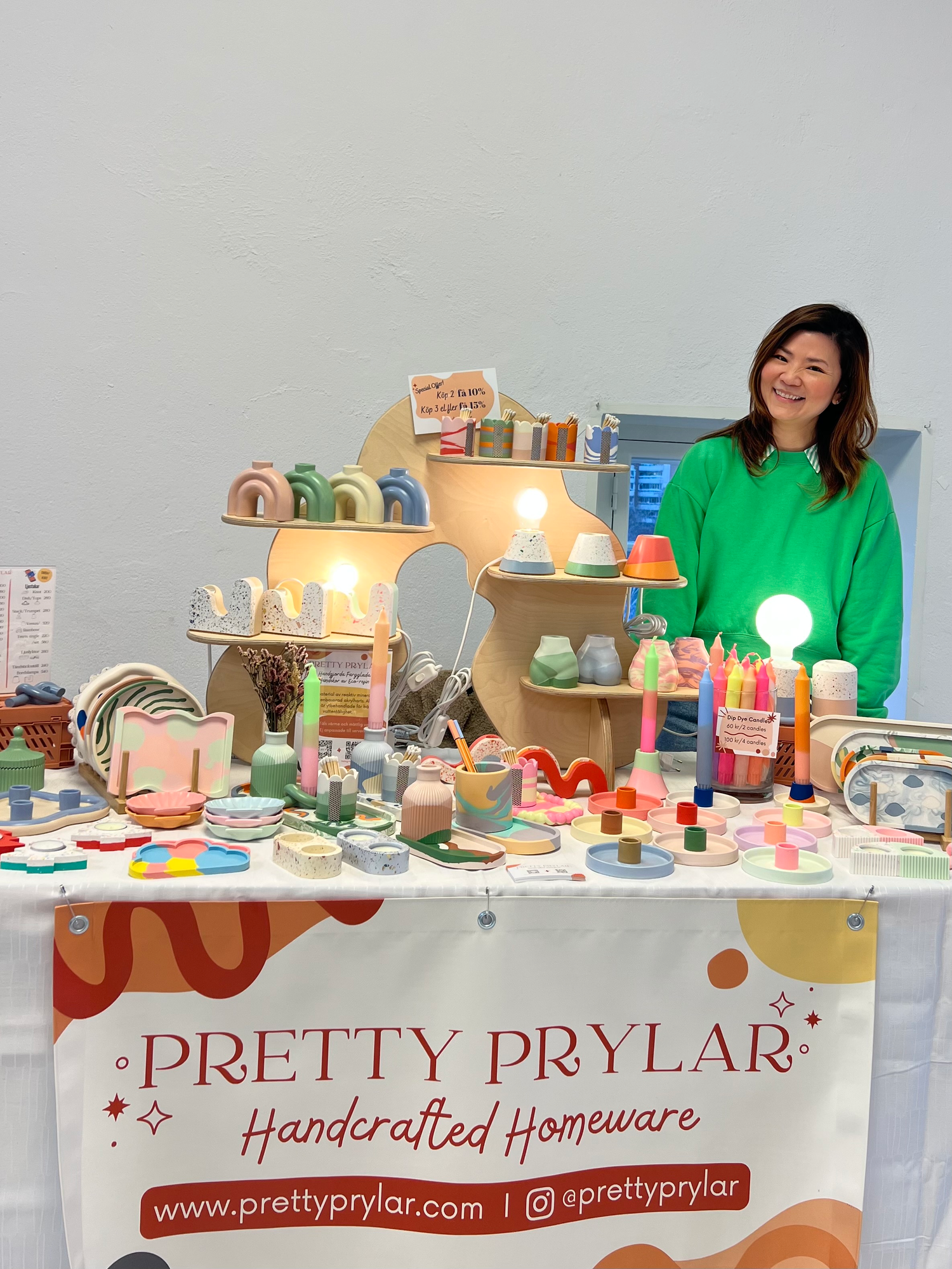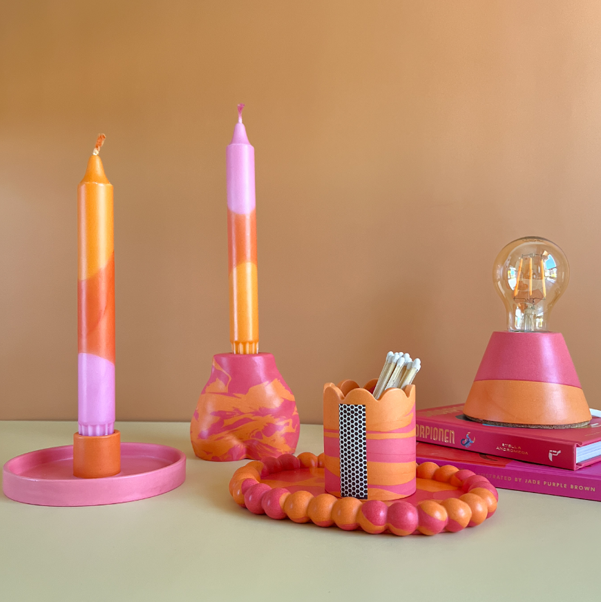 Nicha startade Pretty Prylar i hopp om att föra in lekfulla färger och personlighet i vardagens rum. Nicha skapar rolig, handgjord heminredning med hjälp av eco-resin – tänk vågiga ljushållare, terrazzo-brickor och färgglada detaljer som lyser upp vilket rum som helst. Hon handdoppade även ljus i djärva, glada färgkombinationer som matchar. Hennes stil handlar om färgblockering, udda former och att blanda nyanser du inte förväntar dig – men som ändå fungerar perfekt. Hennes inspiration? Energin från Bangkok, staden där hon växte upp. Med sitt pulserande gatuliv, lager på lager av texturer och färgstarka paletter runt varje hörn lärde Bangkok henne att mer är mer – och att färg höjer humöret.