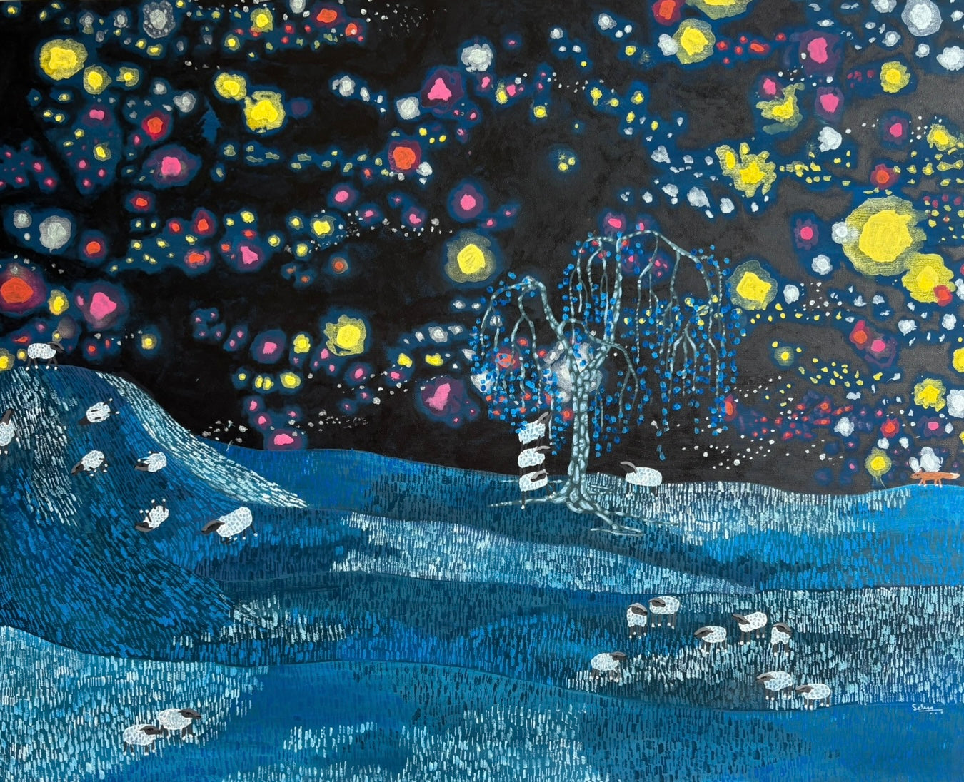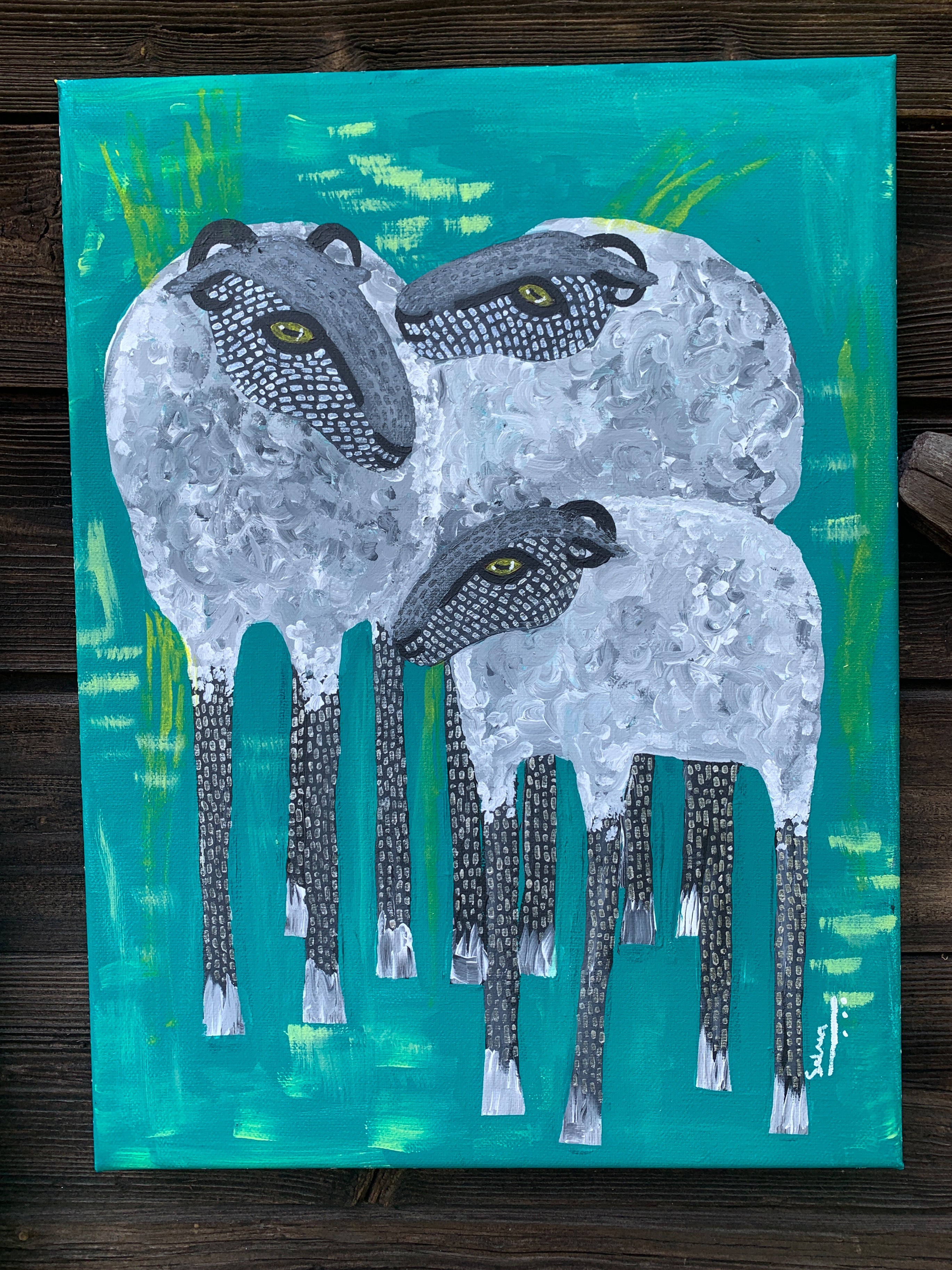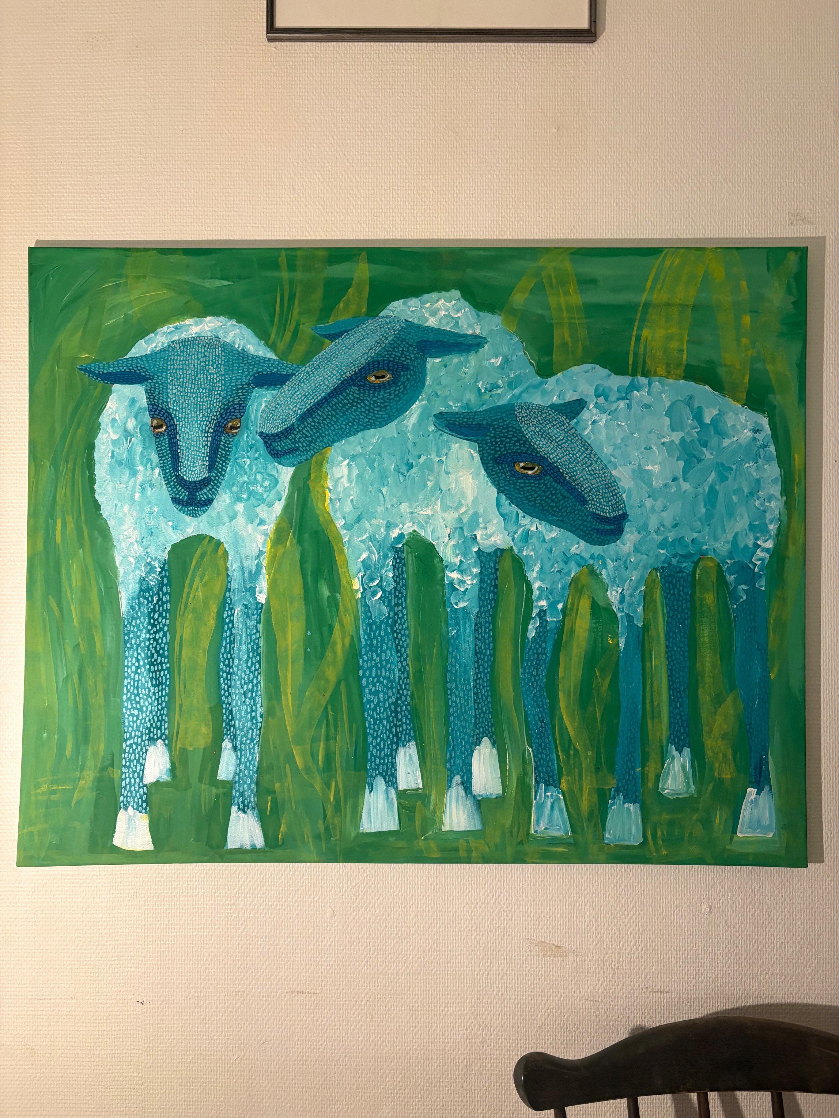 Fåren kom in i mitt arbete av en slump. En dag var min bror och jag ute och simmade, och han stannade för att titta på fåren. De klättrade på varandra för att nå löven på ett träd. Det var kaotiskt, fånigt och oväntat vackert. Jag började måla dem i drömska landskap, och de har stannat kvar.