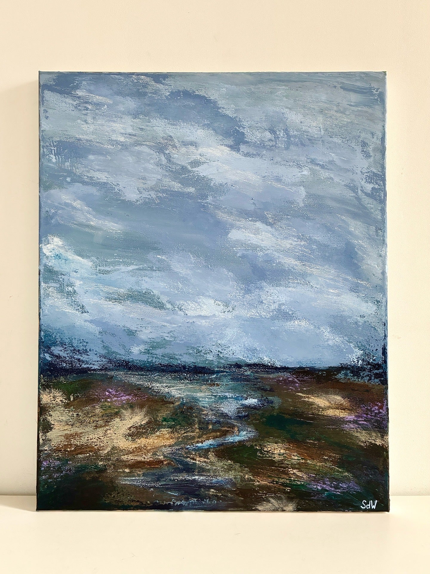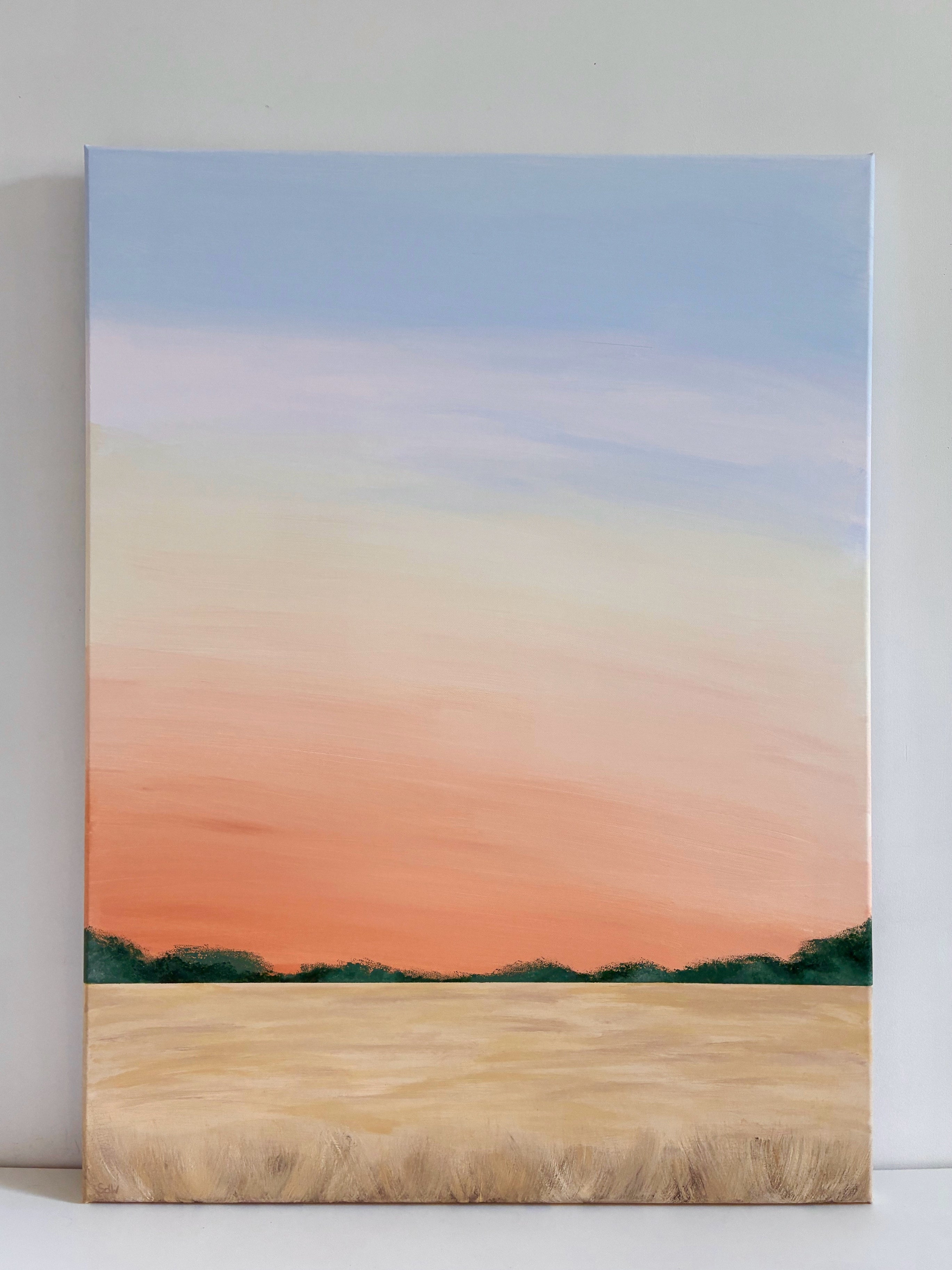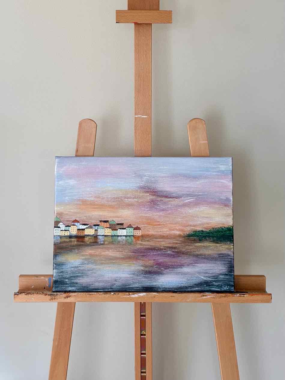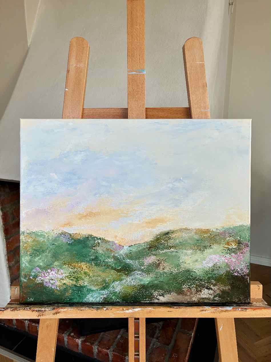 Jag håller fortfarande på att hitta min identitet inom måleriet, men jag målar med akrylfärger och lägger ibland till några inslag av oljepastell. Jag dras till pastellfärger och jag tycker om att måla semi-abstrakta landskap med söta små detaljer.