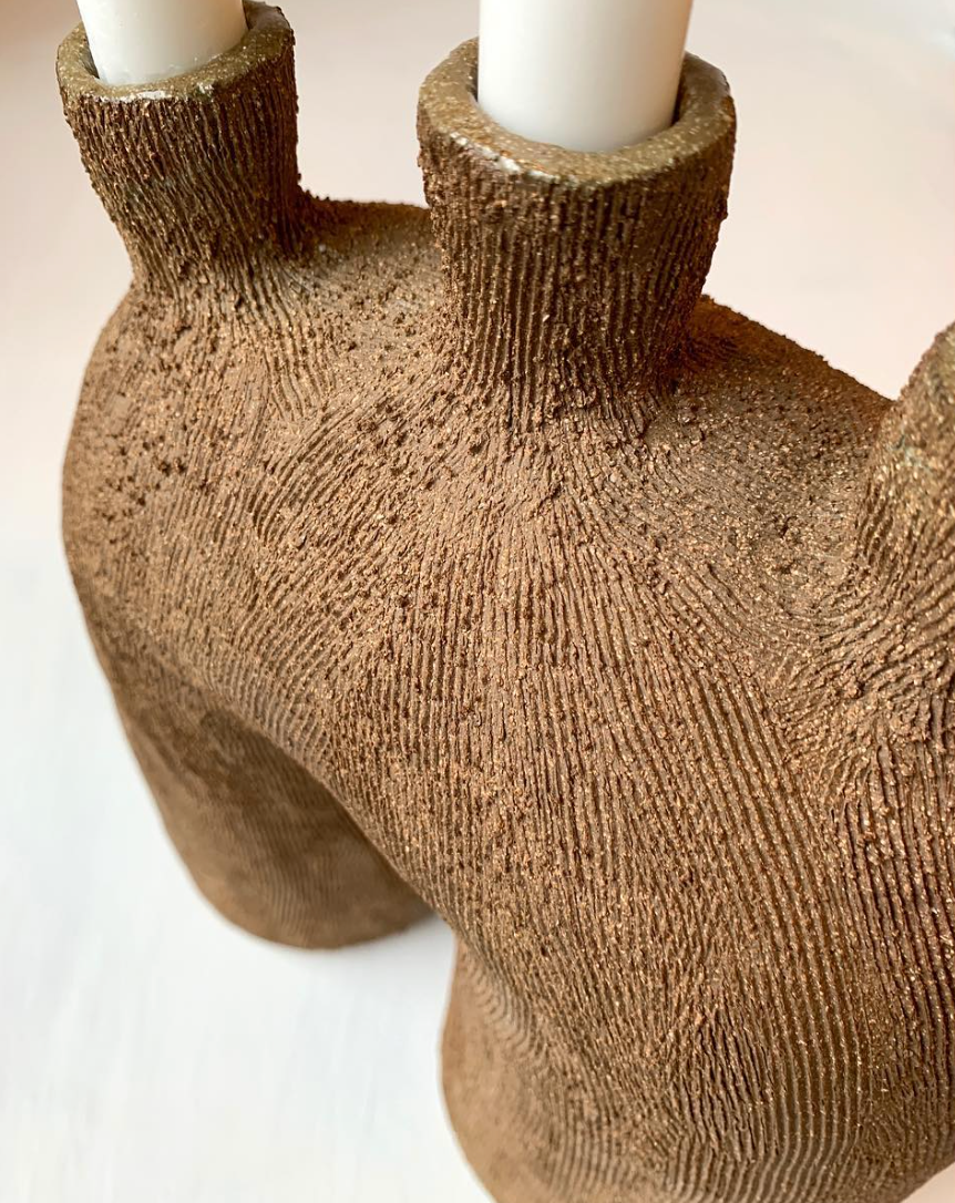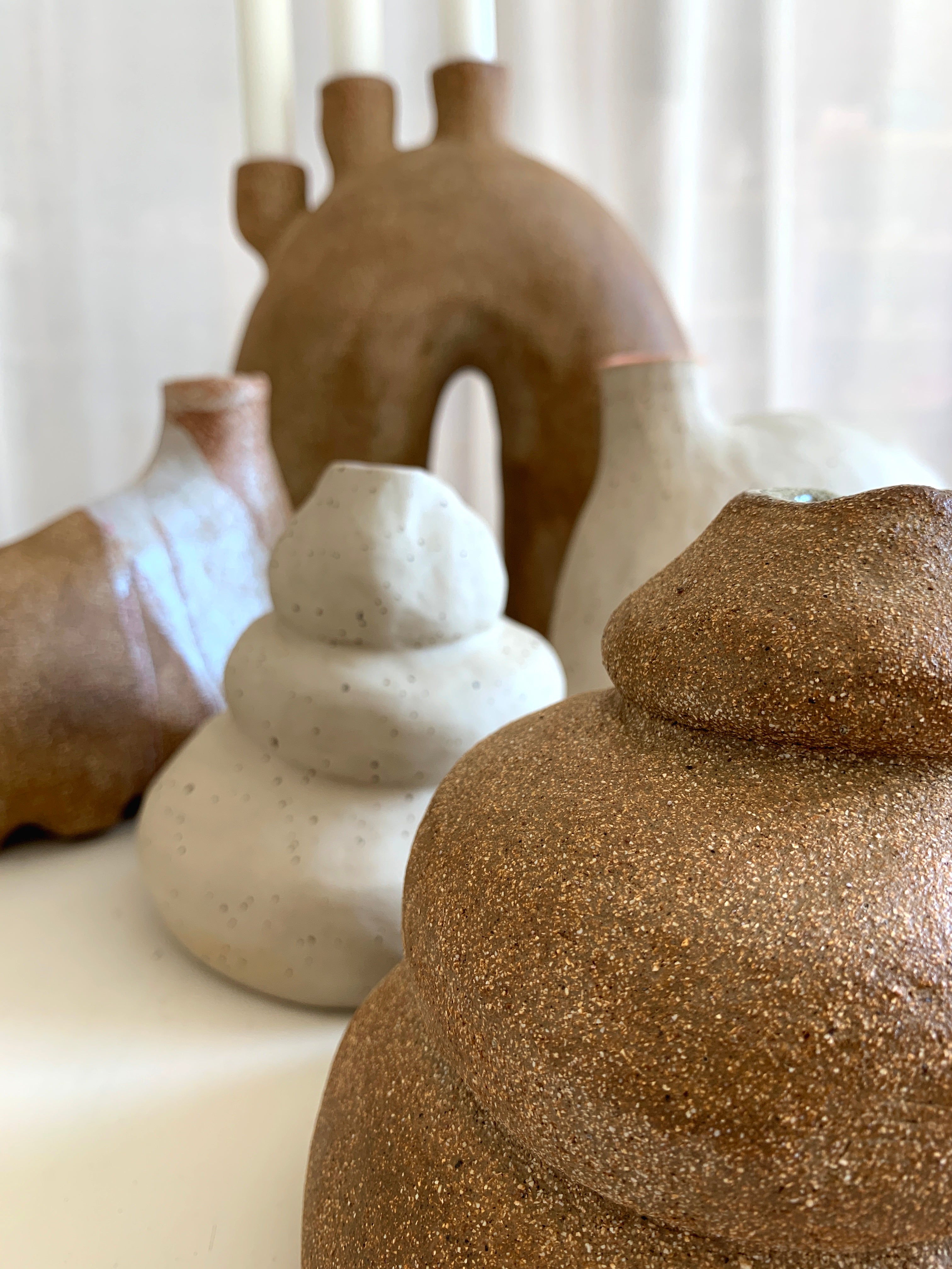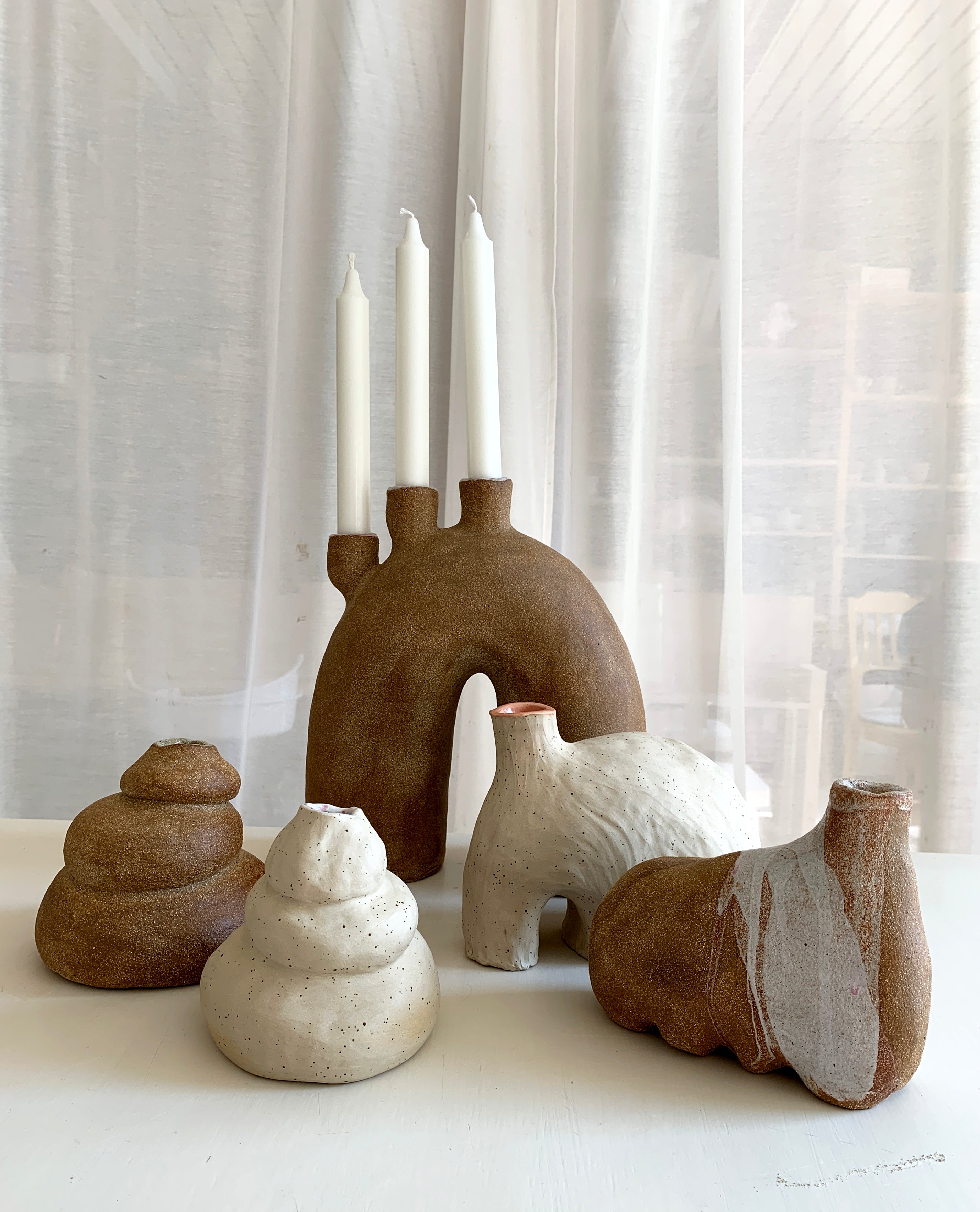 Sofia älskar lera som material för dess taktilitet och formbarhet. Hon lämnar ofta delar av ytan oglaserad, vilket skapar en vacker kontrast mellan den råa, brända leran och den glansiga glaserade ytan. Hennes konstnärliga språk är ibland strikt, men andra gånger helt organiskt, och hämtar inspiration från djur och natur. Det är denna organiska och kroppsliga aspekt som inspirerade hennes kollektion av fyra vaser och en ljusstake för Cay collective våren 2023.