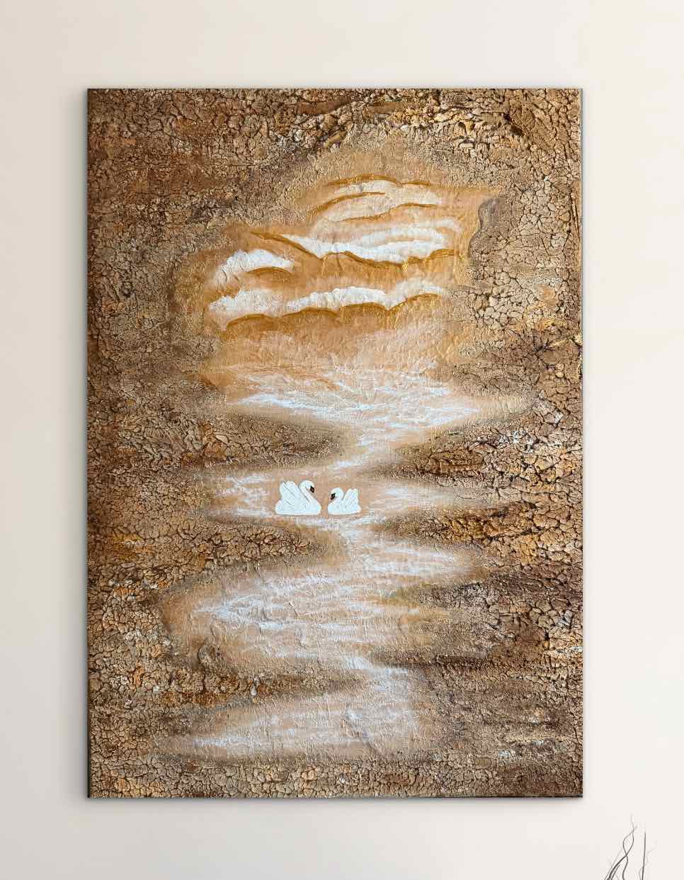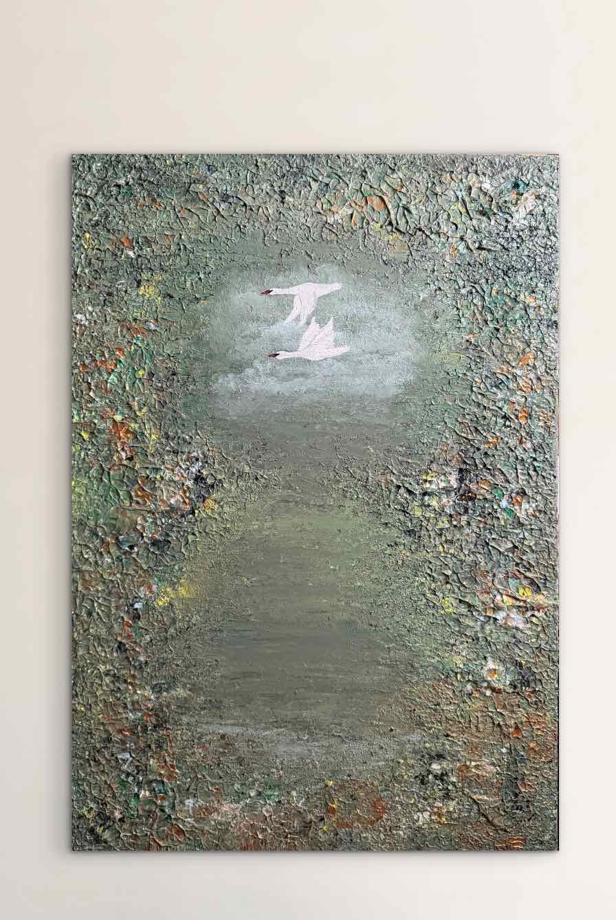Jag hämtar inspiration från den otämjda naturliga världen — vittrad jord, sprucken sten och dramatiska ljusskiftningar. De kraftigt texturerade kanterna ramar ofta in en mjukare, mer reflekterande central yta. När det förekommer fungerar svanens återkommande motiv som ett ankare av frid och orubblig kärlek inom det emotionella landskapet.