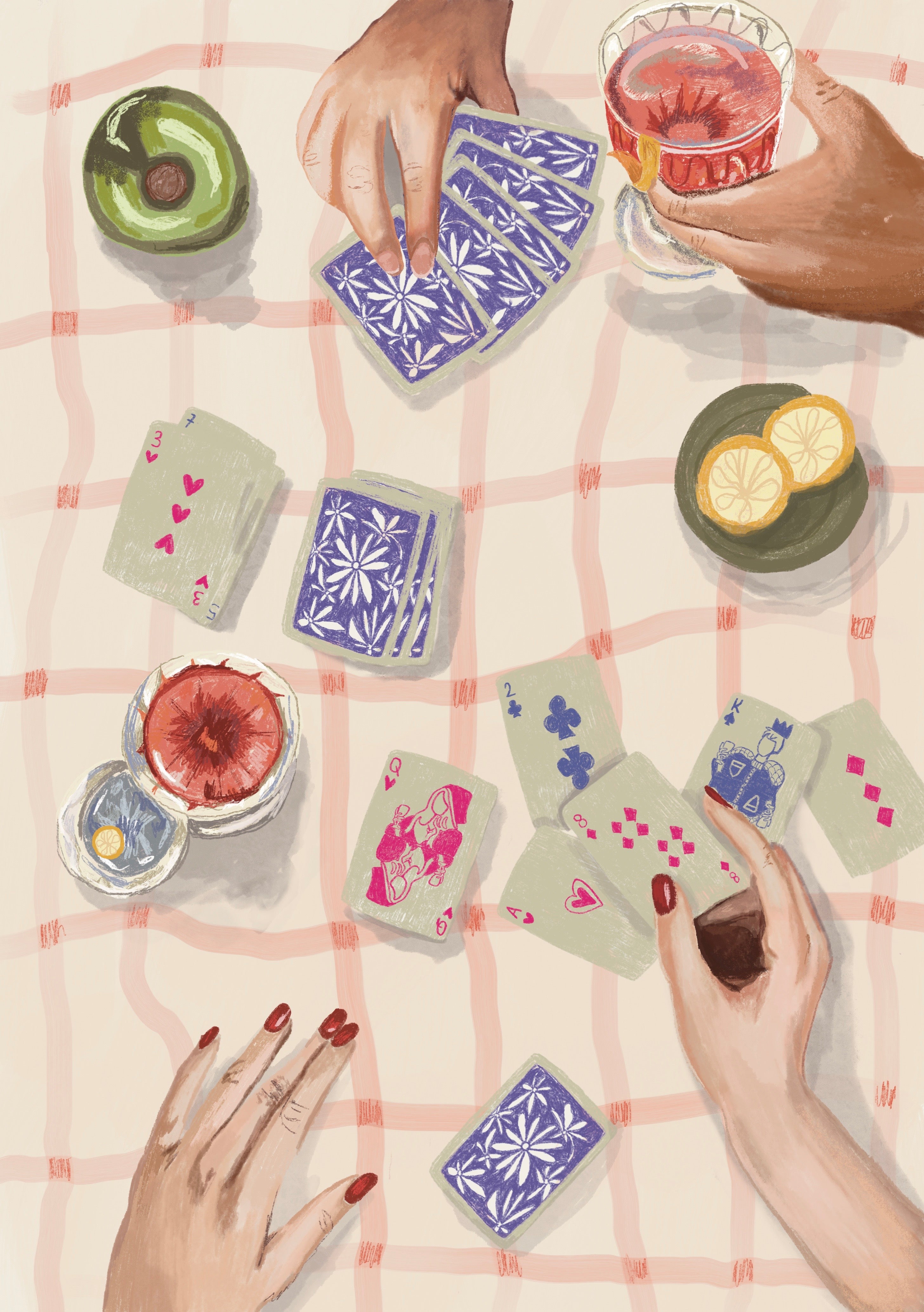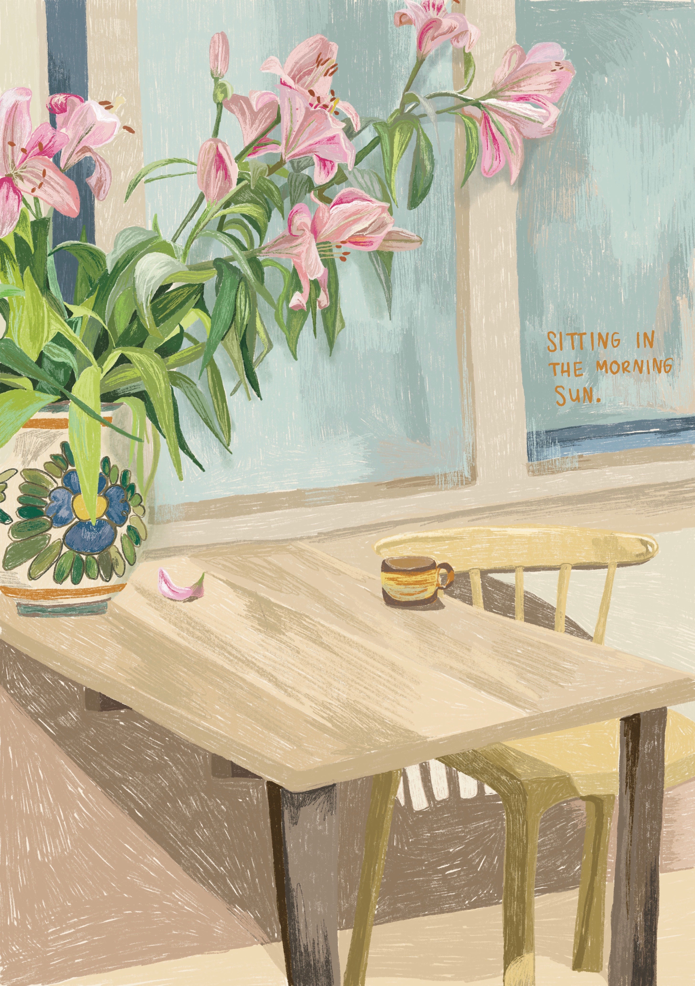 Mina verk är mest inspirerade av små glädjestunder i vardagen. Jag älskar att fånga dessa små stunder av glädje, eller "het kleine geluk" som vi säger på holländska, genom digitala illustrationer såväl som analog fotografering. Solsken, samtal med vänner, blommor, kaffe & sötsaker, ett glas vin, lite god pasta, alla dessa vackra saker.
