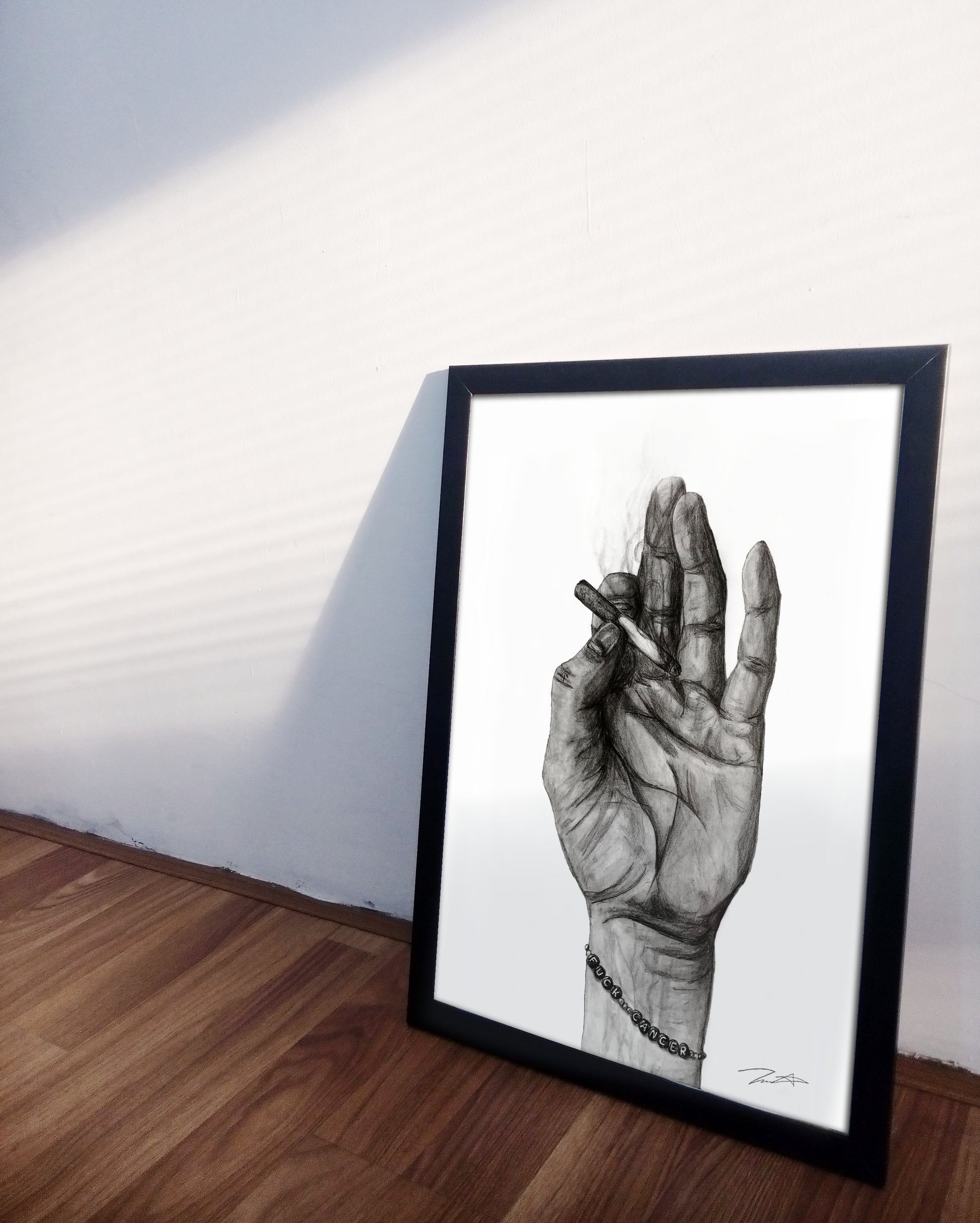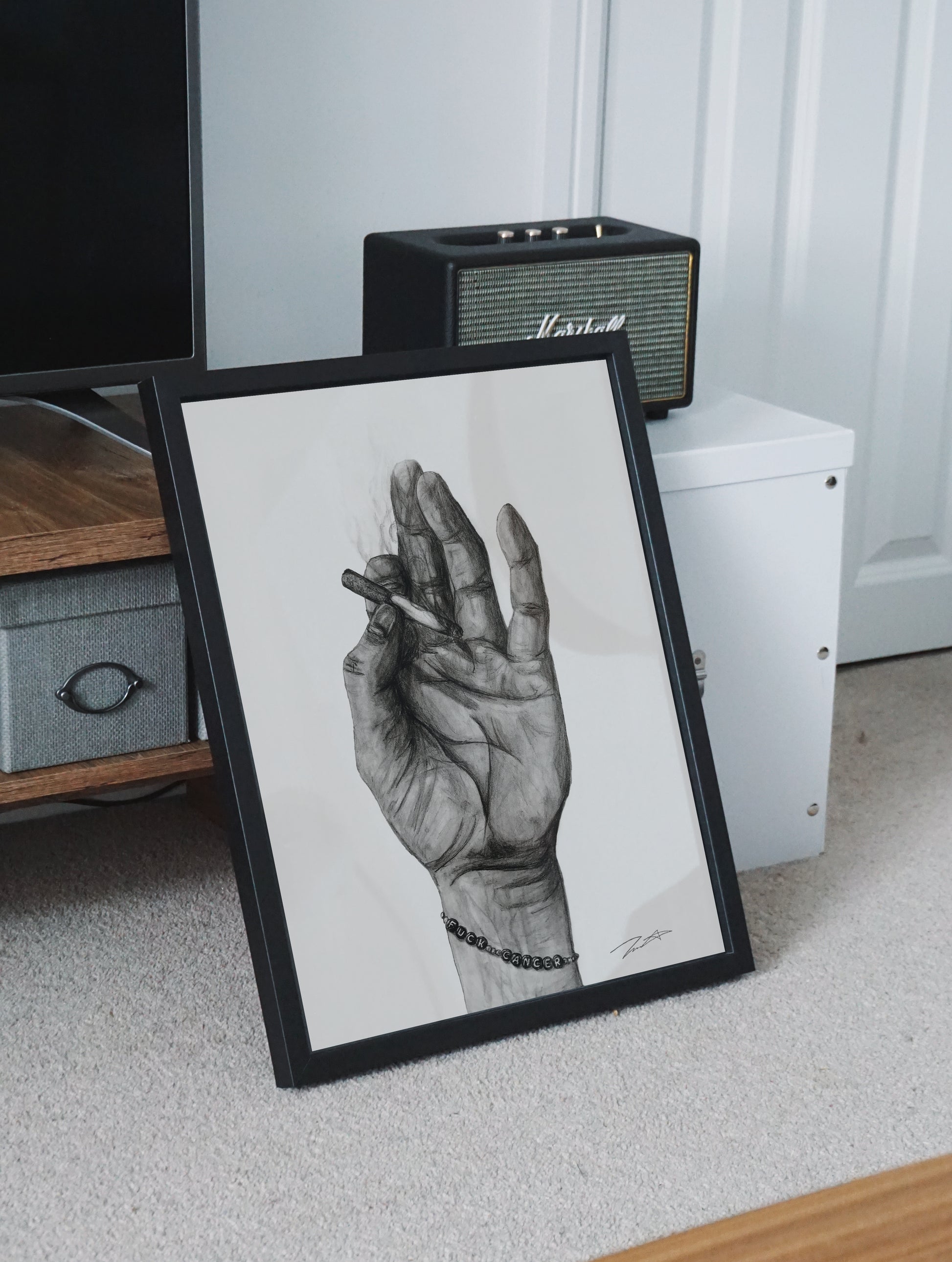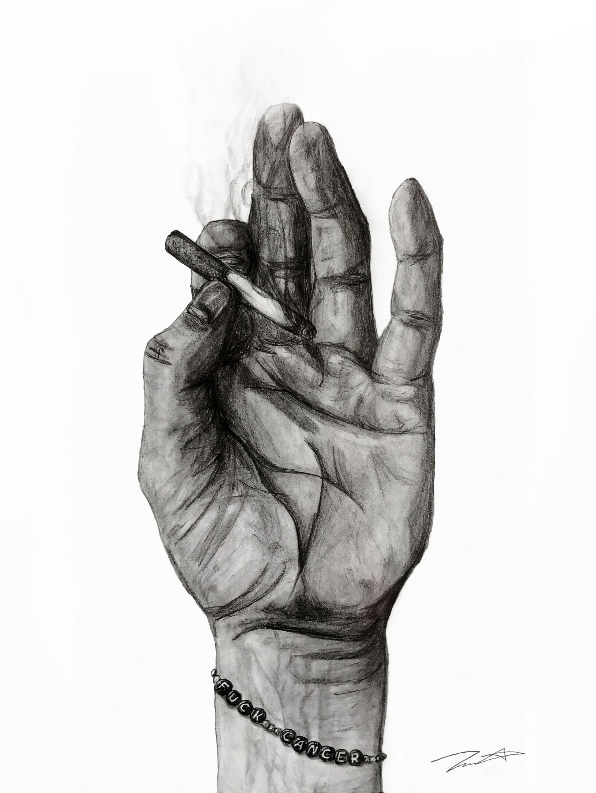 Svartvit hand (vänster) hållandes i en cigarrett och med ett “fuck cancer armband” runt handleden. ‘21st Century’ är en kollektion av tre verk som i form av olika händer symboliserar sociala fenomen som är framträdande i 2000-talets samhälle.