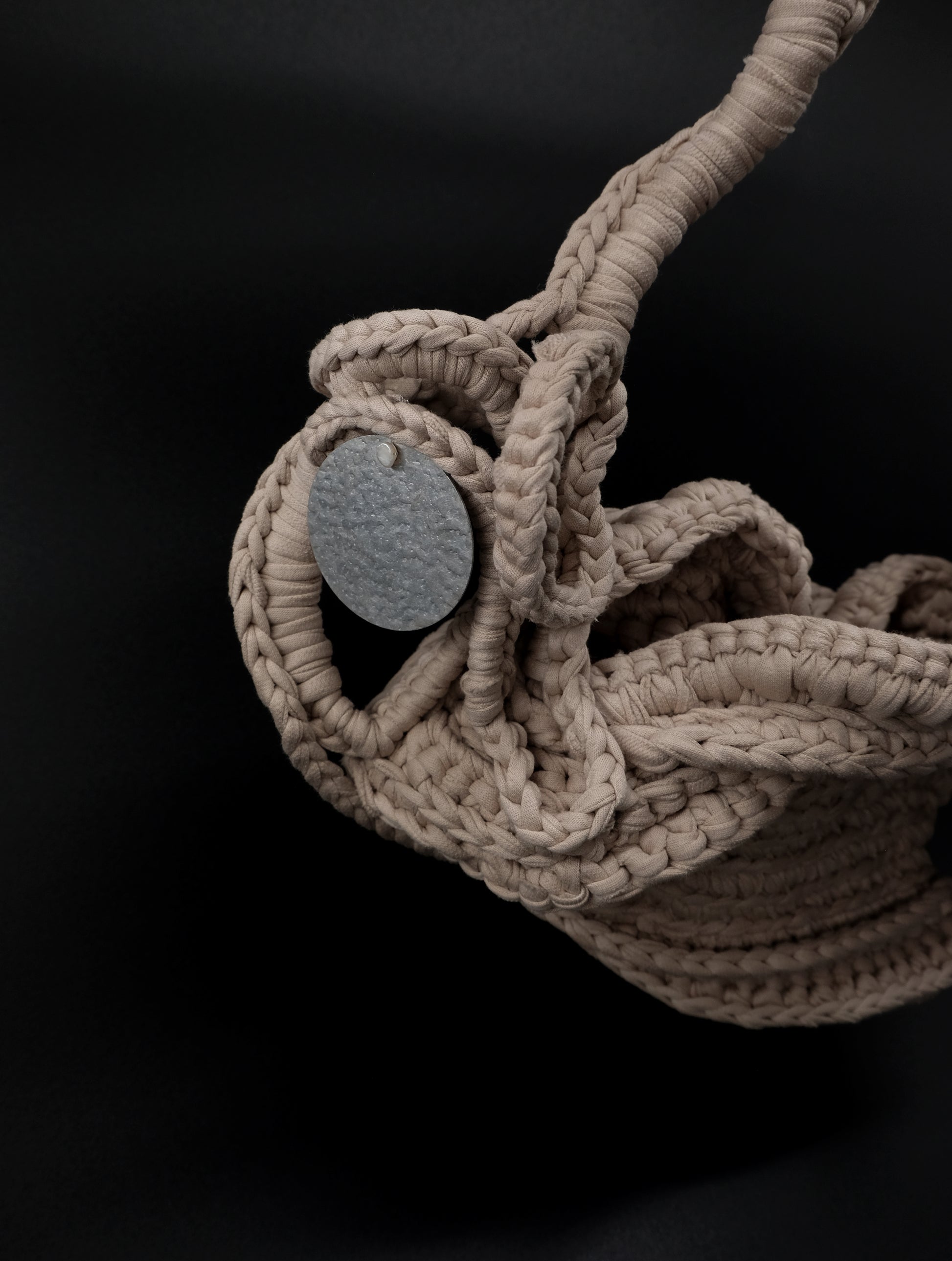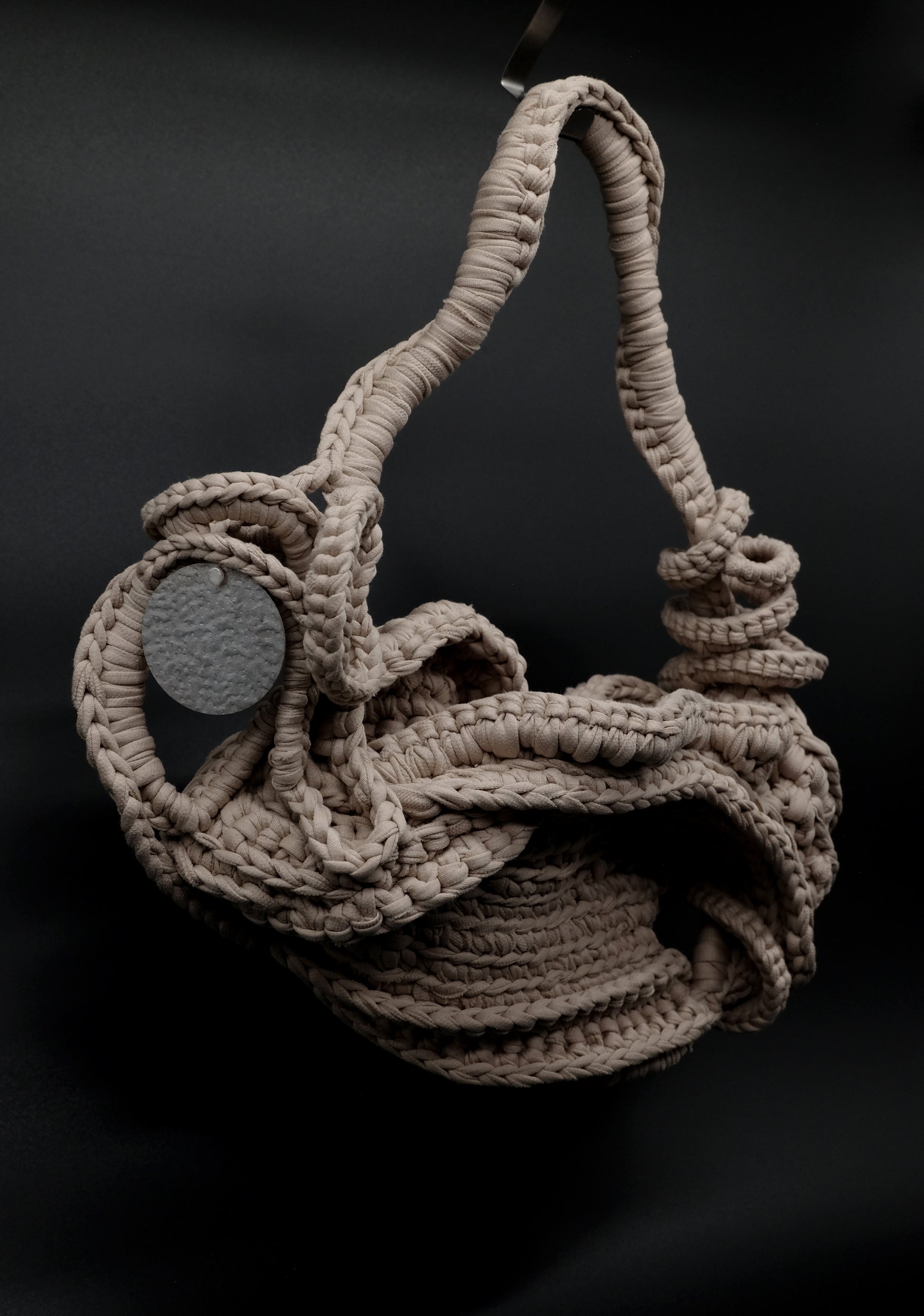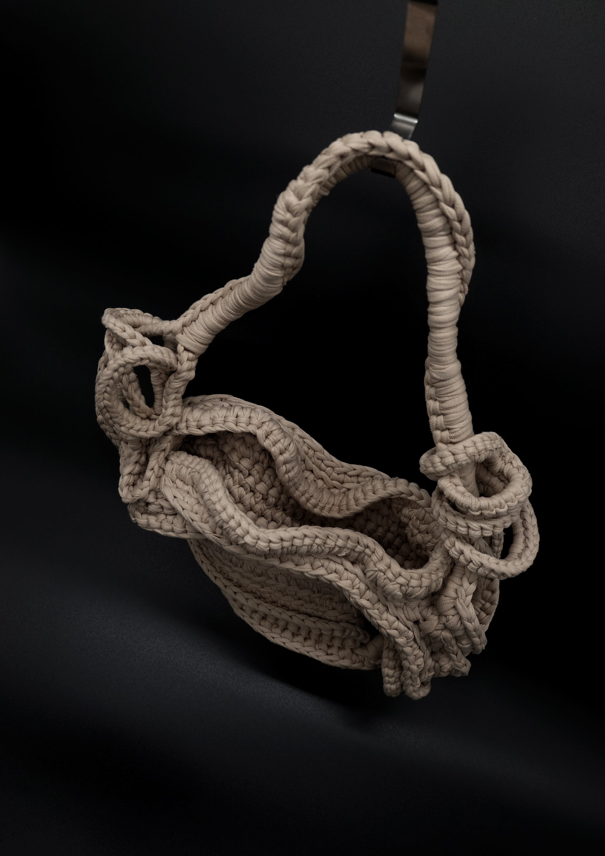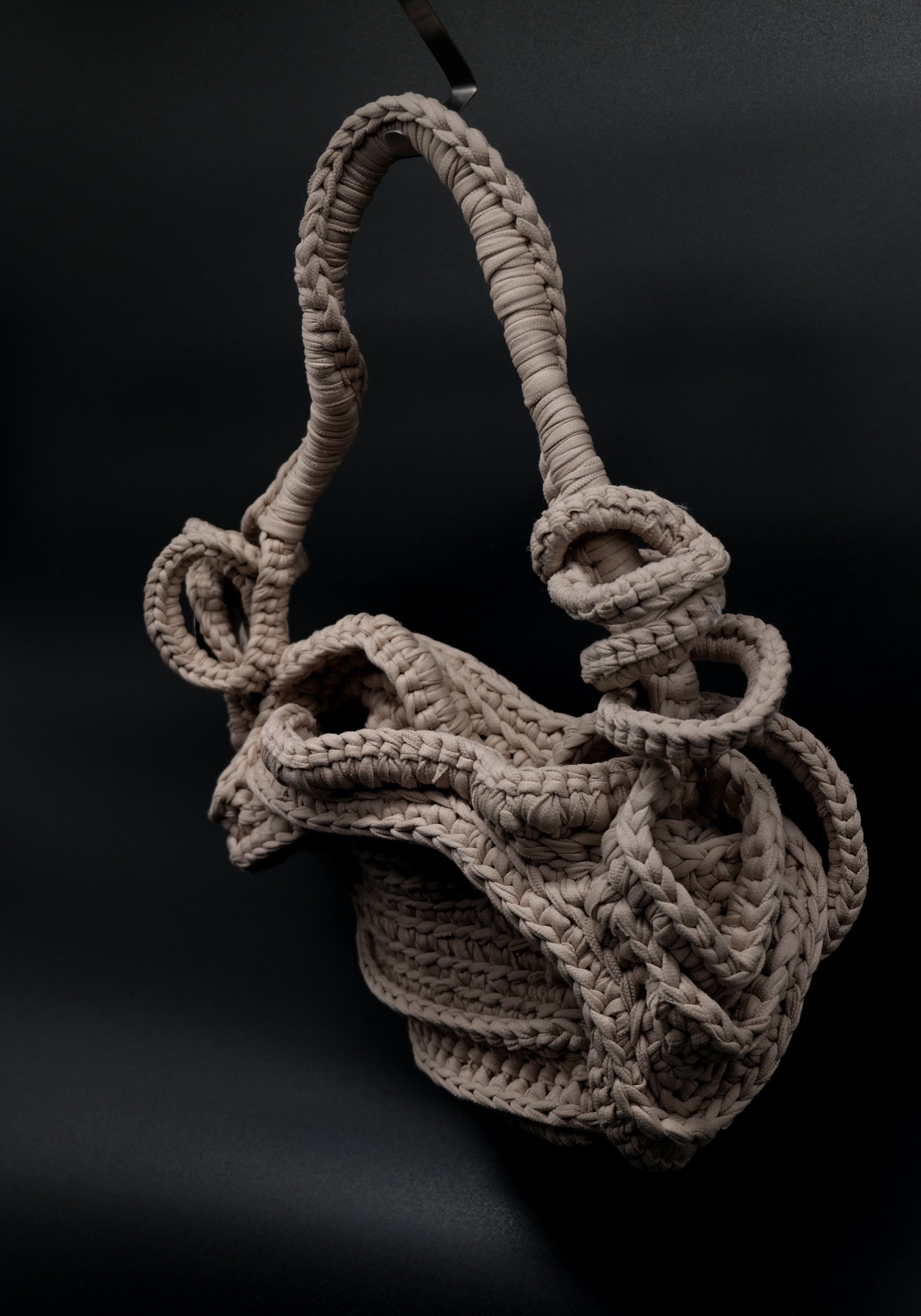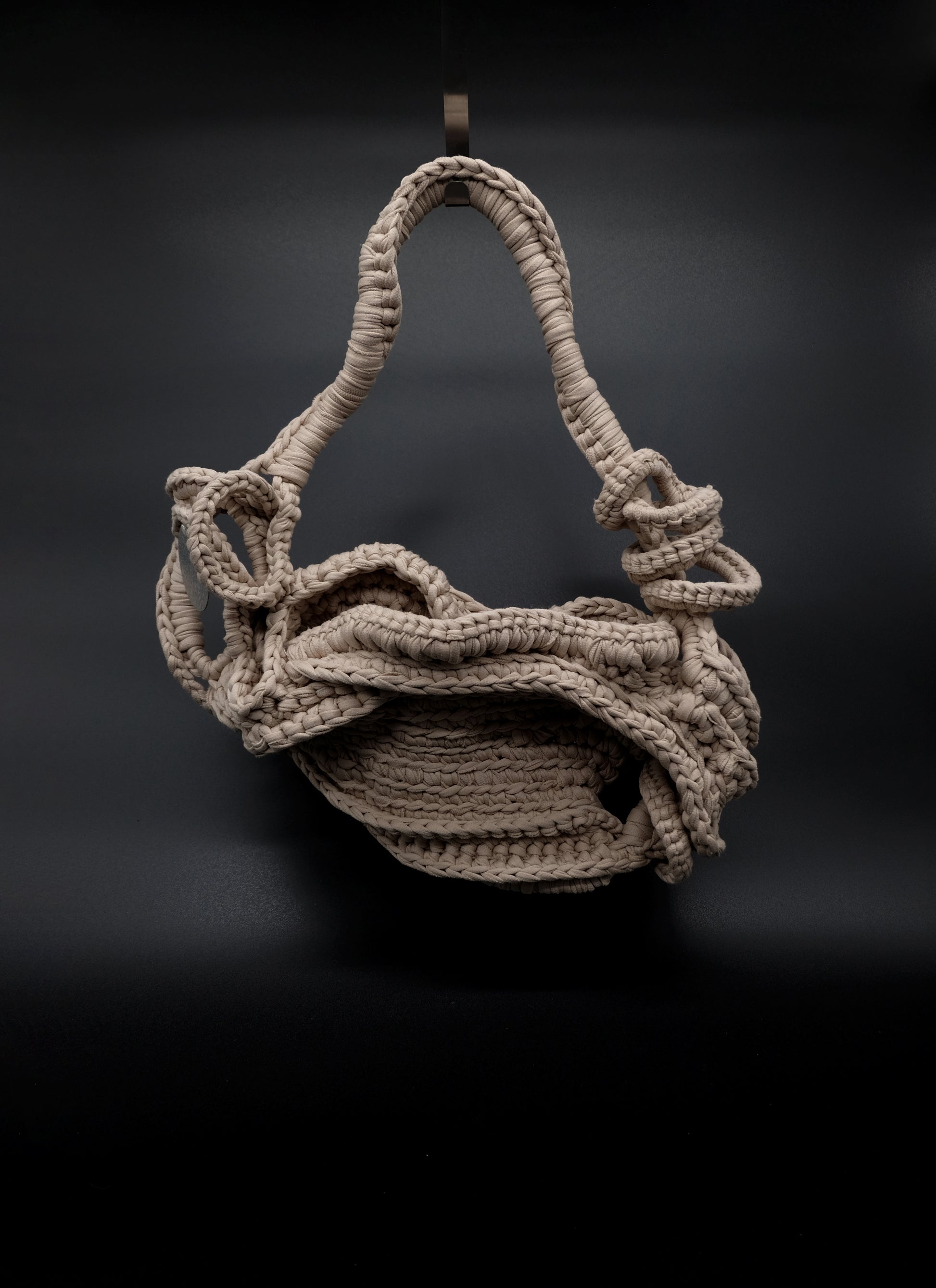 Den intrikata texturen och flödande designen påminner om sanddyner, där varje våg i garnet efterliknar de subtila kurvorna och åsarna som lämnas av vindens osynliga hand. Likt sanden som formas om av naturens krafter hyllar denna väska frihet och förändring. Dess organiska, flödande linjer och harmoniska palett av jordnära toner reflekterar ett landskap i ständig rörelse och framkallar Aeolian-vindens transformerande kraft.