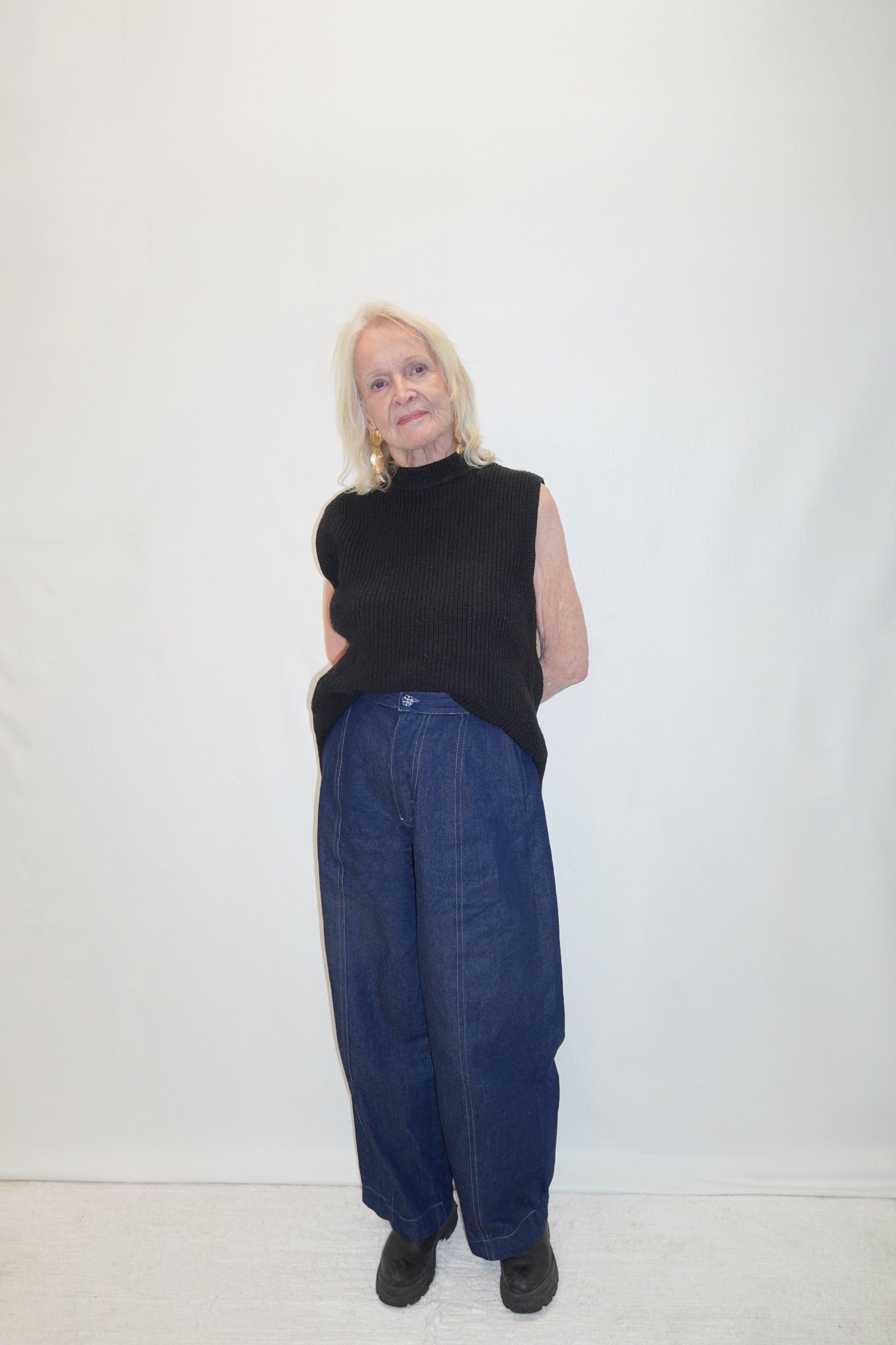 Blå jeans i fyra delar med ljusblå stickningar. Dolda sidofickor och en detaljerad blom knapp i linningen. Bär dem hur du vill. Tex som ett fint kompliment till Alba toppen med eller utan volang, vilken blus som helst eller låt byxorna vara din “center piece” tillsammans med en baströja.