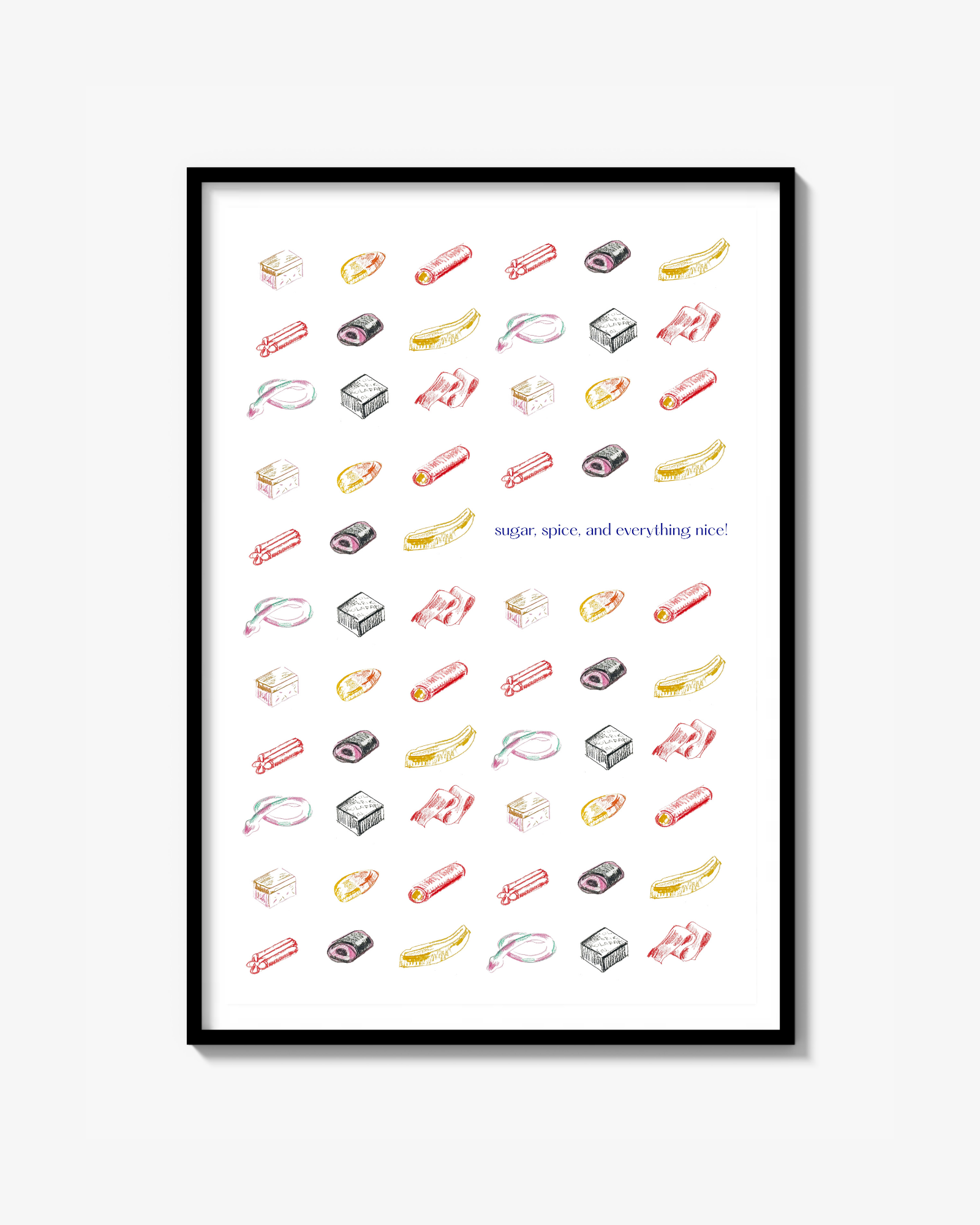 Ge ditt hem en touch av skandinavisk charm och nostalgi med denna underbara Everything Nice poster. Perfekt för godisälskare, detta konsttryck visar ikoniska svenska sötsaker prydligt arrangerade på en vit bakgrund. Den rena skandinaviska designen och lekfulla godismotiven gör den idealisk för kök, barnrum eller som en glad present till alla med en söt tand.