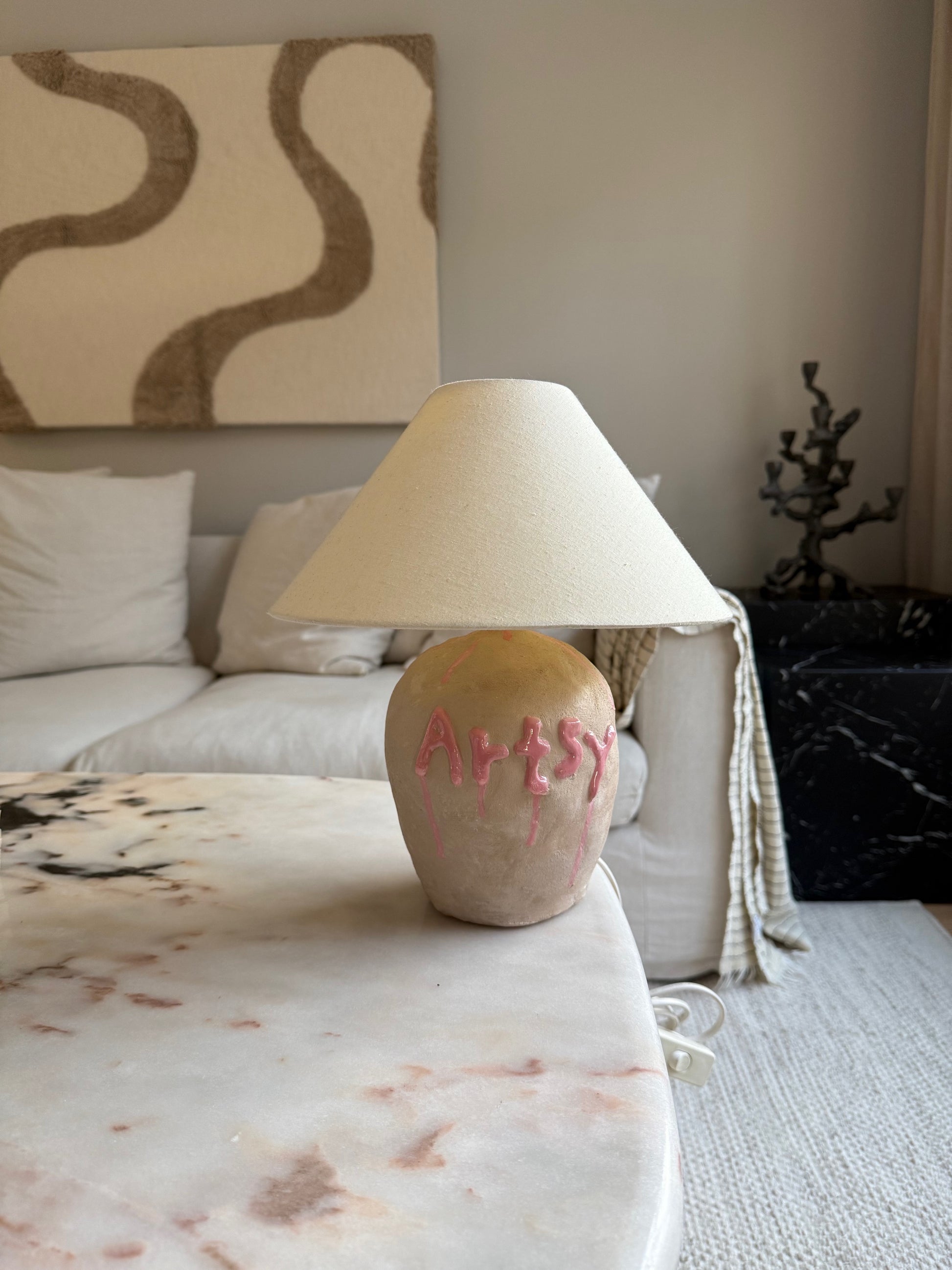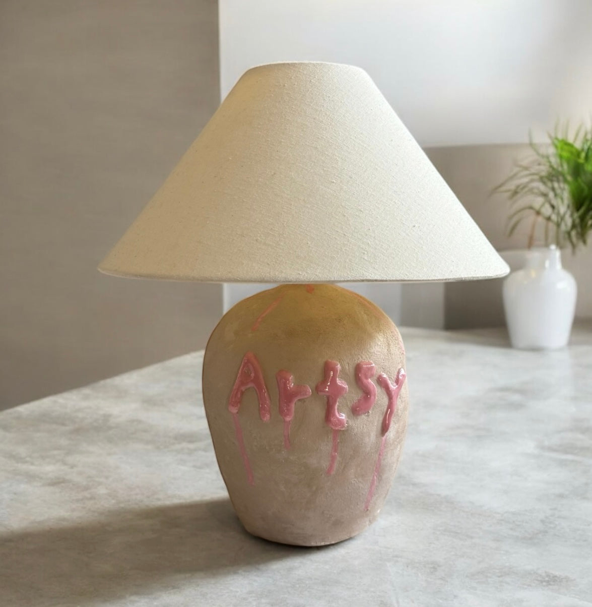 Artsy återvunnen lampa (inklusive lampskärm) i lufttorkad lera och målad med akrylfärg. Lackad med matt lack och högblank finish.