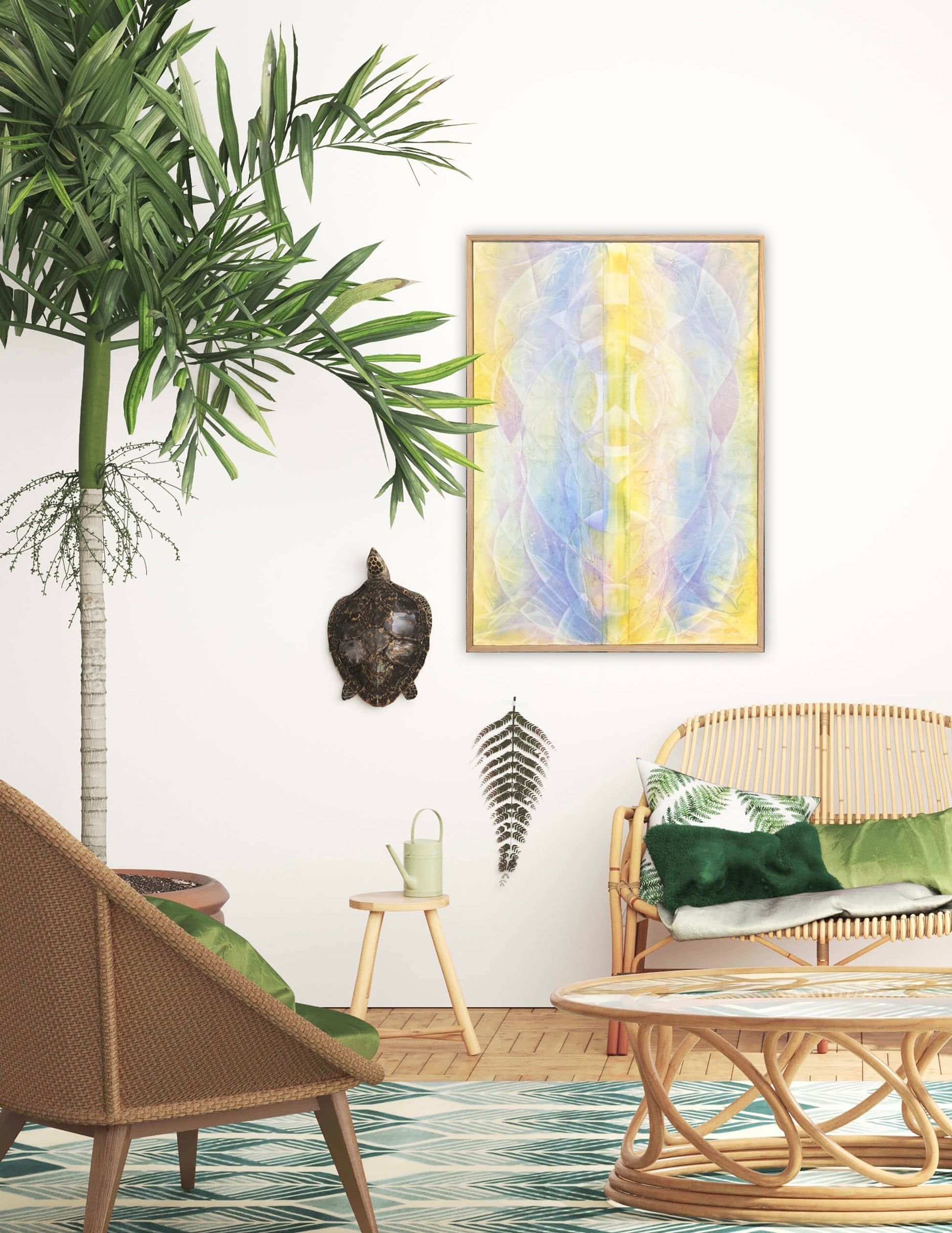 Abstrakt akvarell med överlappande former i gult, blått och lila. En dans av polariteter som transformeras och transcenderar det ordinära.
