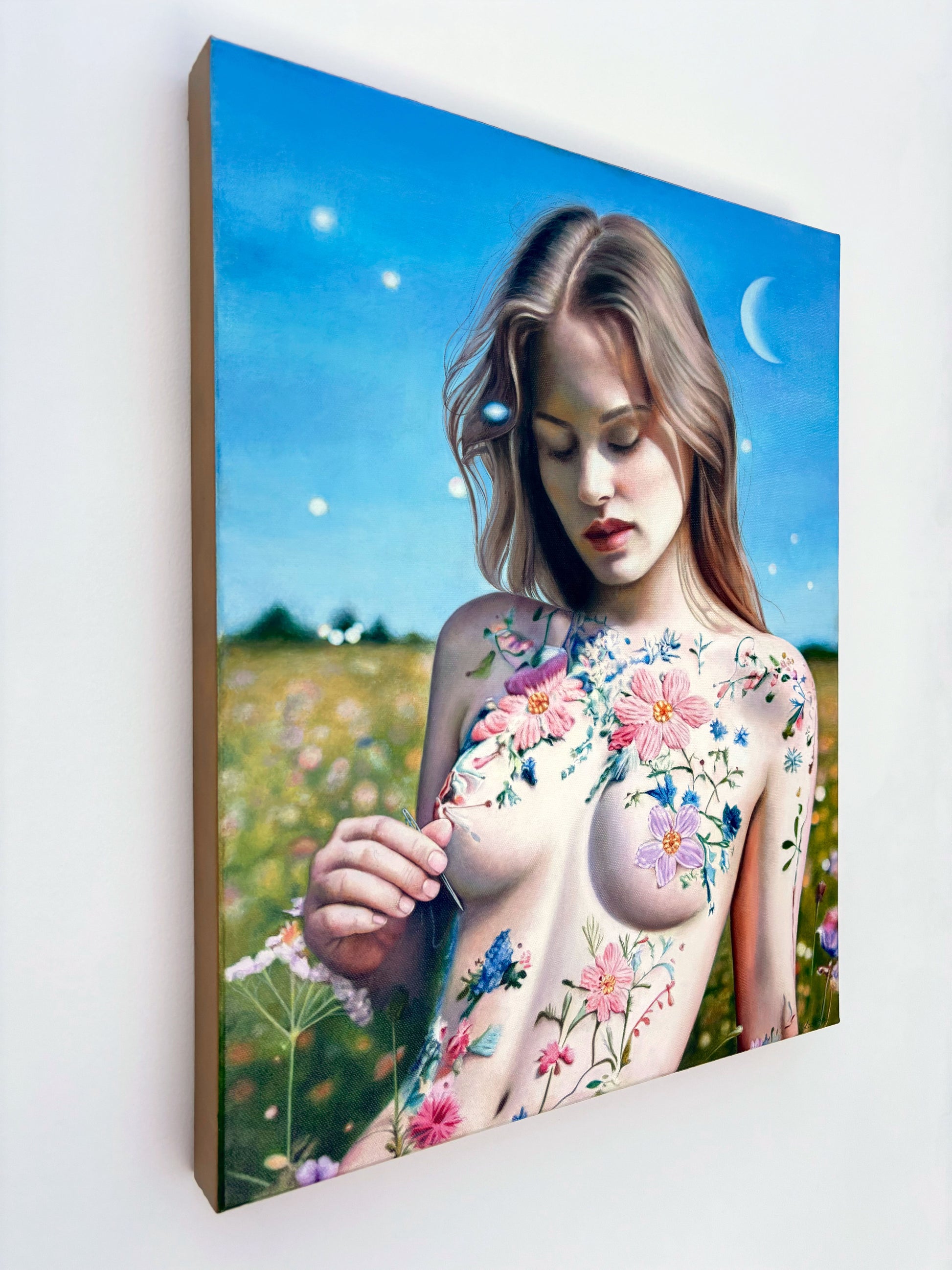 En surrealistisk och poetisk oljemålning som fångar längtan efter att bevara flyktig skönhet. I en solbelyst äng broderar en ung kvinna försiktigt vildblommor på sin egen hud — en gest som är både öm och hemsökande.