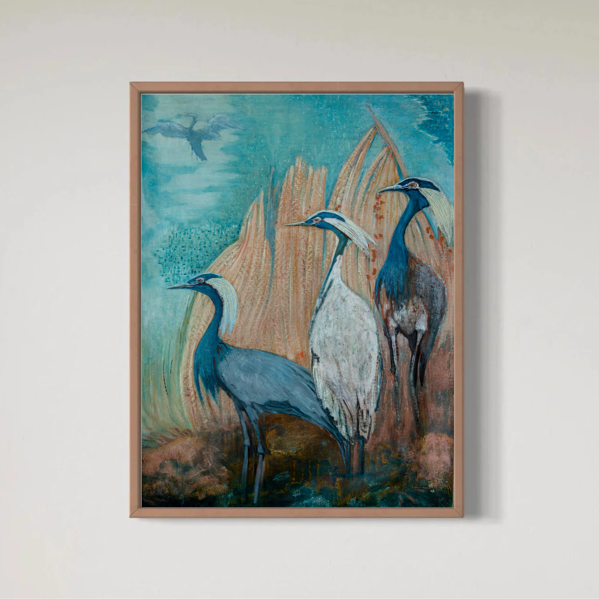 I The Visitors lutade sig en grupp tranor av arten Demoiselle in för att inspektera någon eller något precis utanför ramens kant. Den hade en gång varit en del av en större målning, men jag tyckte om intimiteten i detta fragment. Fåglar har detta älskvärda sätt att luta sina huvuden för att lyssna bättre, som om de försökte fånga en hemlighet. Den lilla, nyfikna gesten var det jag ville fånga här.