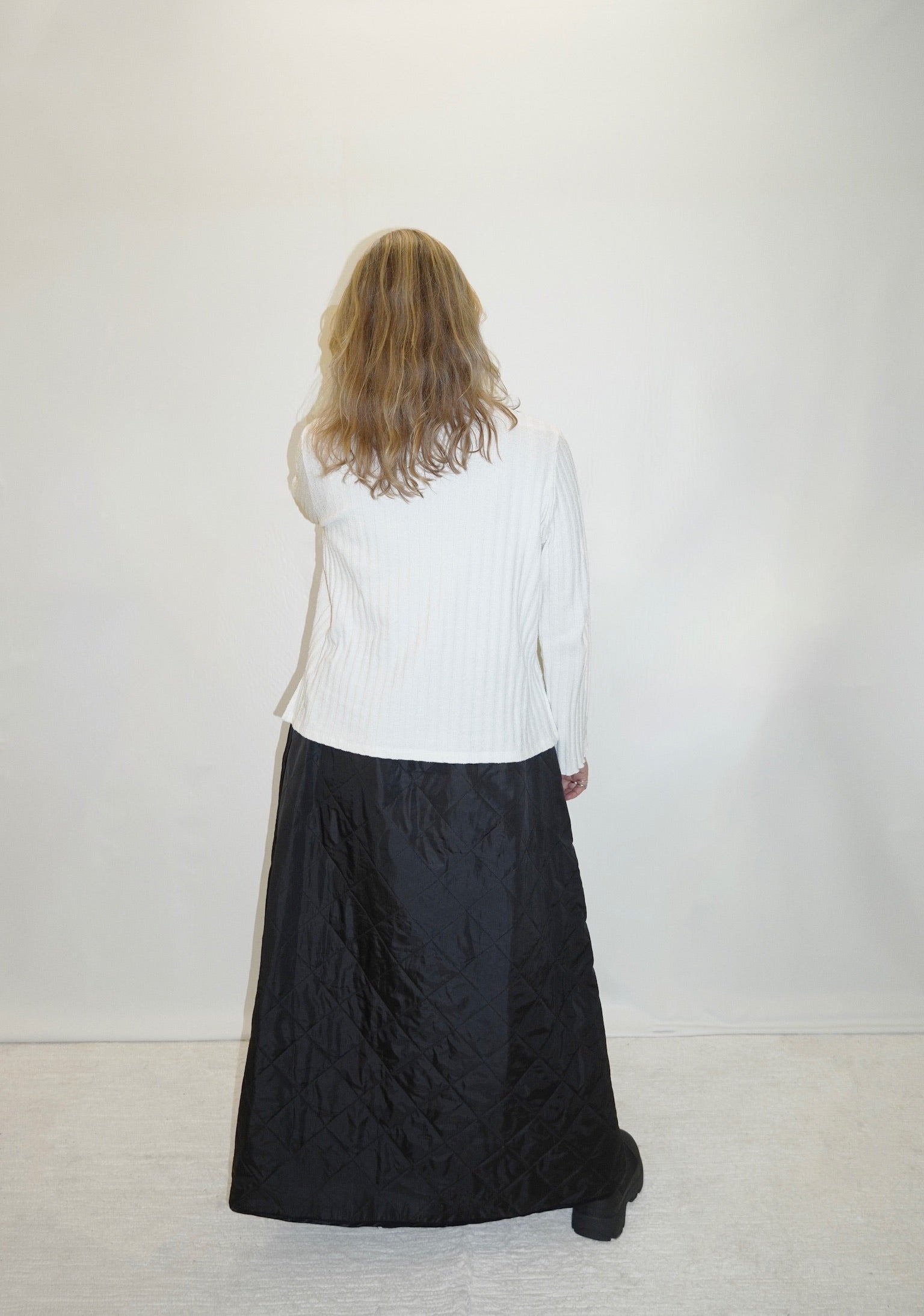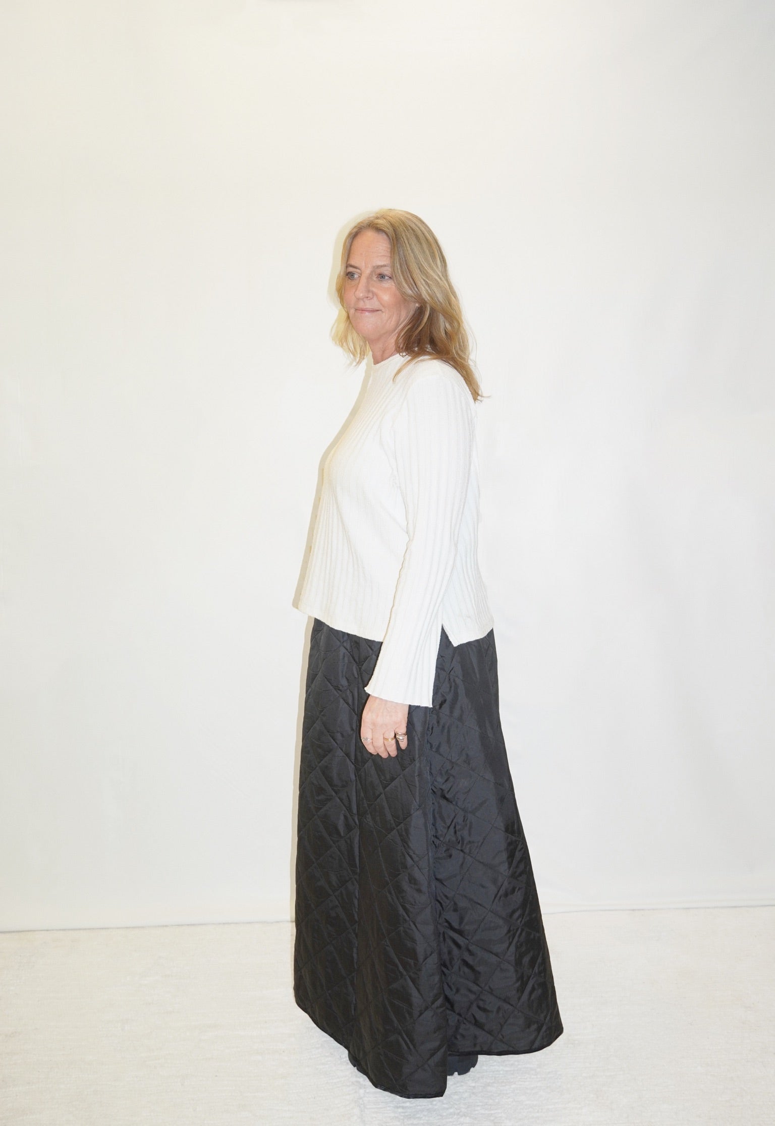 En svart quiltad kjol med silkes bandkantning. Vidd kjol med resår i midjan som gör den bekväm och rörlig. Fungerar som den är till vardags och fest eller över dina byxor som extra värme. Bär den tillsammans med black Edith väst för en komplett look eller tillsammans med valfri topp.