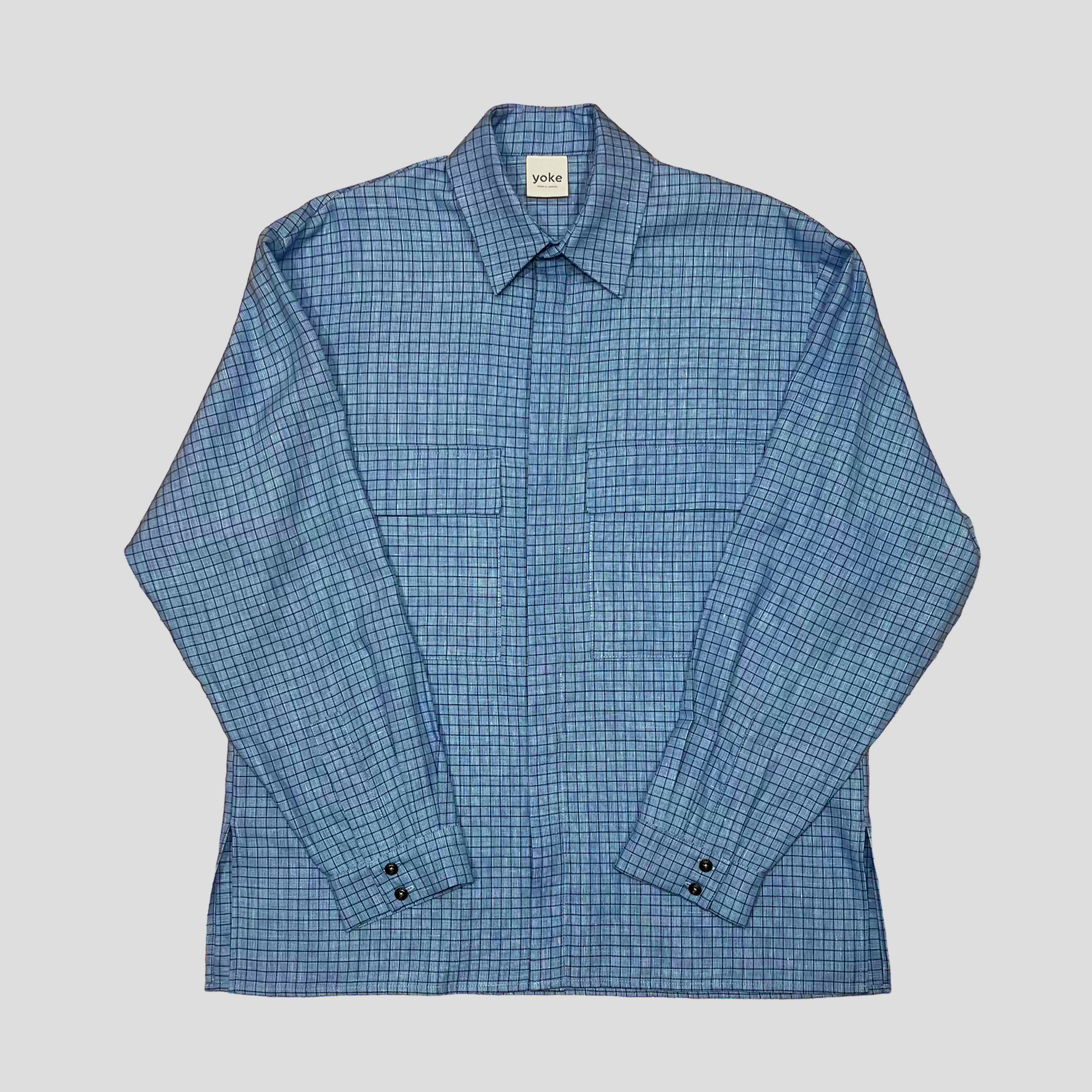 En klassisk blårutigt långärmad skjorta i en linnemix som kan bäras som skjorta eller lätt sommarjacka. Den är designad för att vara oversized och könsneutral. Se storleksmåtten för detta plagg eller besök vår generella storleksguide för mer information. Chloe bär en skjorta i storlek small och byxor i midjemått 26-28.