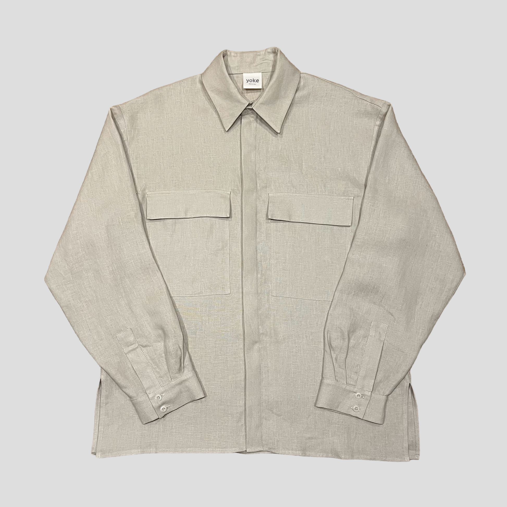 En klassisk långärmad skjorta i krämfärgat linne som kan bäras som en skjorta eller en lätt sommarjacka. Den är oversized och könsneutral, vänligen se storleksguiden för mer information. Lucy bär storlek medium på skjortan och byxor i storlek 28-30 i midjan.