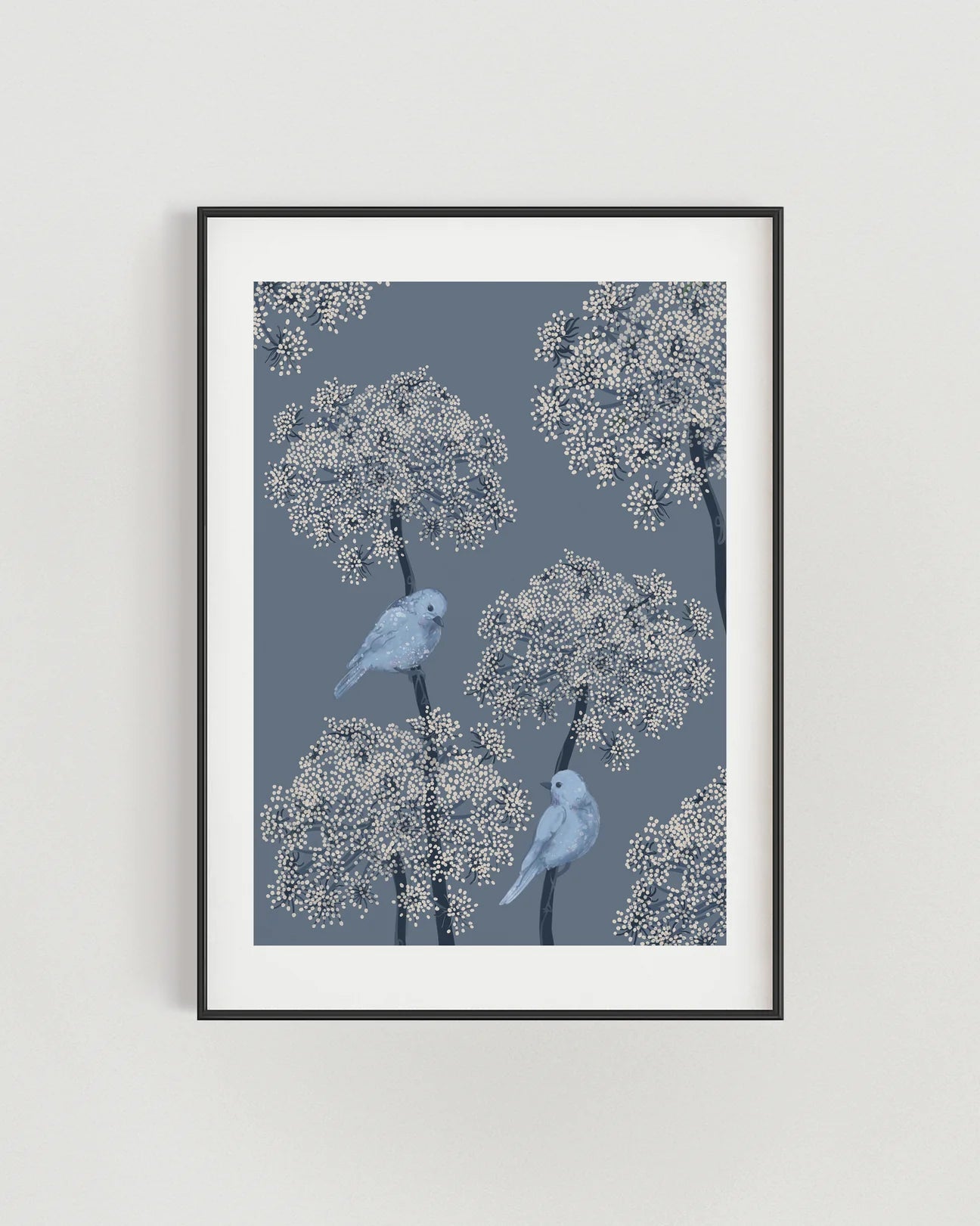”Bluebirds” av Emma Älveus tillför en känsla av lugn elegans till dina väggar. Det här fina konstverket visar rofyllda blåfåglar omgivna av mjukt detaljerad växtlighet, vilket skapar en harmonisk komposition som utstrålar stillhet och charm. Perfekt för sovrum, vardagsrum eller hall – ett tidlöst tryck som passar såväl minimalistiska som naturinspirerade inredningar.