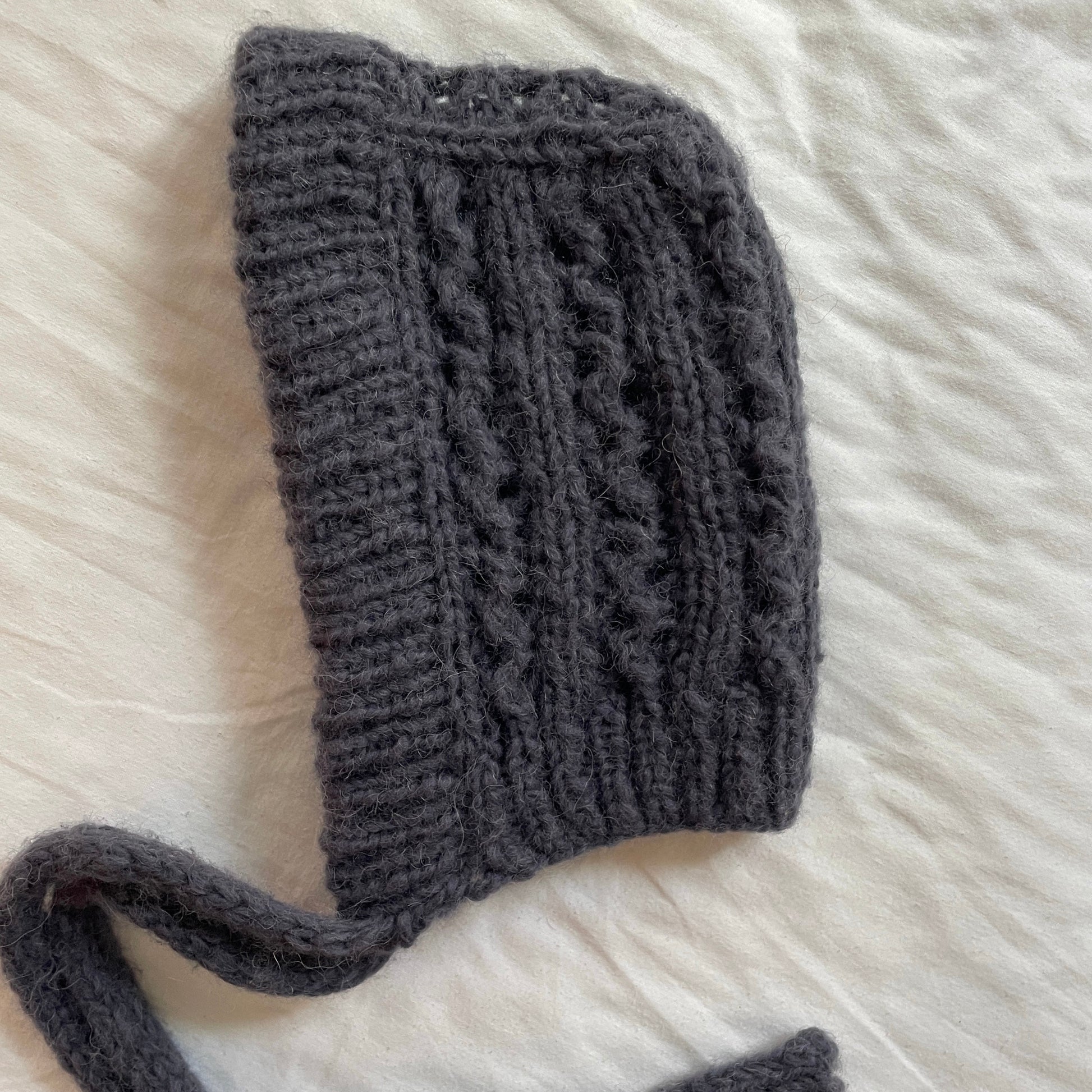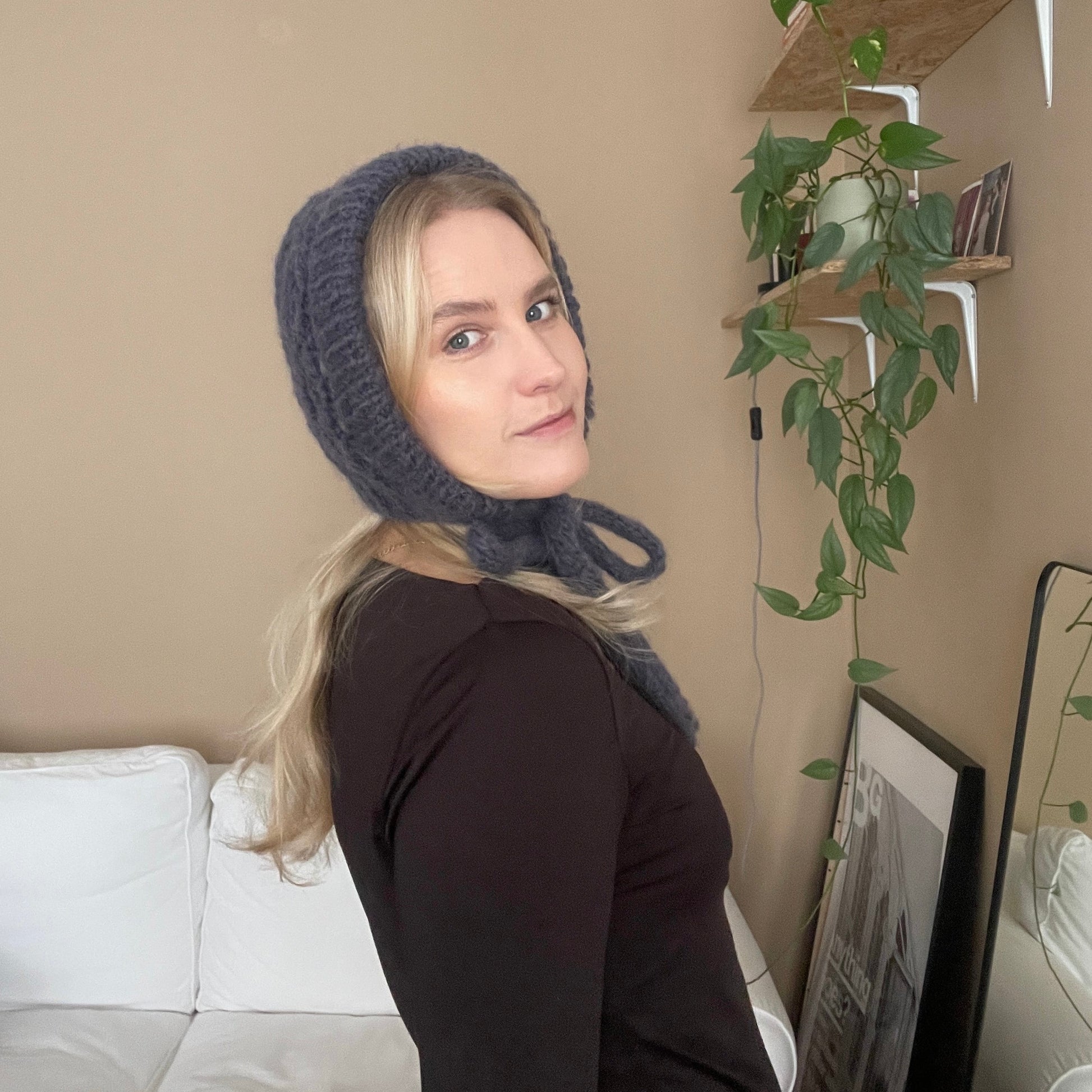 Fluffig grå stickad hätta, handgjord. Tillverkad av 30% alpaka och 70% merinoull.