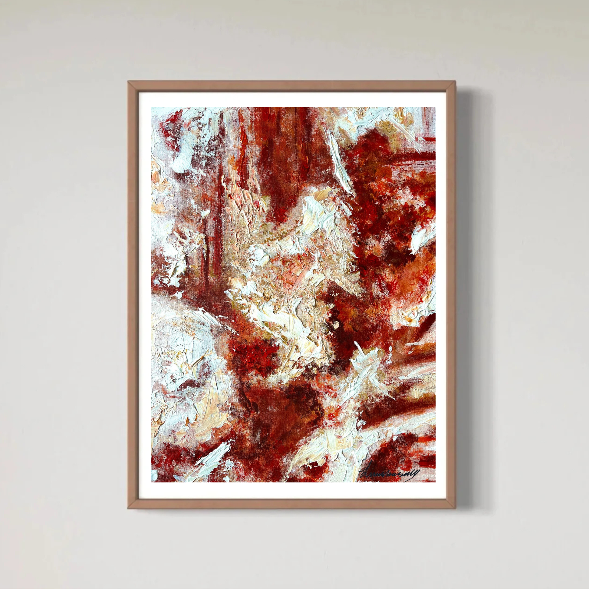 En resa genom glödande nyanser av rött och vitt. ”Burning Hours” vibrerar av energi, där färgerna smälter samman som fladdrande lågor i ständig rörelse. Ett verk som fångar ögonblickets hetta och passion.