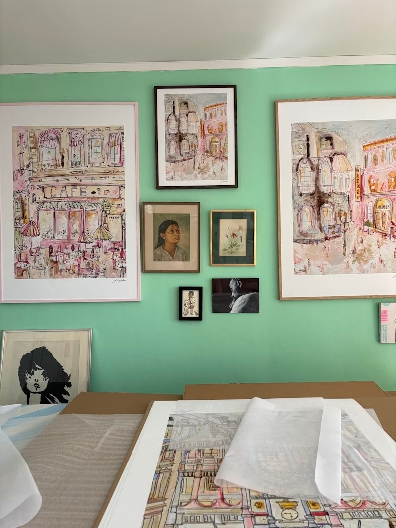 En affisch av talangfulla Nike Adawis unika, färgstarka och somriga konstverk "Café". Detta vackra pastellverk visualiserar en stad och blandar olika tekniker, som till exempel akvarell. Perfekt för det skandinaviska hemmet!