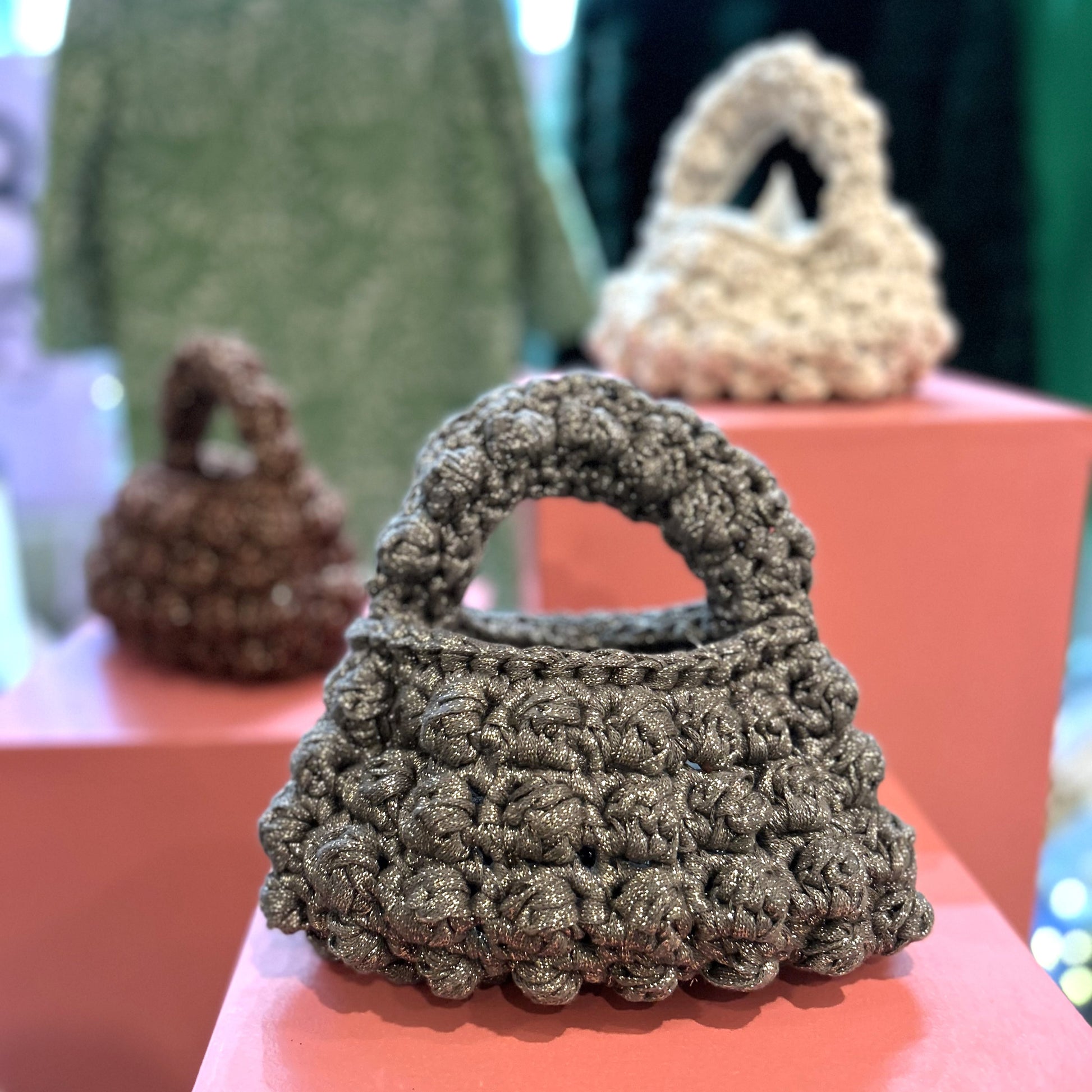 Väskan är virkad i ett bubbligt mönster i återvunnet, glittrande rymdgrå och silvrig bomull.
