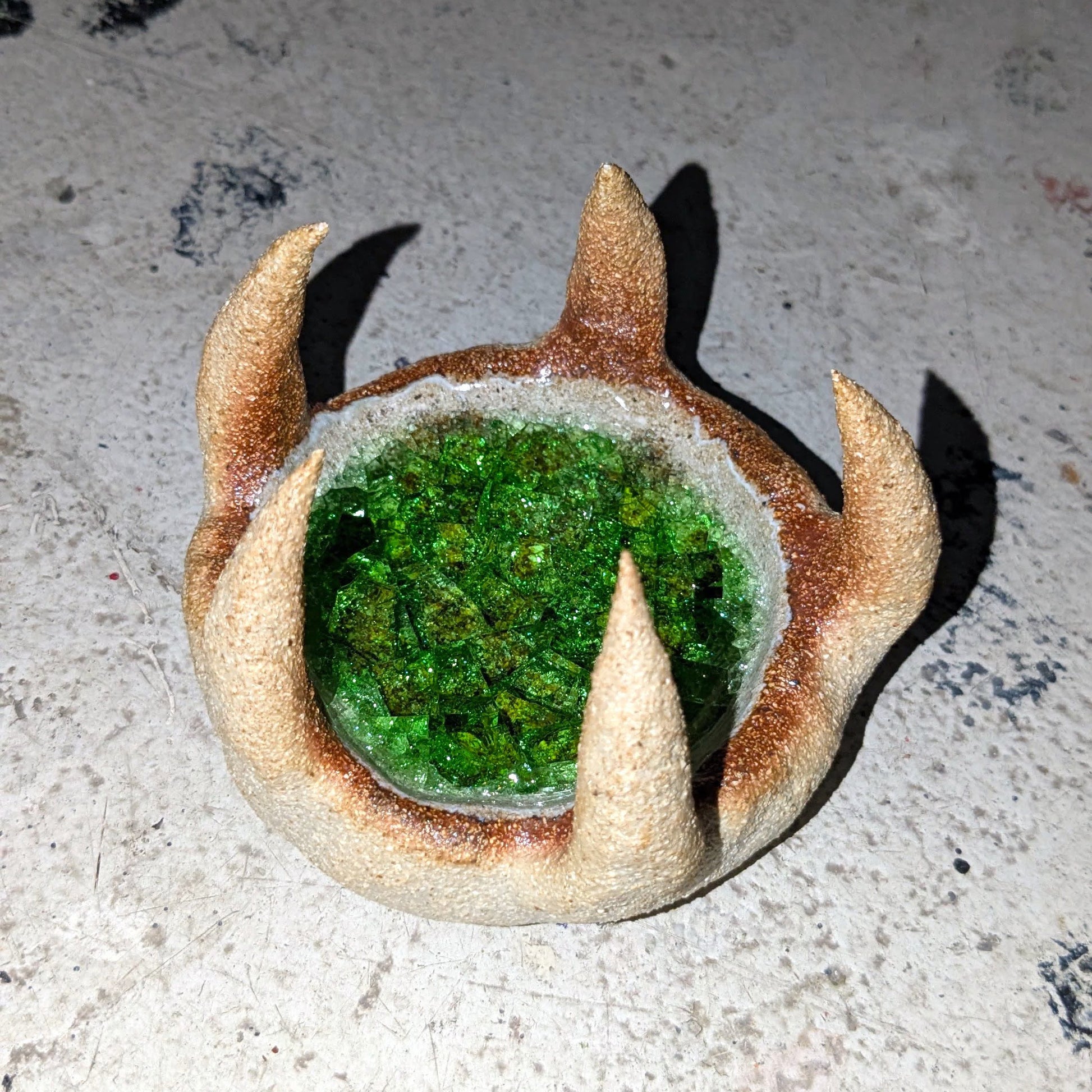Material: Beige stengodslera och grönt glas