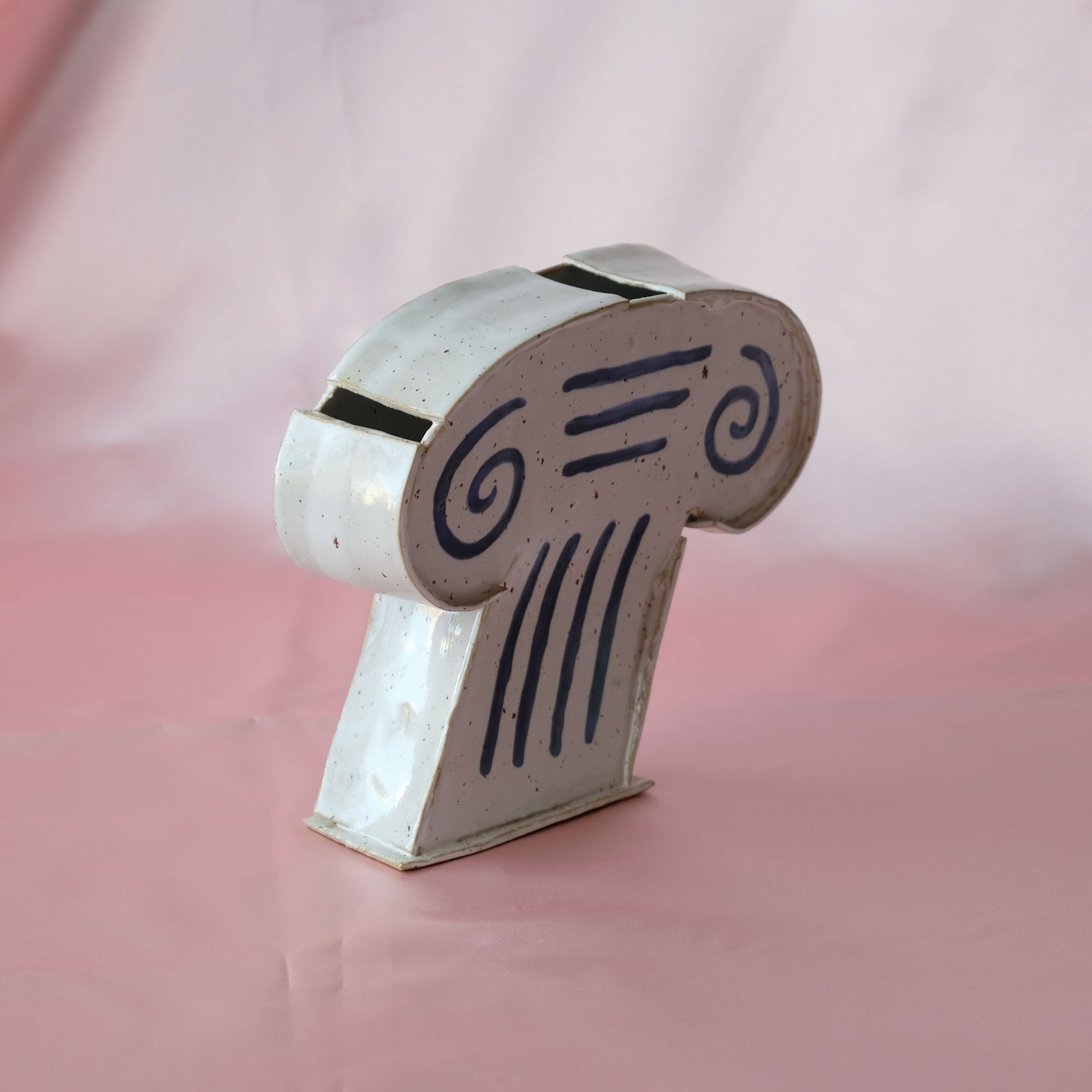 Ett kapitäl ur serien KURSIV, där allt lutar lite åt höger. Denna skulptur är kavlad och byggd av prickig stengods, bemålad med blå dekorfärg och därefter glaserad med blank, vit glasyr. Finns endast i ett exemplar.
