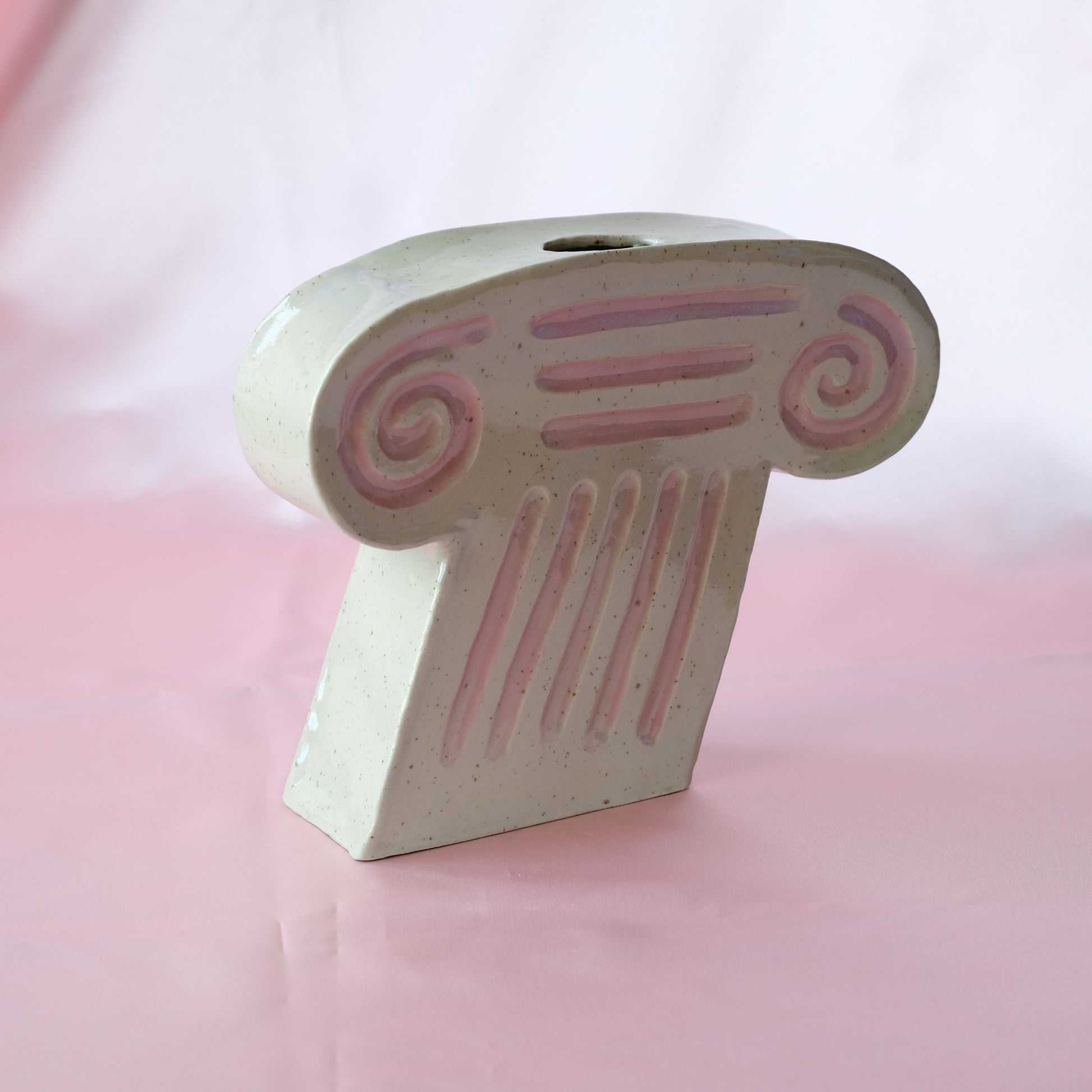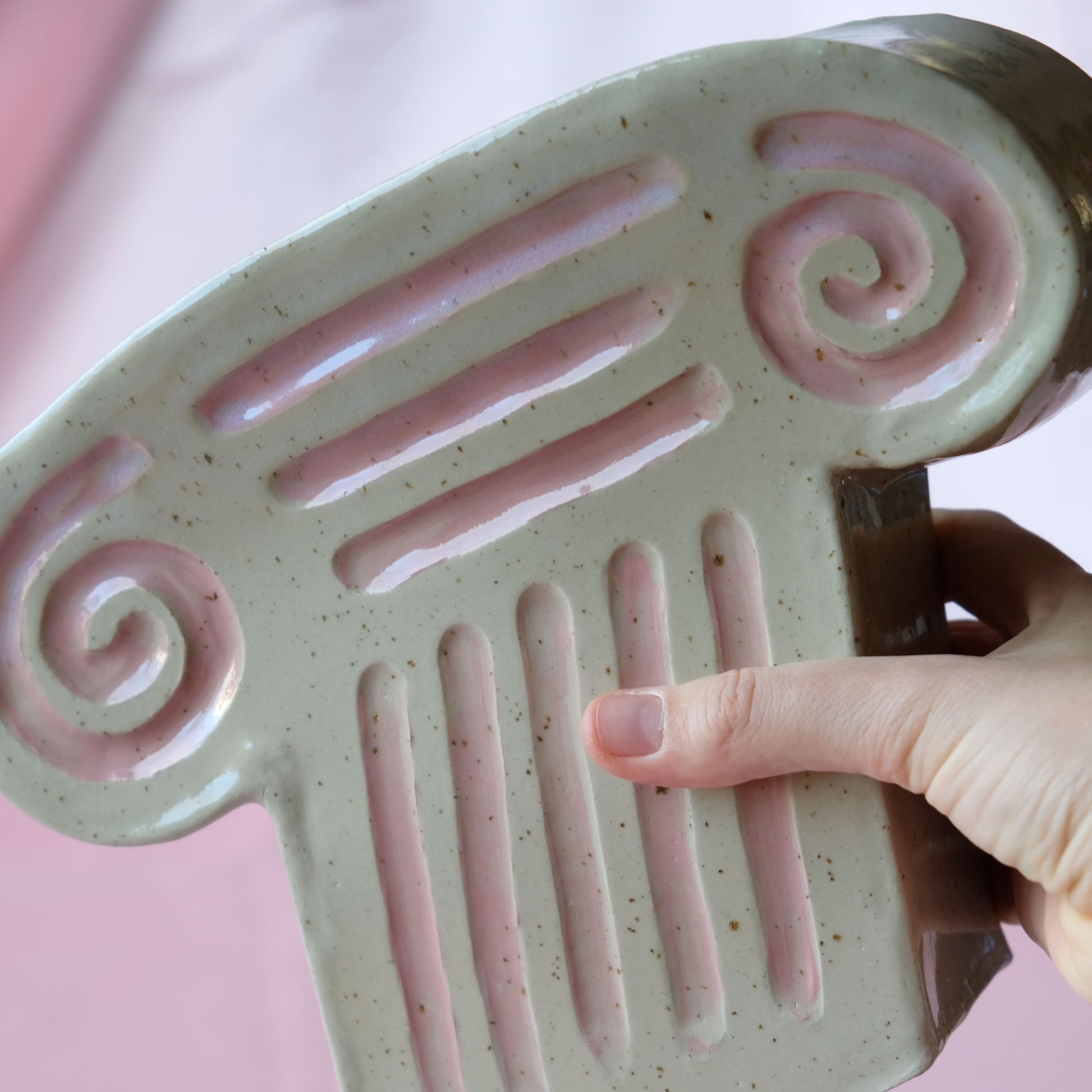 Ett kapitäl ur serien KURSIV, där allt lutar lite åt höger. Denna skulptur är handbyggd av stengods, bemålad med rosa engobe och därefter glaserad med blank glasyr. Både fram- och baksida är dekorativt karvade, där framsidan har den rosa engobefärgen och baksidan är utan det rosa, med de karvade strecken. På så vis kan man välja sida efter sammanhang!