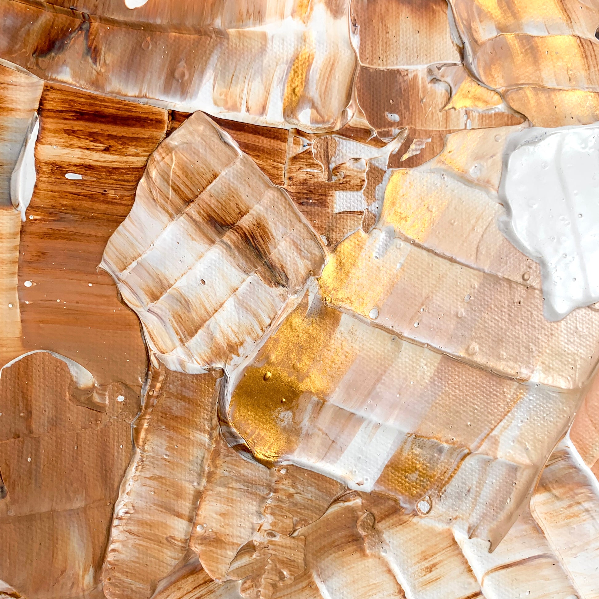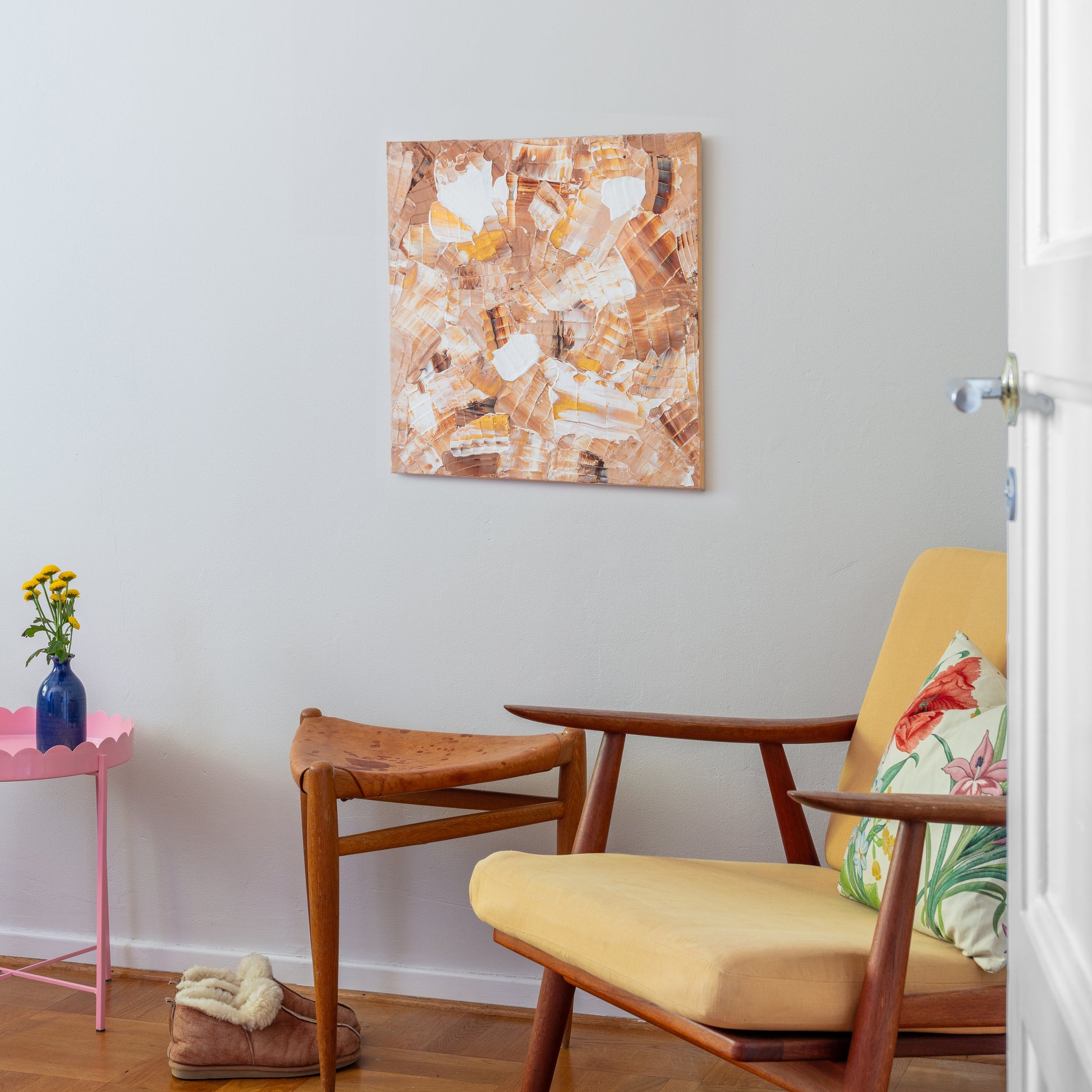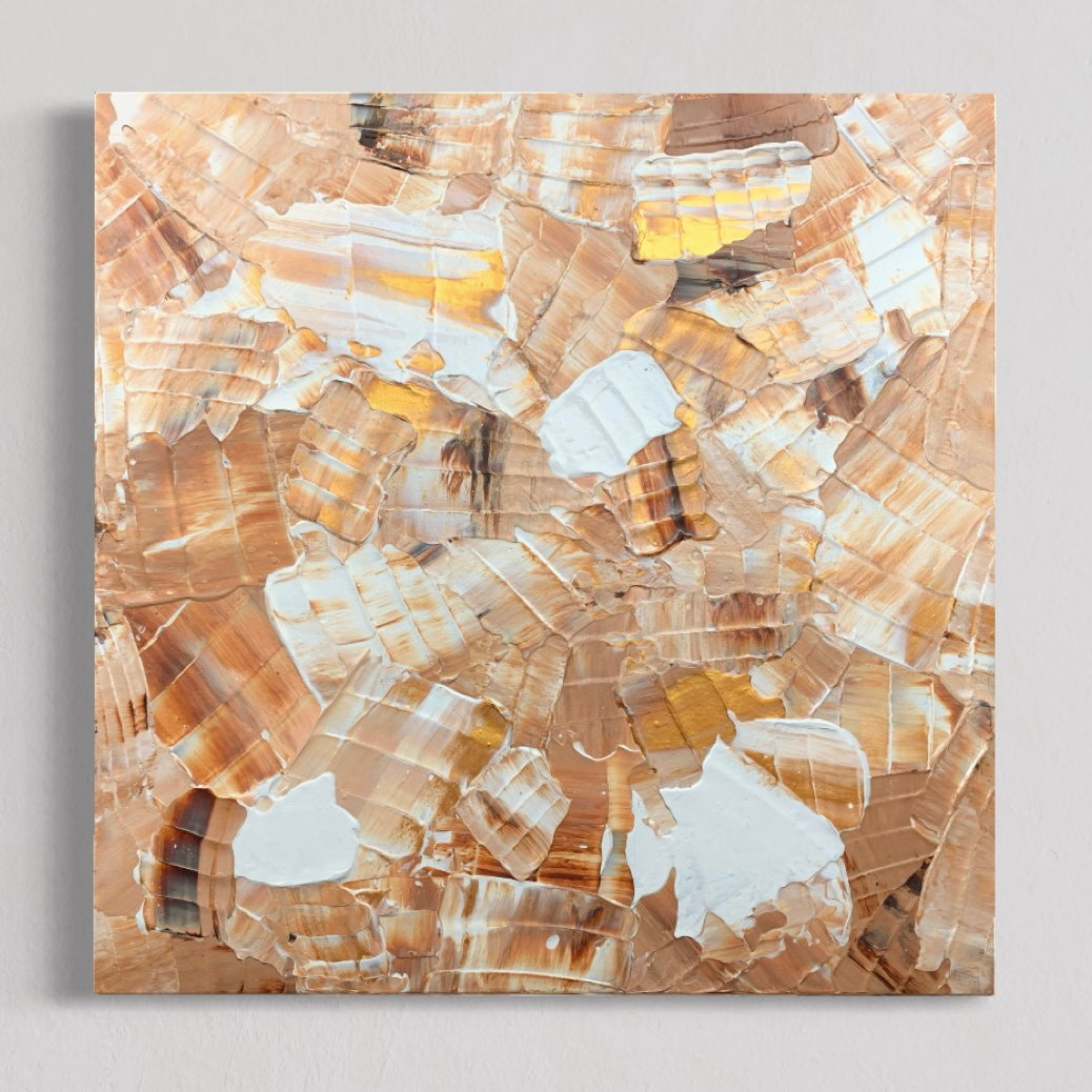 Precis som en krämig cappuccino eller mjukglass med karamellsås framkallar denna målning värmen och komforten från dina favoritsötsaker. Med en dämpad färgpalett och några skimrande gulddrag är den perfekt för att ge en mjuk och inbjudande känsla till vilket rum som helst.