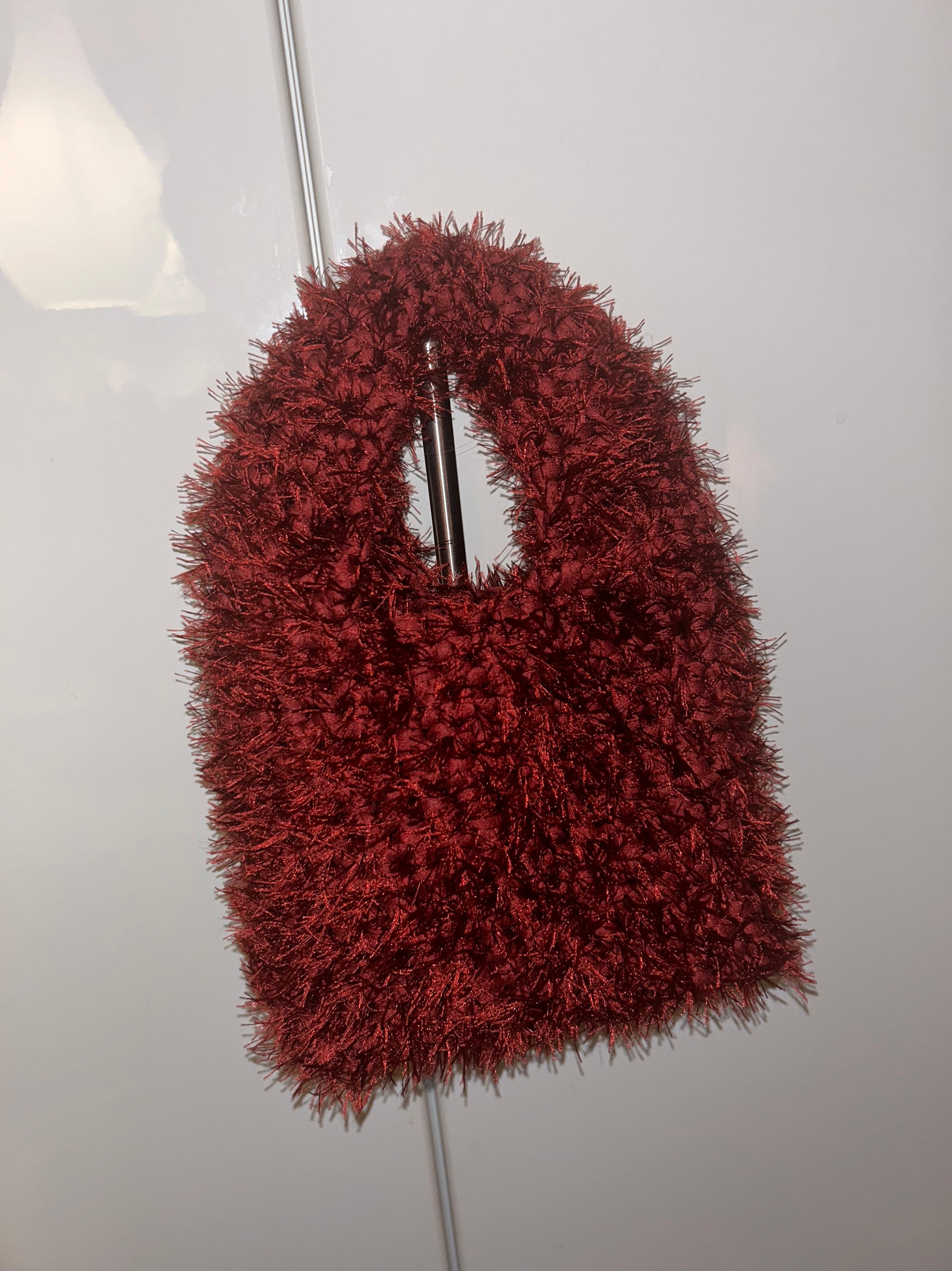 En unik, röd och fluffig virkad väska som är perfekt för att bära dina vardagliga saker - handgjord av designern The clarity way of life. Bär den på axeln eller bär den i handen och gör dina outfits mer personliga och snygga på samma gång!