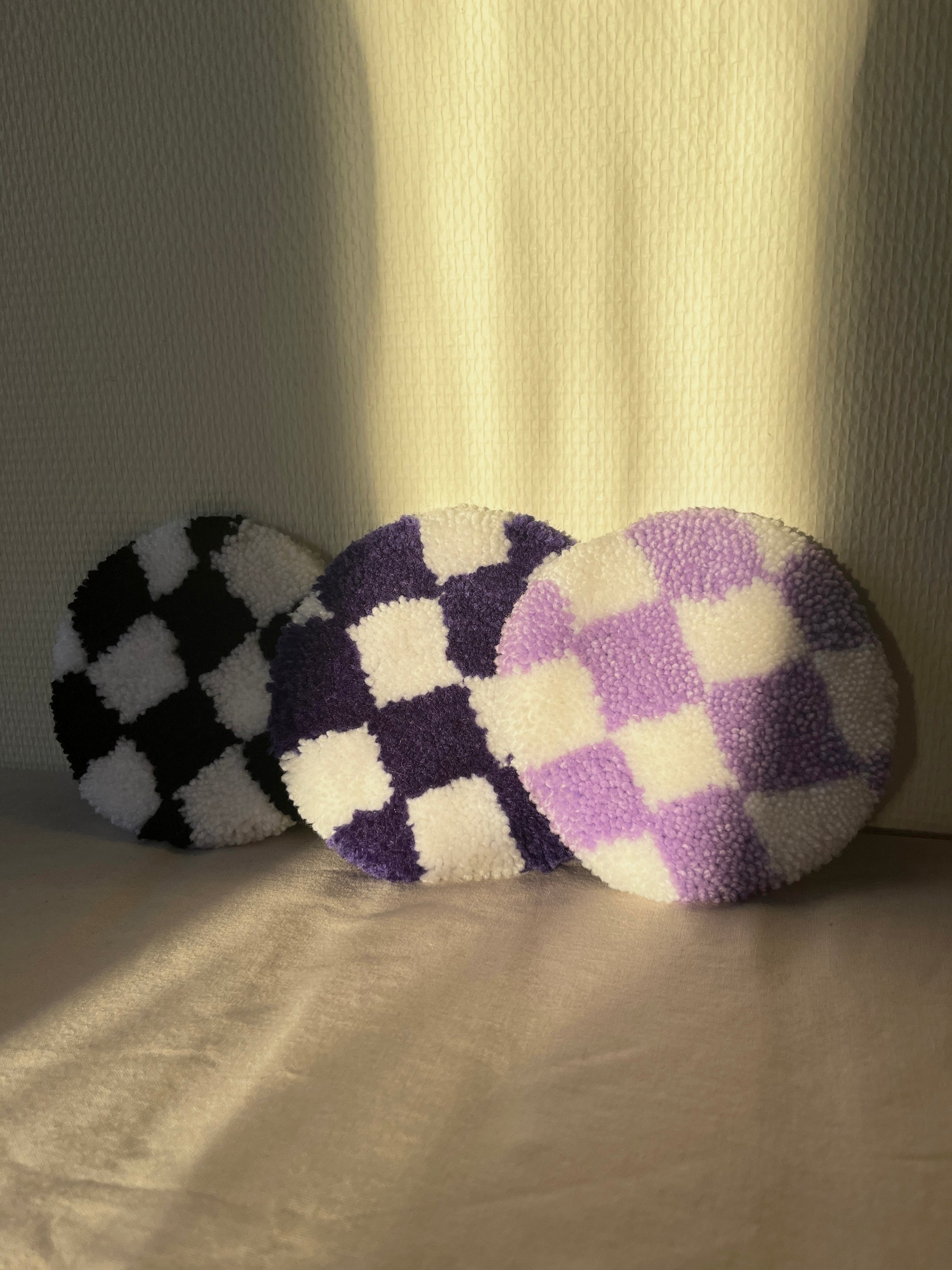 Den skandinaviska designern Estera Studios flerfärgade, rutiga glasunderlägg. Perfekt för att undvika märken på ditt bord, samtidigt som du gör ditt hem mer unikt, roligt och elegant. Denna design är gjord med 100 % akrylgarn i Monks tyg, bakad med fiberlim och akrylfilt.