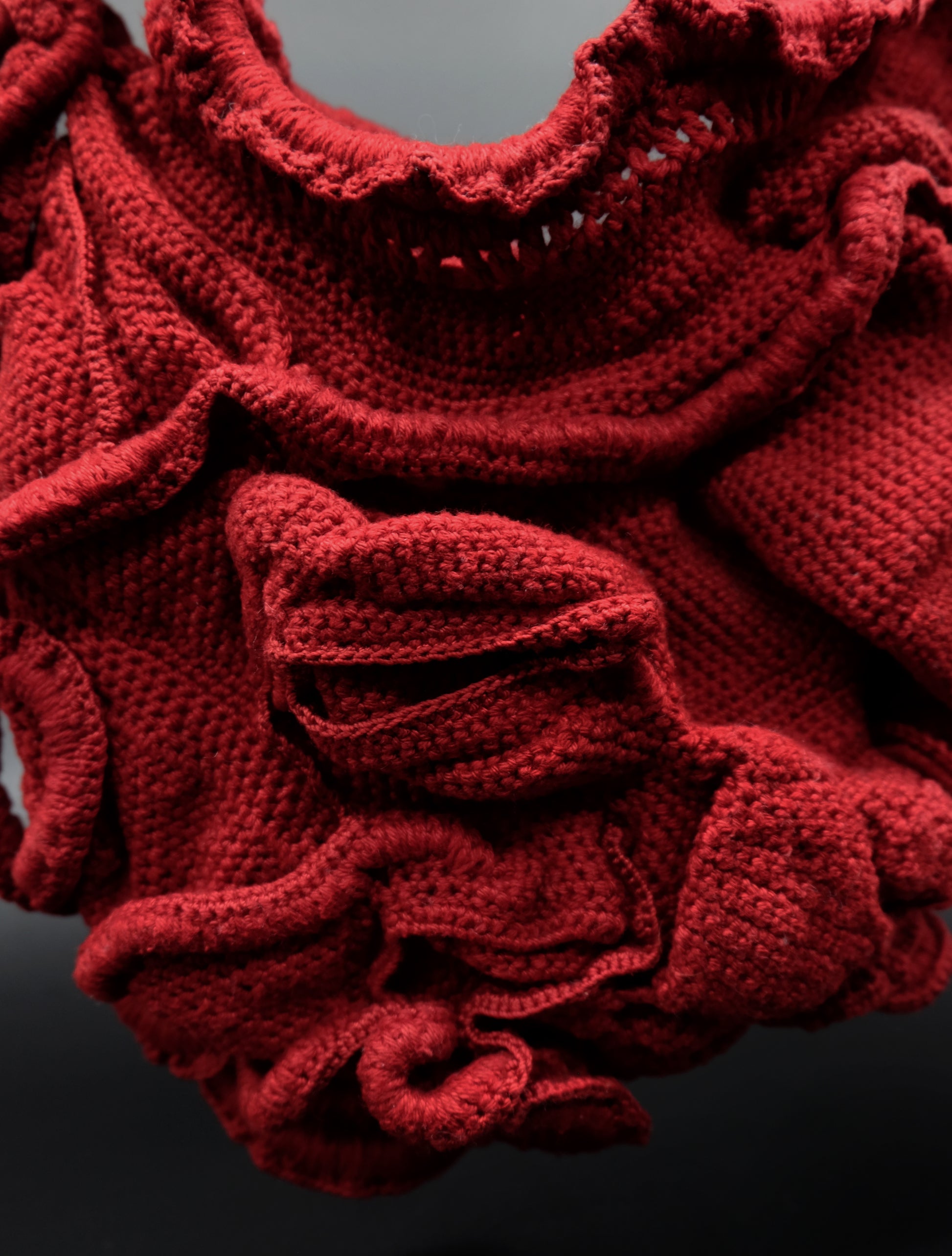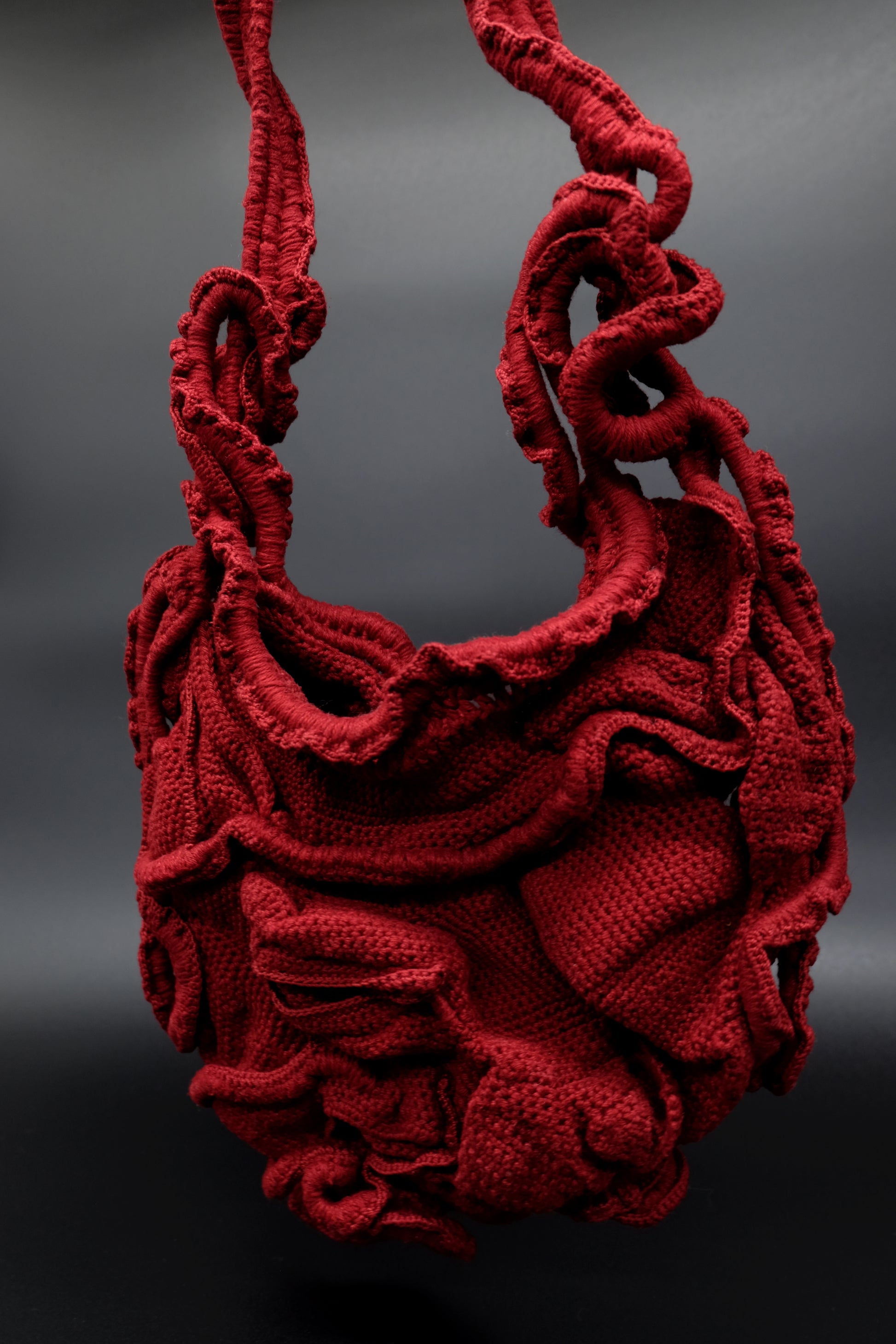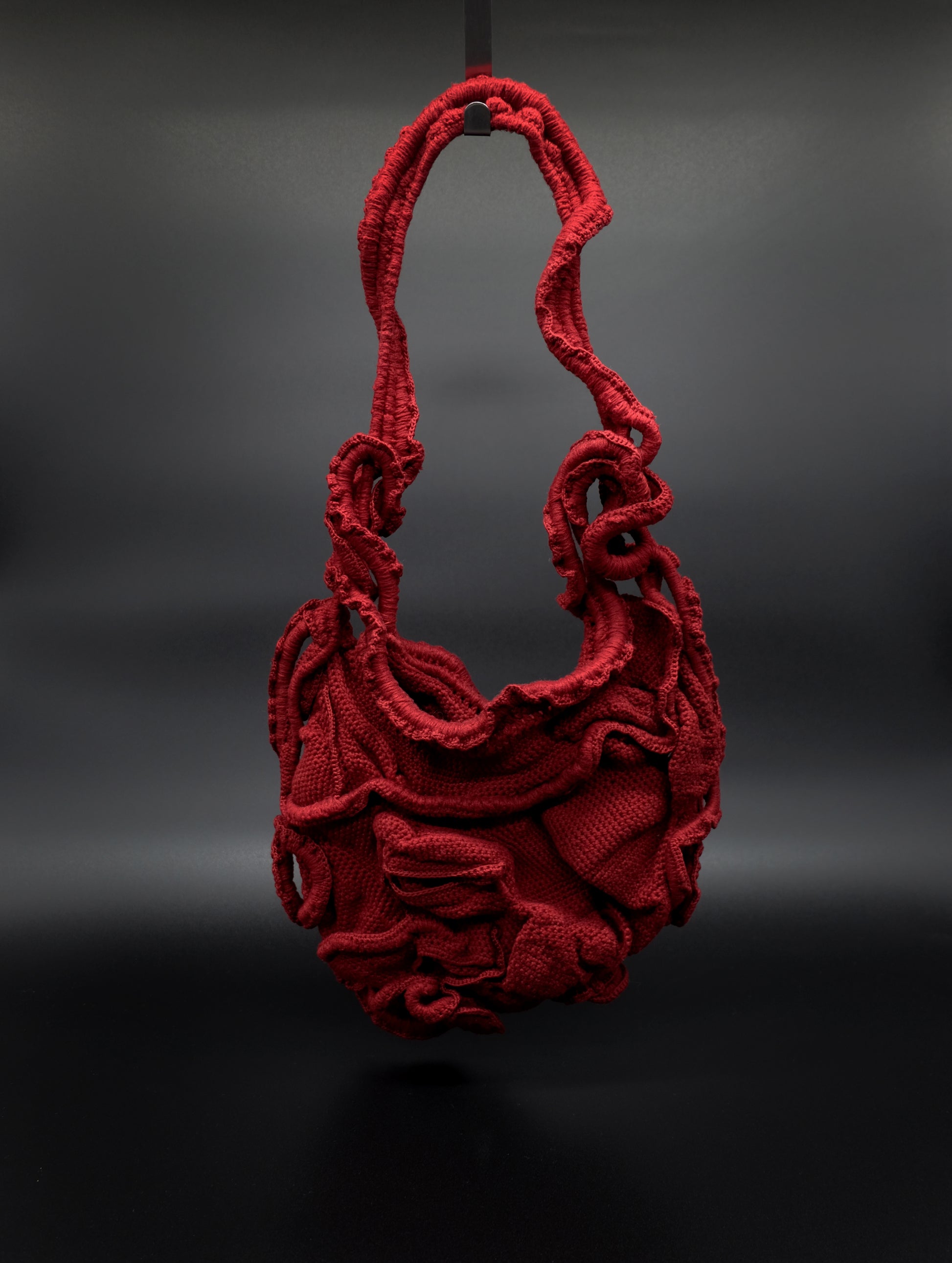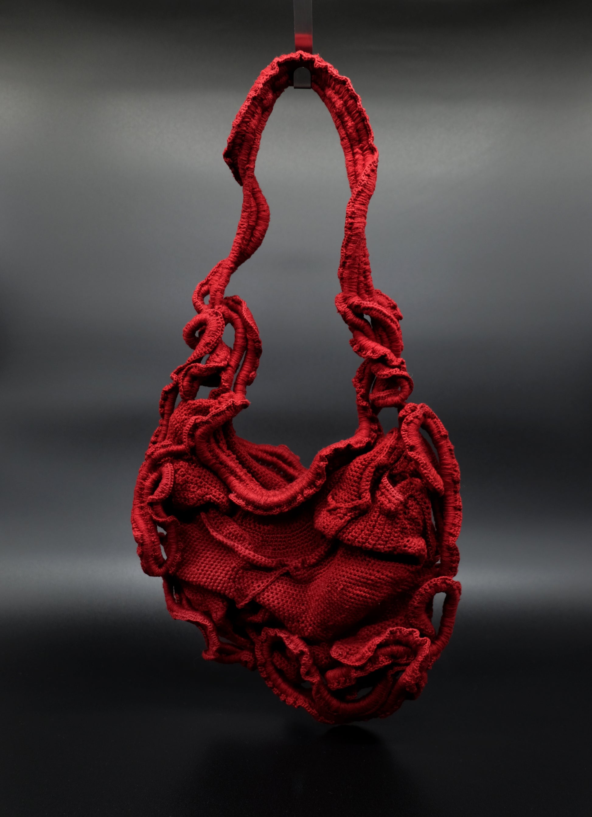 Chorion Handväska är en virkad couture-väska tillverkad av vintage bomullsgarn, spetskant och sedan handfärgad.