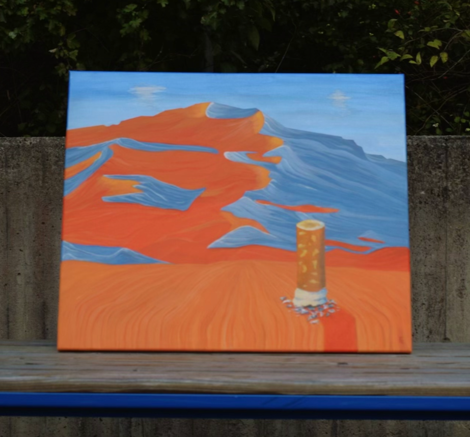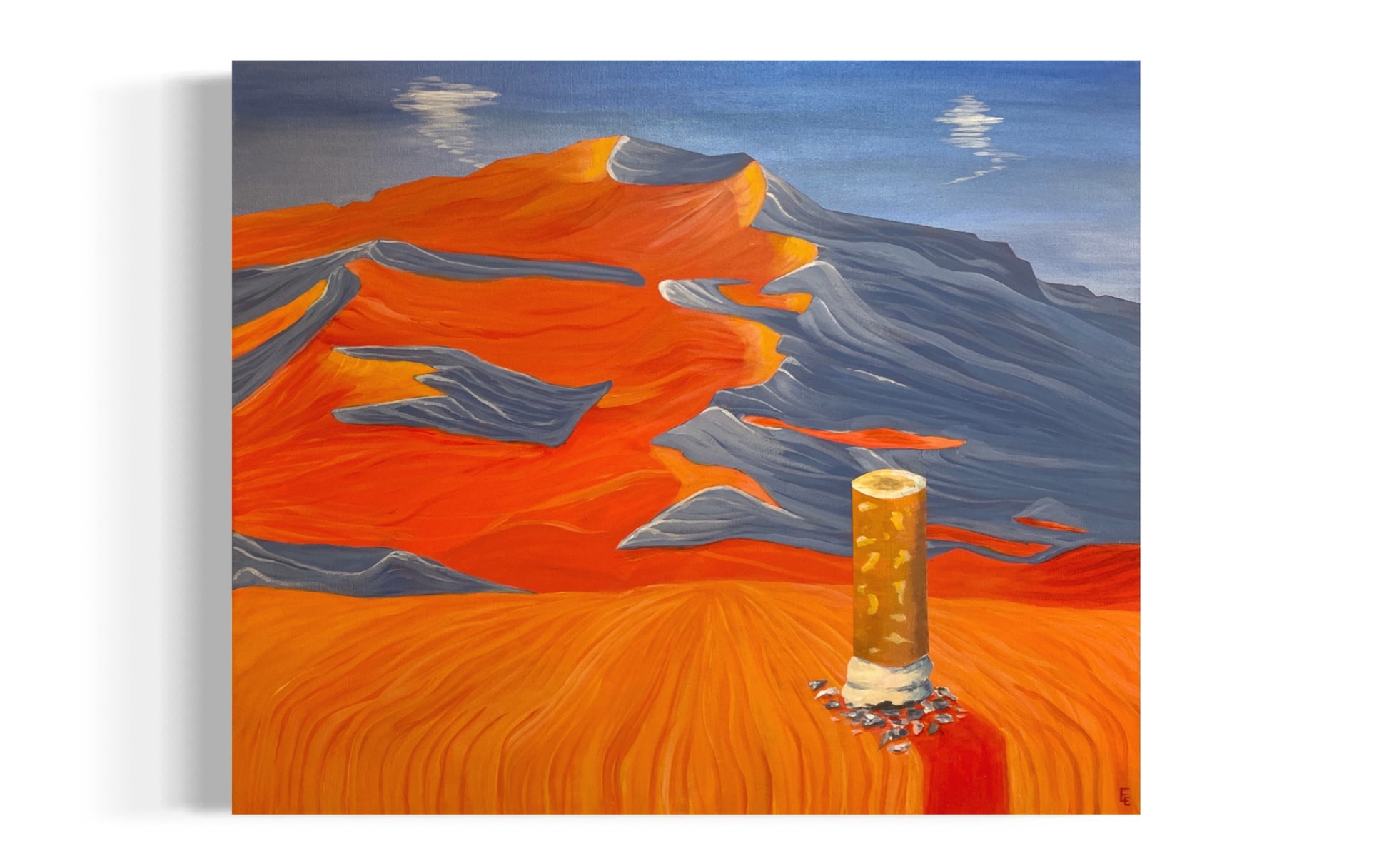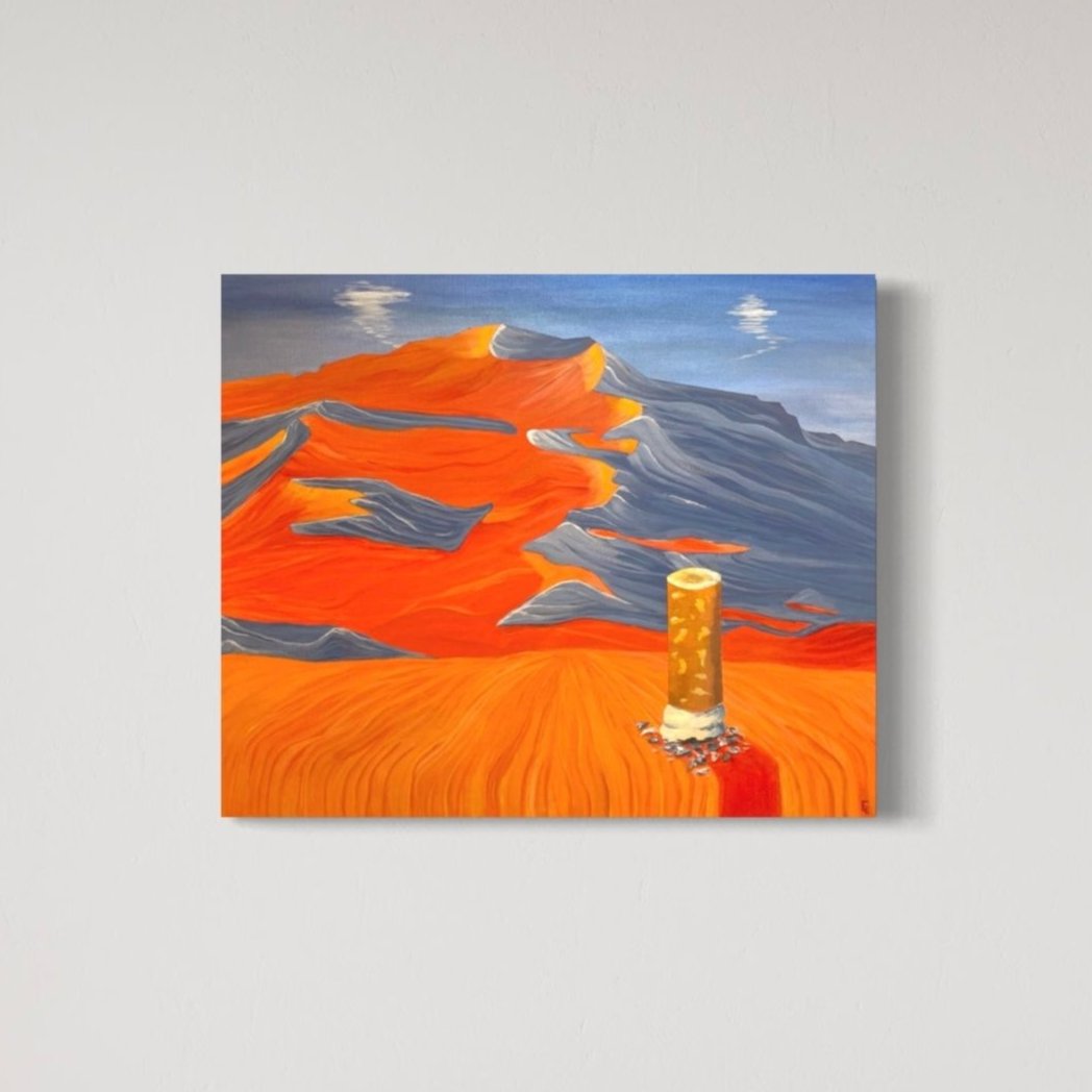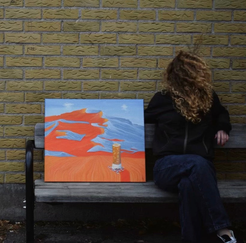 En uttrycksfull, färgstark och surrealistisk målning av en cigarett framför ett bergslandskap. Elvira Elliots konstverk "Cool People Smoke" är lekfullt och stilrent, och är perfekt för att göra din heminredning mer unik och personlig.