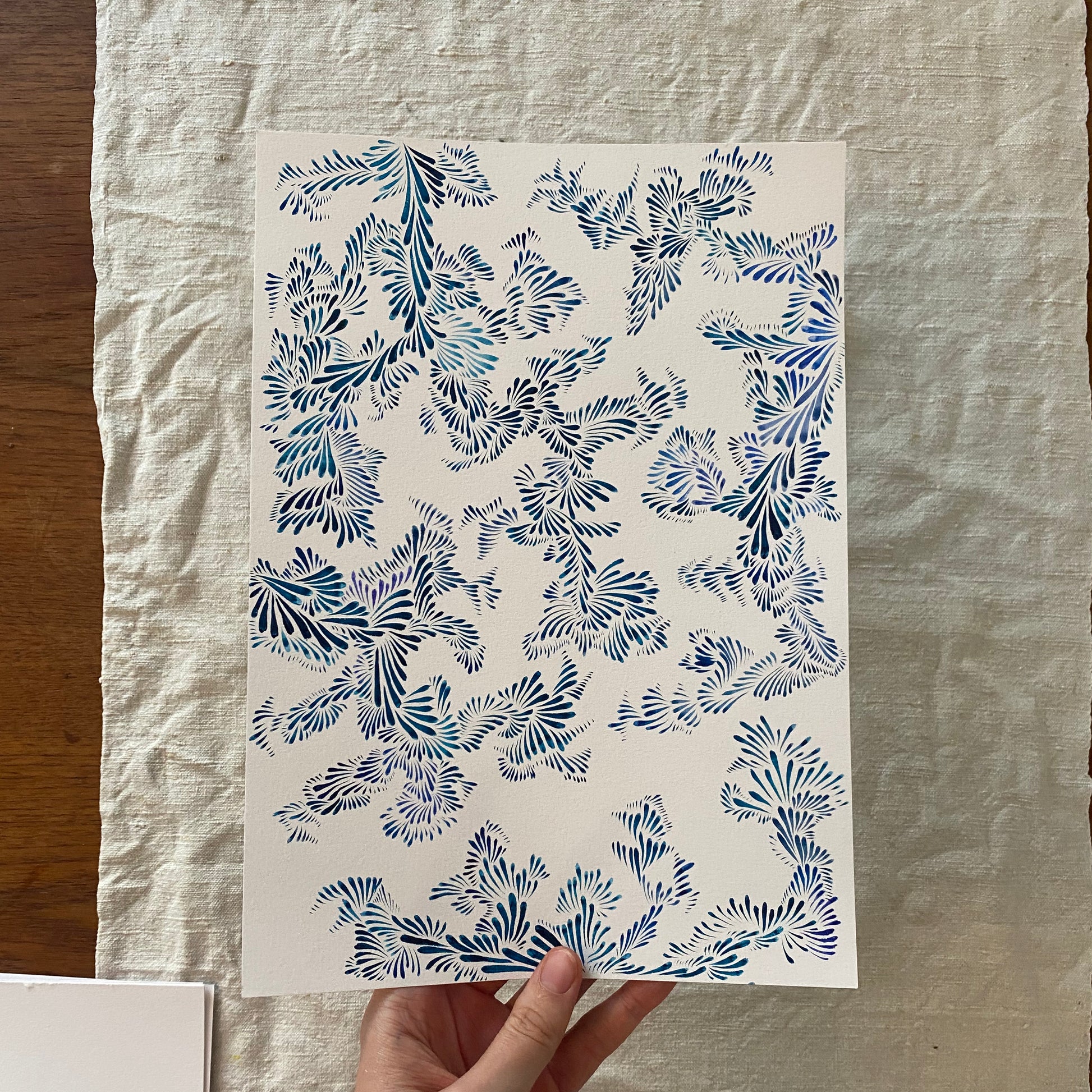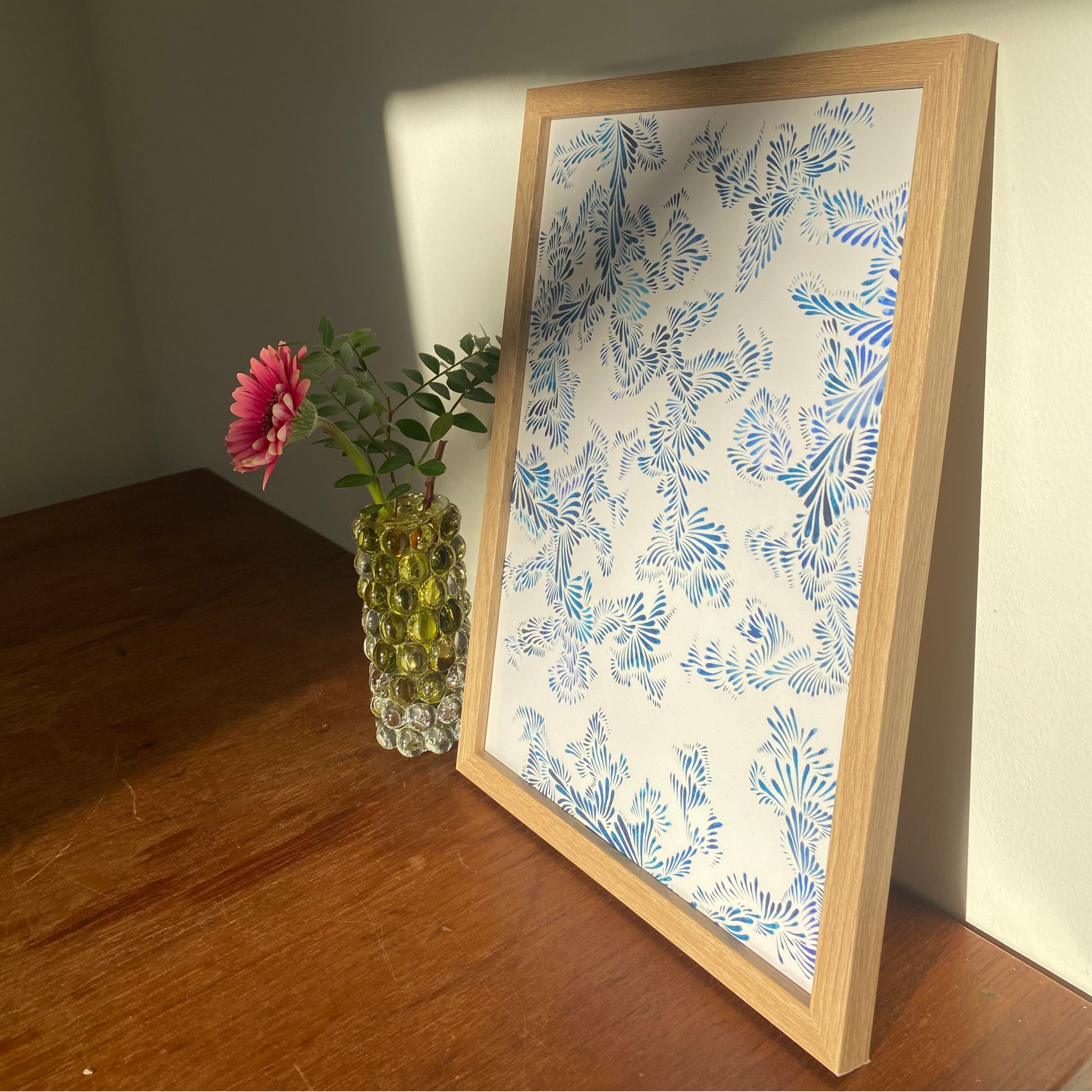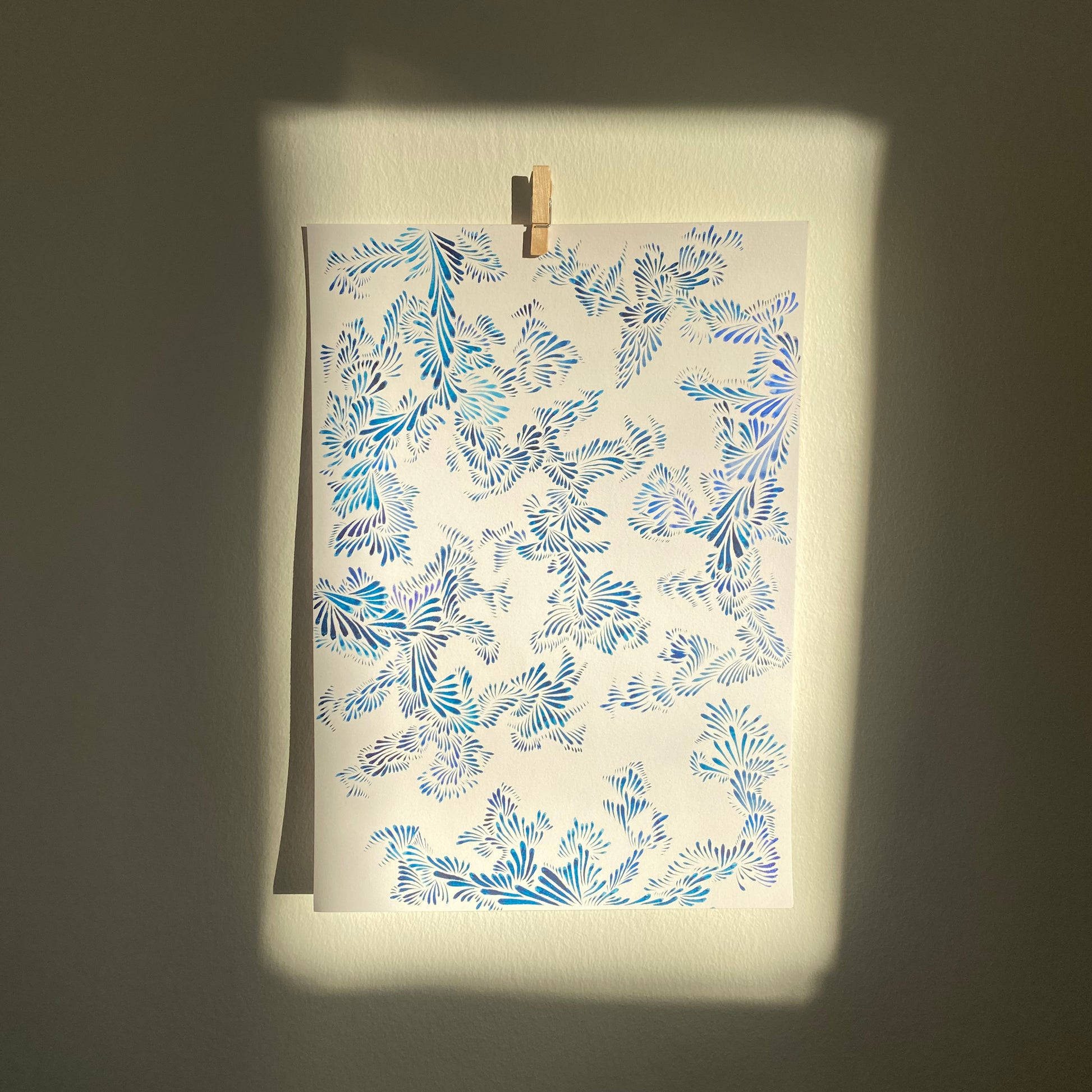 Dagdrömmar är en blå akvarellmålning av Nova Lindberg. Sätt färg på dina väggar med detta lekfulla och färgglada mönster!