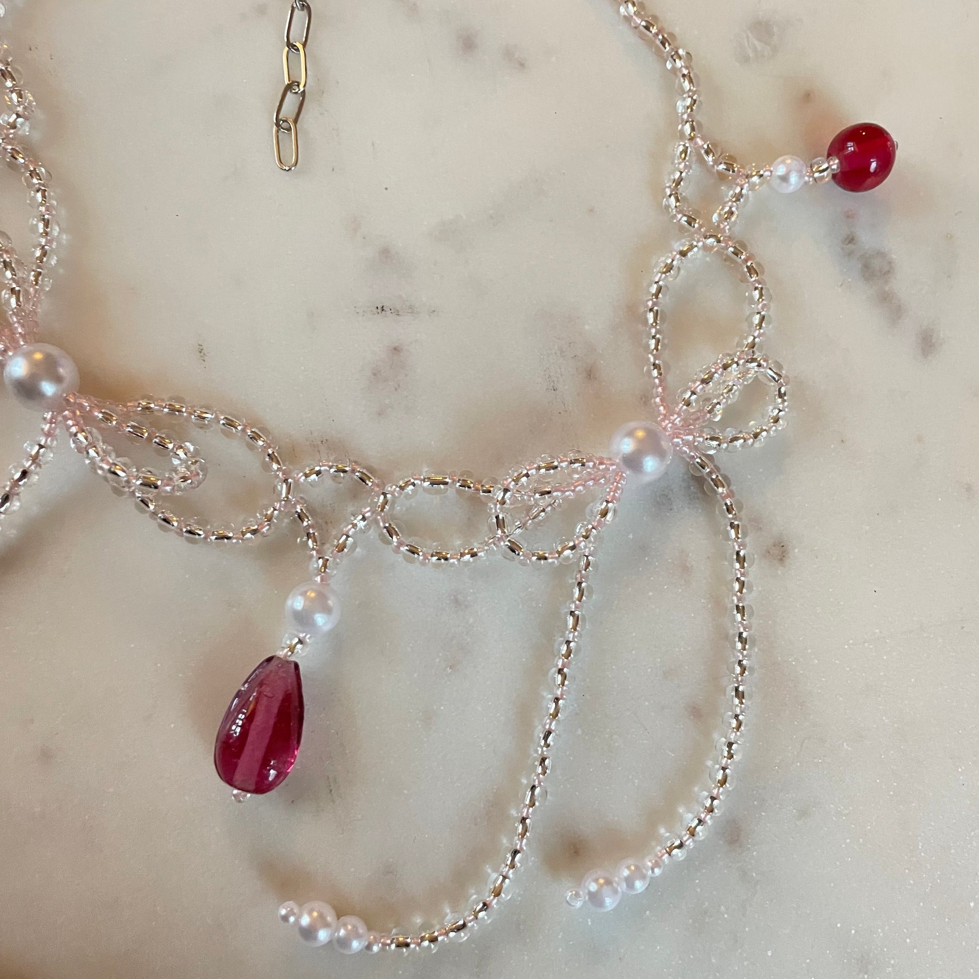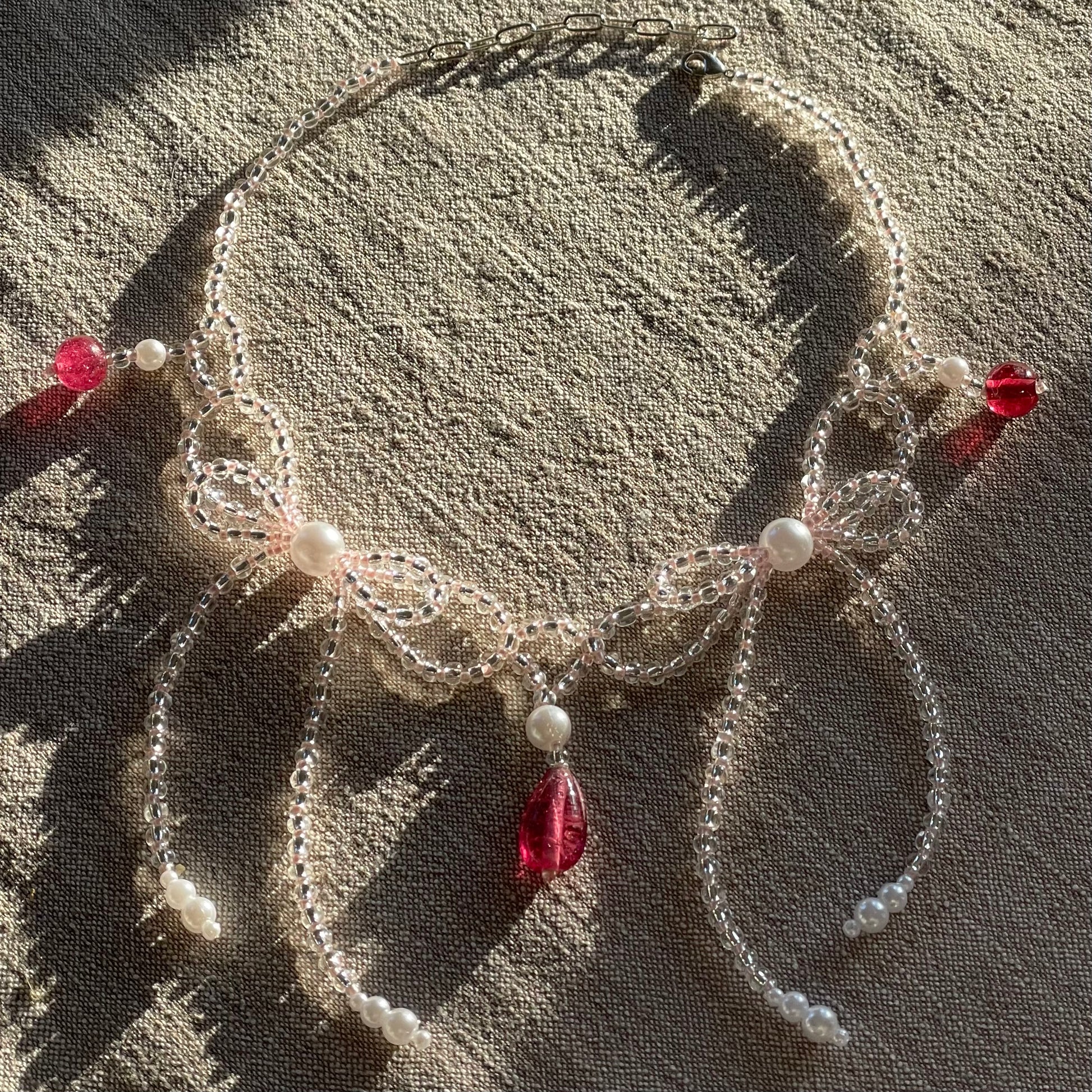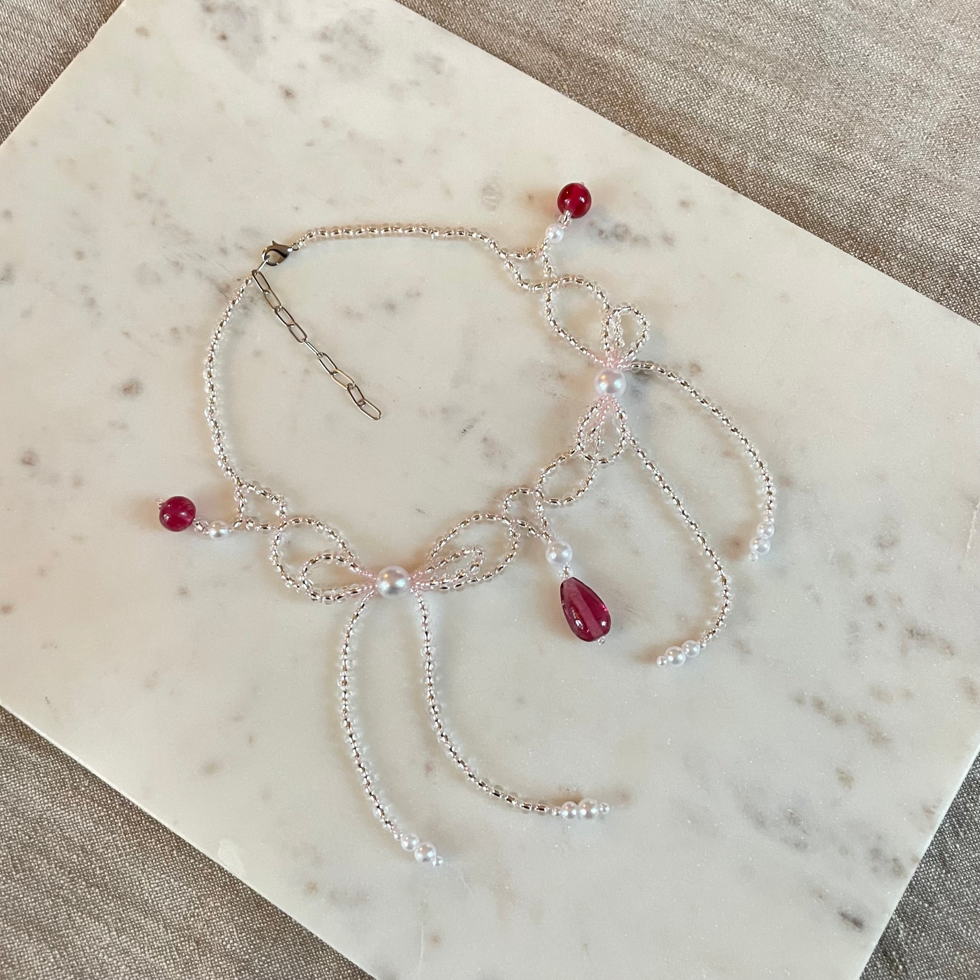 "The bow necklace" är ett pärlhalsband gjort av handplockade, högkvalitativa glaspärlor. Pärlandet är en kreativ process, vilket innebär att varje halsband får sin egen karaktär och att ett halsband sällan återskapas.