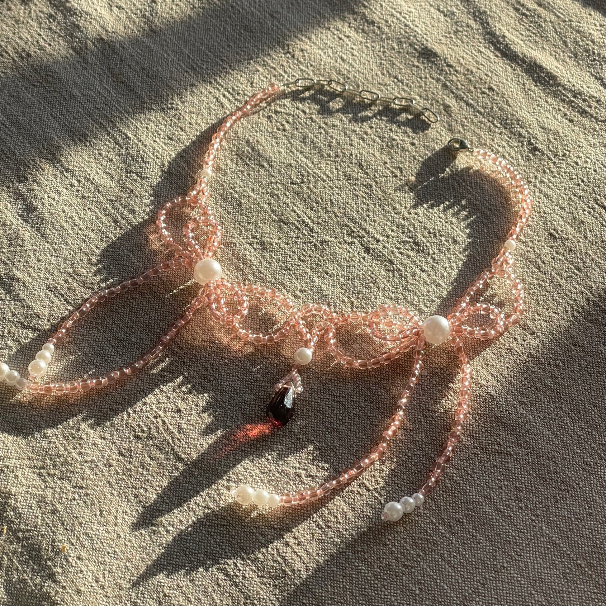 "The bow necklace" är ett pärlhalsband gjort av handplockade, högkvalitativa glaspärlor. Pärlandet är en kreativ process, vilket innebär att varje halsband får sin egen karaktär och att ett halsband sällan återskapas.