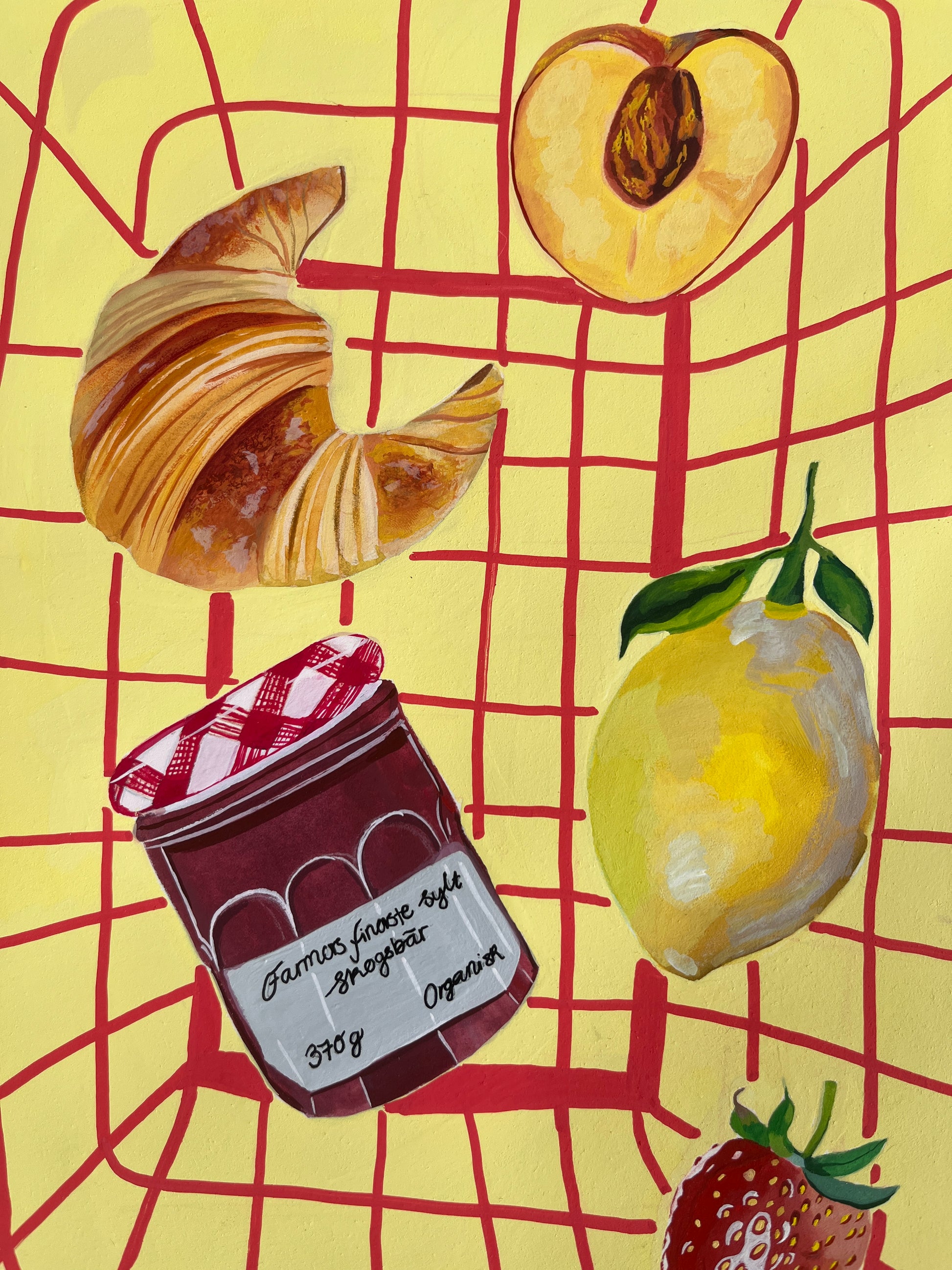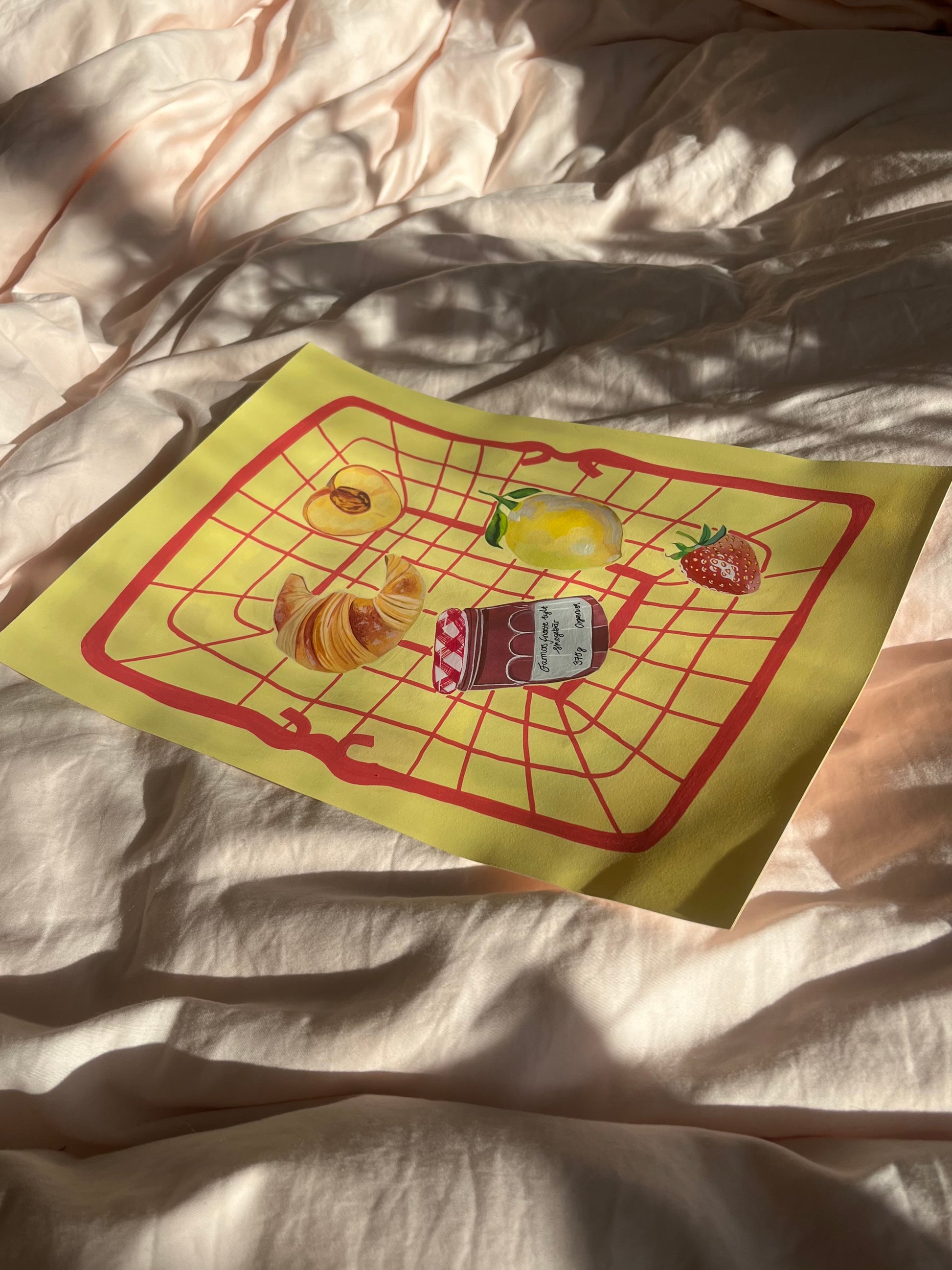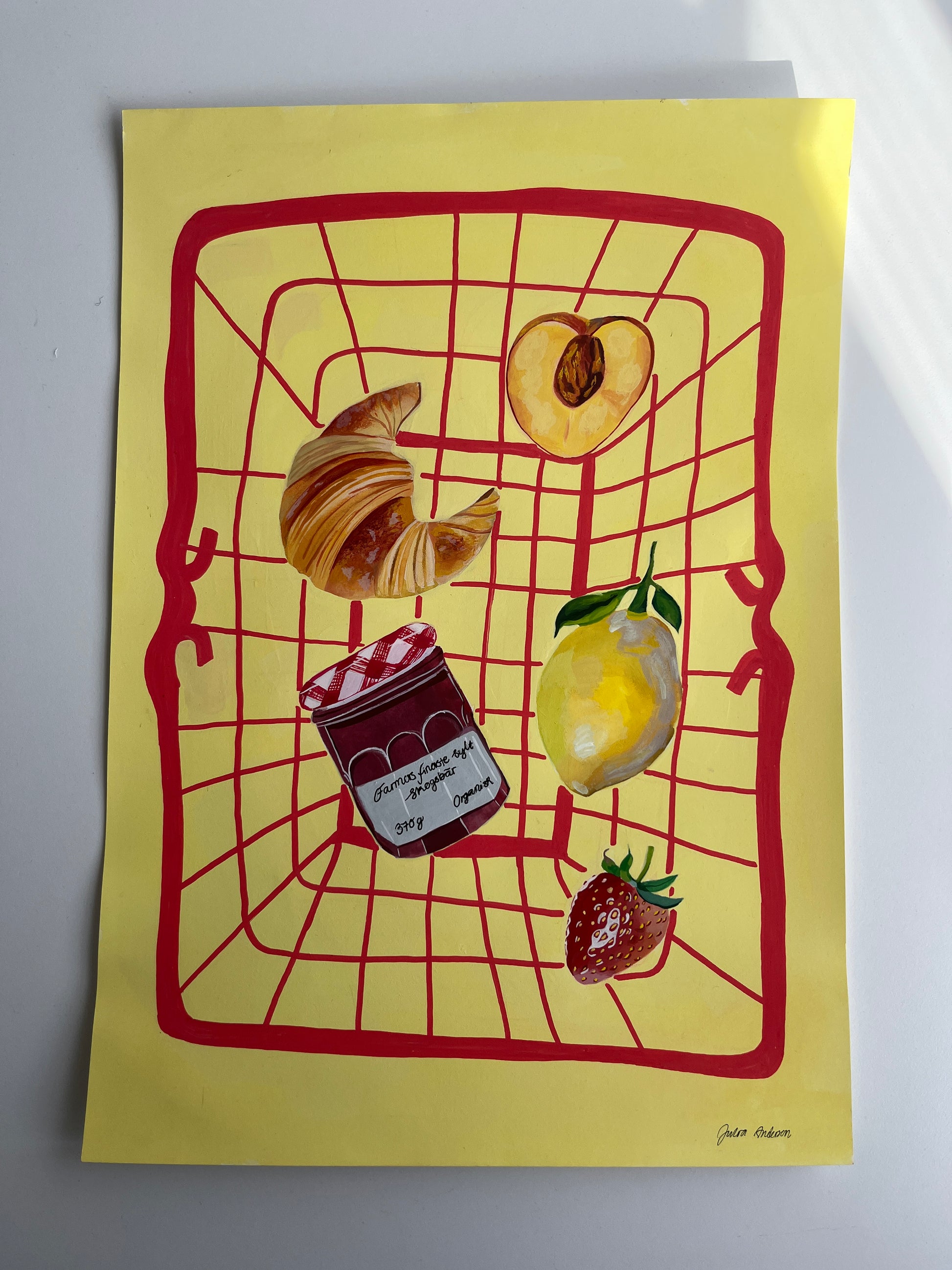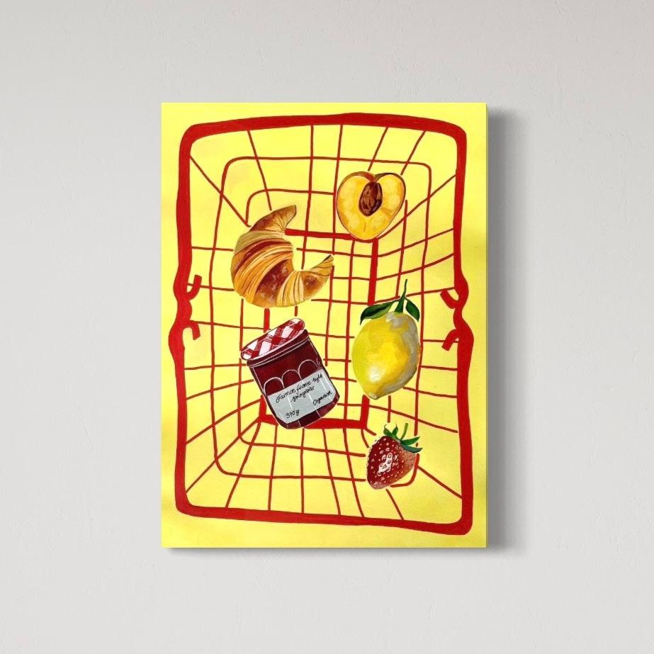 Detta färgglada konstverk av Julia Andersen, som föreställer en korg med olika frukter och livsmedel, gör ditt vardagsrum mer glädjefullt och unikt! Det är en unik tavla som är perfekt för det skandinaviska hemmet.
