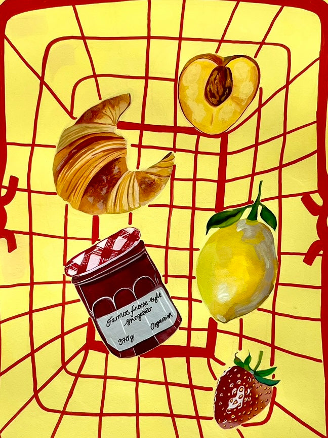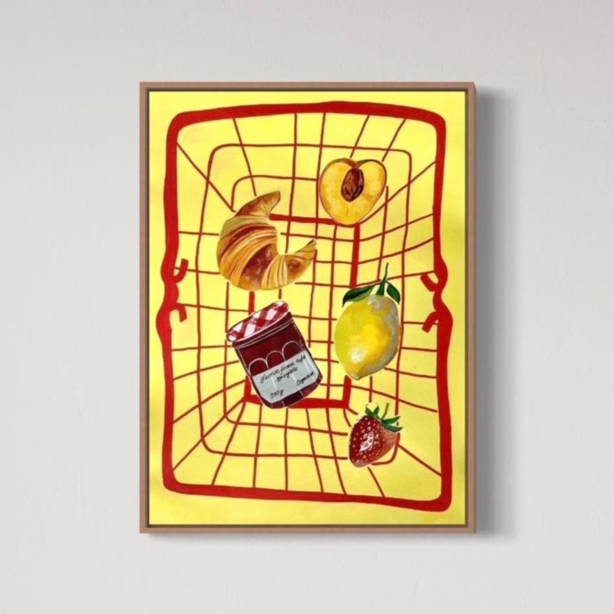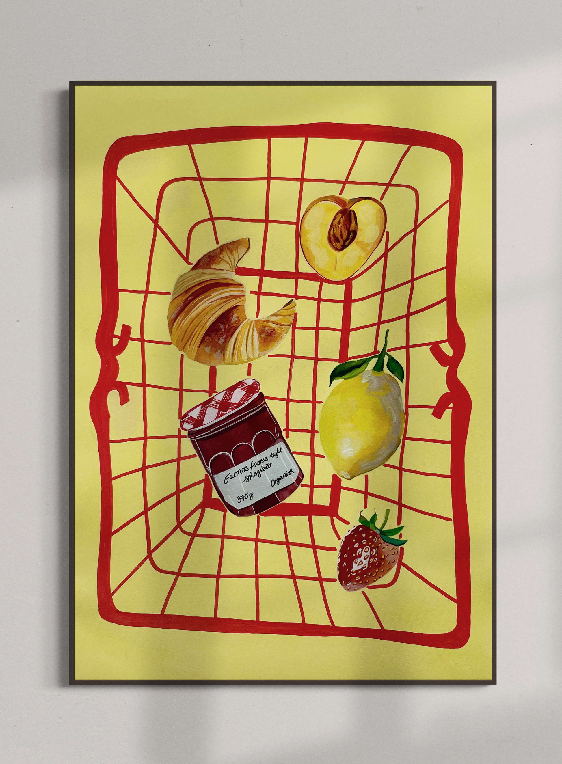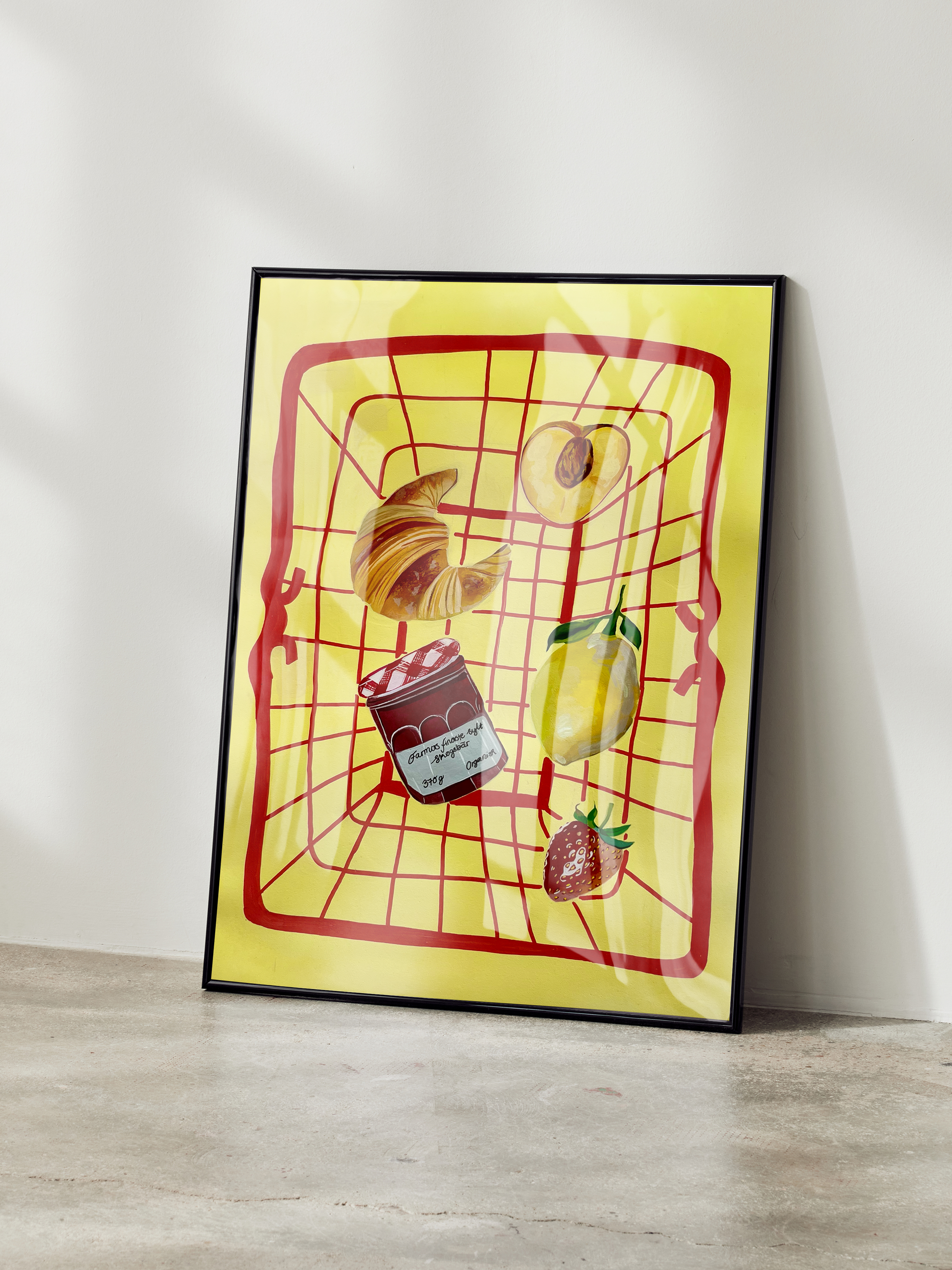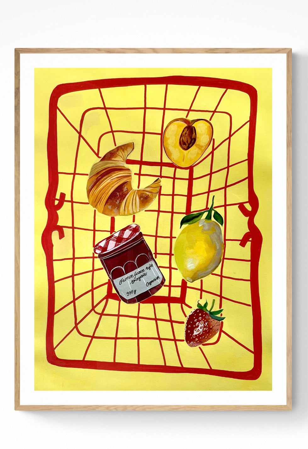 Detta färgglada konstverk av Julia Andersen, som föreställer en korg med olika frukter och livsmedel, gör ditt vardagsrum mer glädjefullt och unikt! En affisch som är perfekt för hemmet i skandinavisk stil.