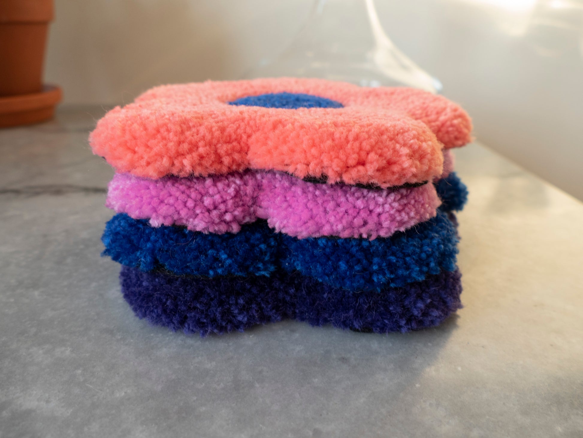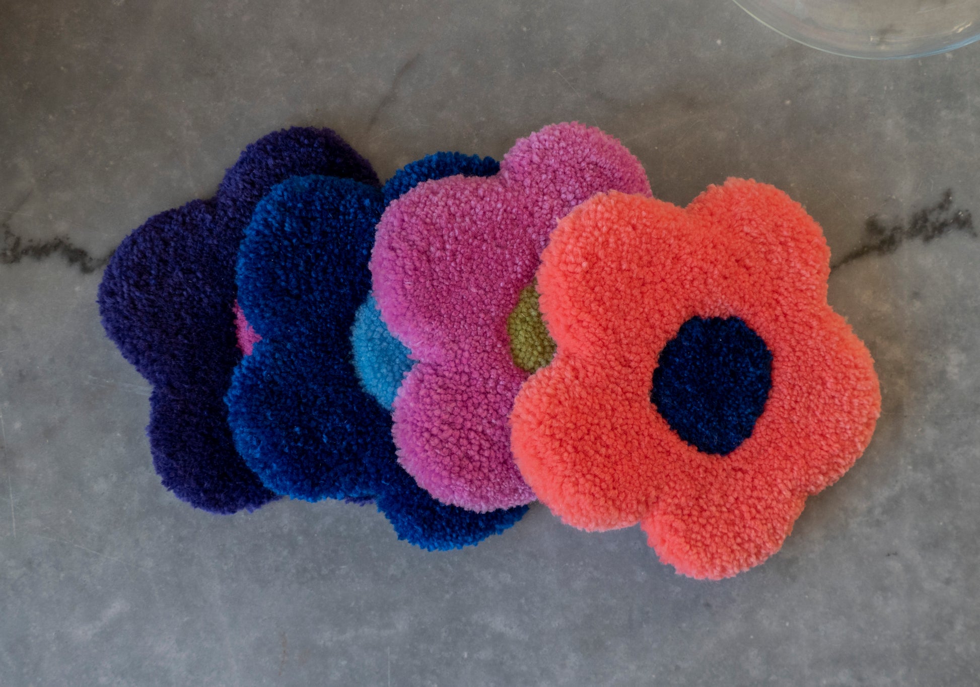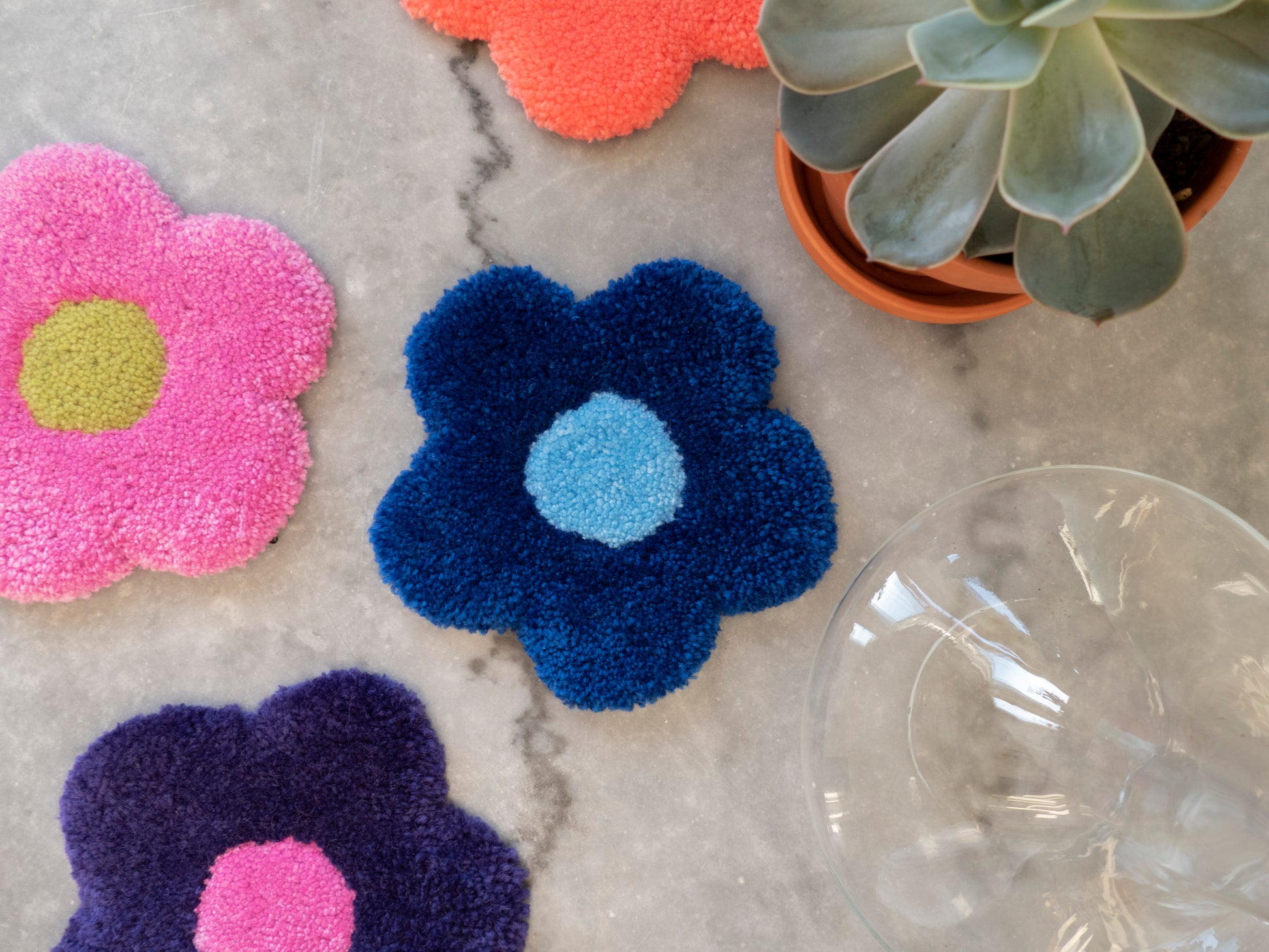 Ett unikt glasunderlägg i form av en blomma av designern Estera Studio. Denna design är gjord med 100 % akrylgarn i Monks tyg, bakad med fiberlim och akrylfilt. Perfekt för att lägga till mer färg och personlighet till ditt hem, samtidigt som du undviker märken på ditt bord.